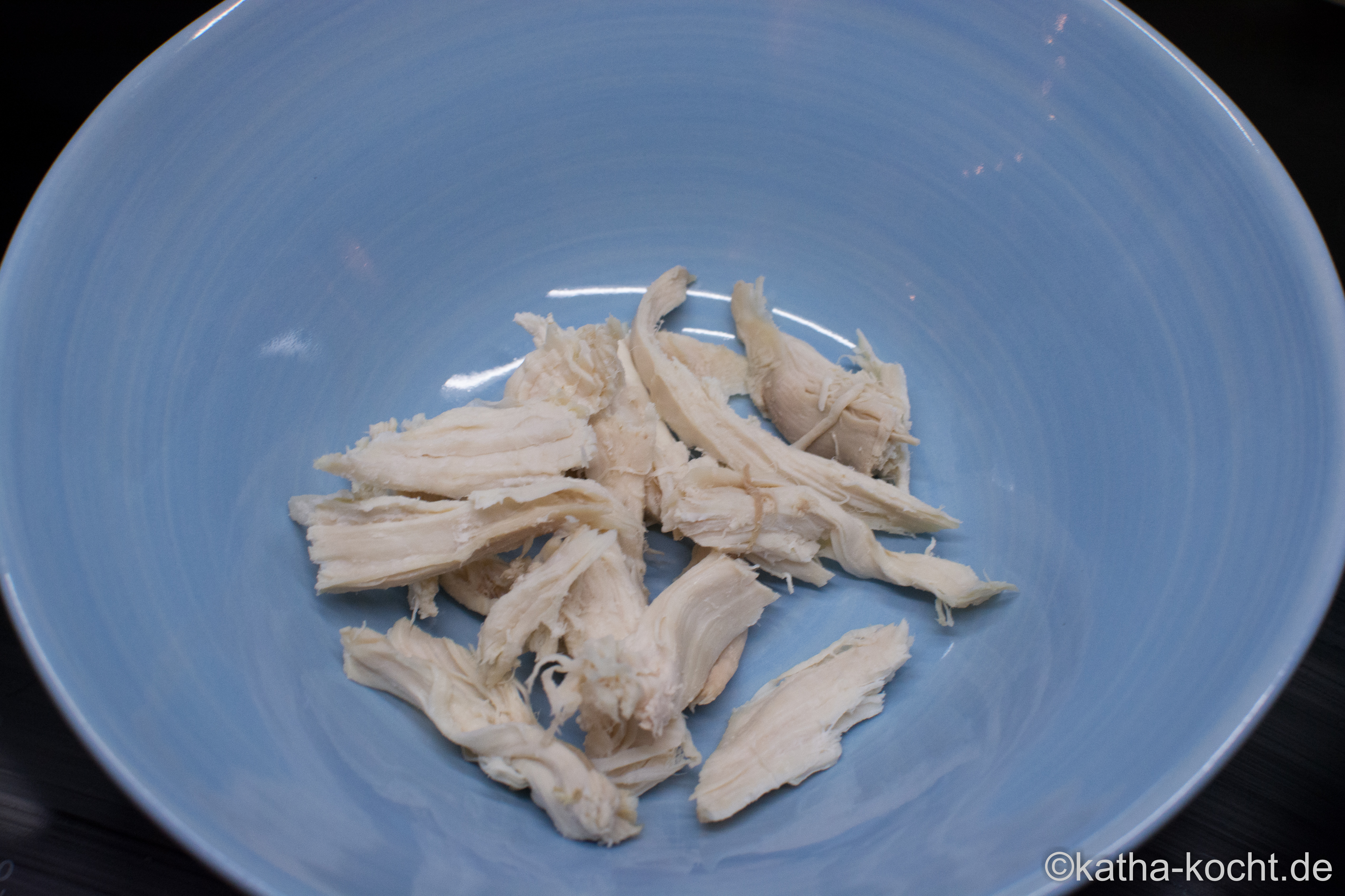 Das klein gezupfte Hühnerfleisch auf die Teller verteilen…