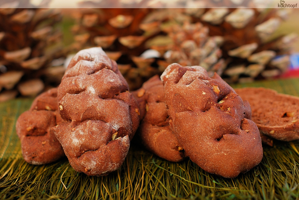 Zorra from 1x umrühren bitte aka Kochtopf sent me these great Dark brown cone buns with golden walnuts, that looks like pine cones.