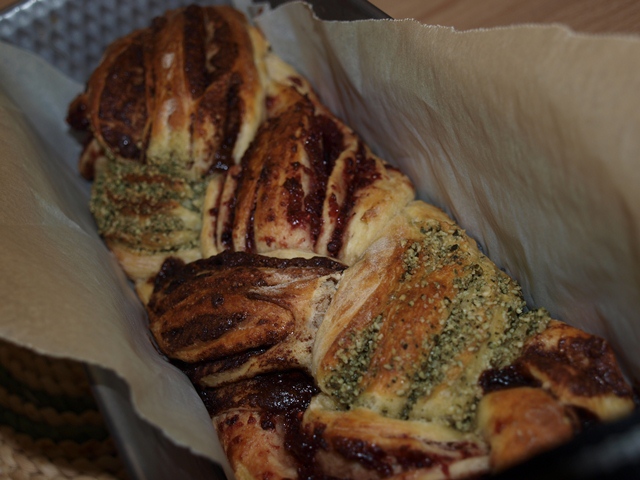 I baked some coloured pizza buns with olives and pickled tomatoes.