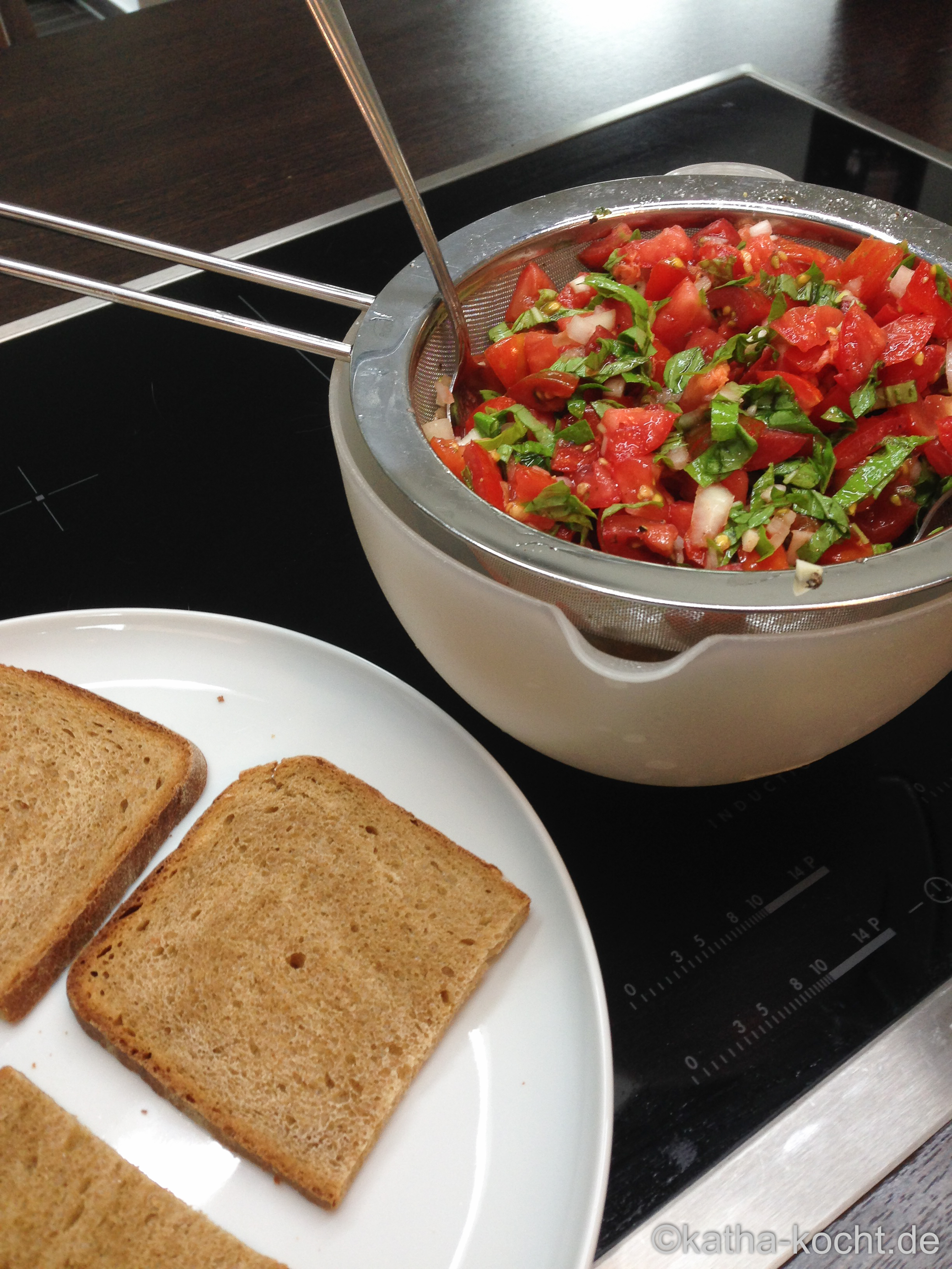 Die Tomaten in Würfel schneiden und in ein feines Sieb geben. Jetzt kräftig salzen und auf ein Schüsselchen stellen. In den nächsten 10-15 Minuten immer wieder vorsichtig umrühren. Das Salz entzieht den Tomaten jetzt jede Menge überschüssiges Wasser. Dadurch wird der Geschmack intensiver und (was noch wichtiger ist) sie weichen das Brot nicht auf!
