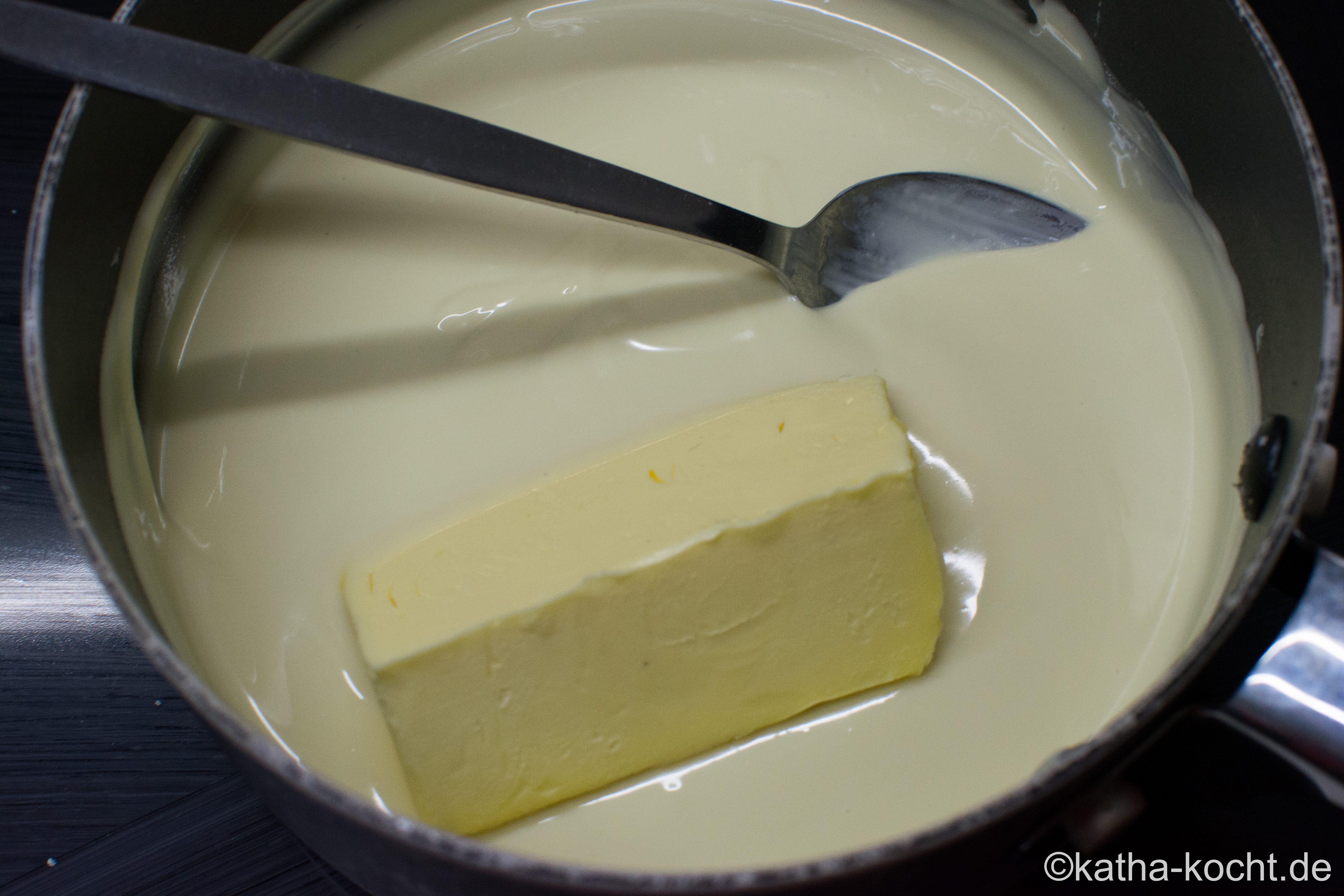 Die in Stücken gebrochene Kuvertüre bei kleinster Hitze in einem kleinen Topf schmelzen. Die Butter und den Eierlikör dazu geben…