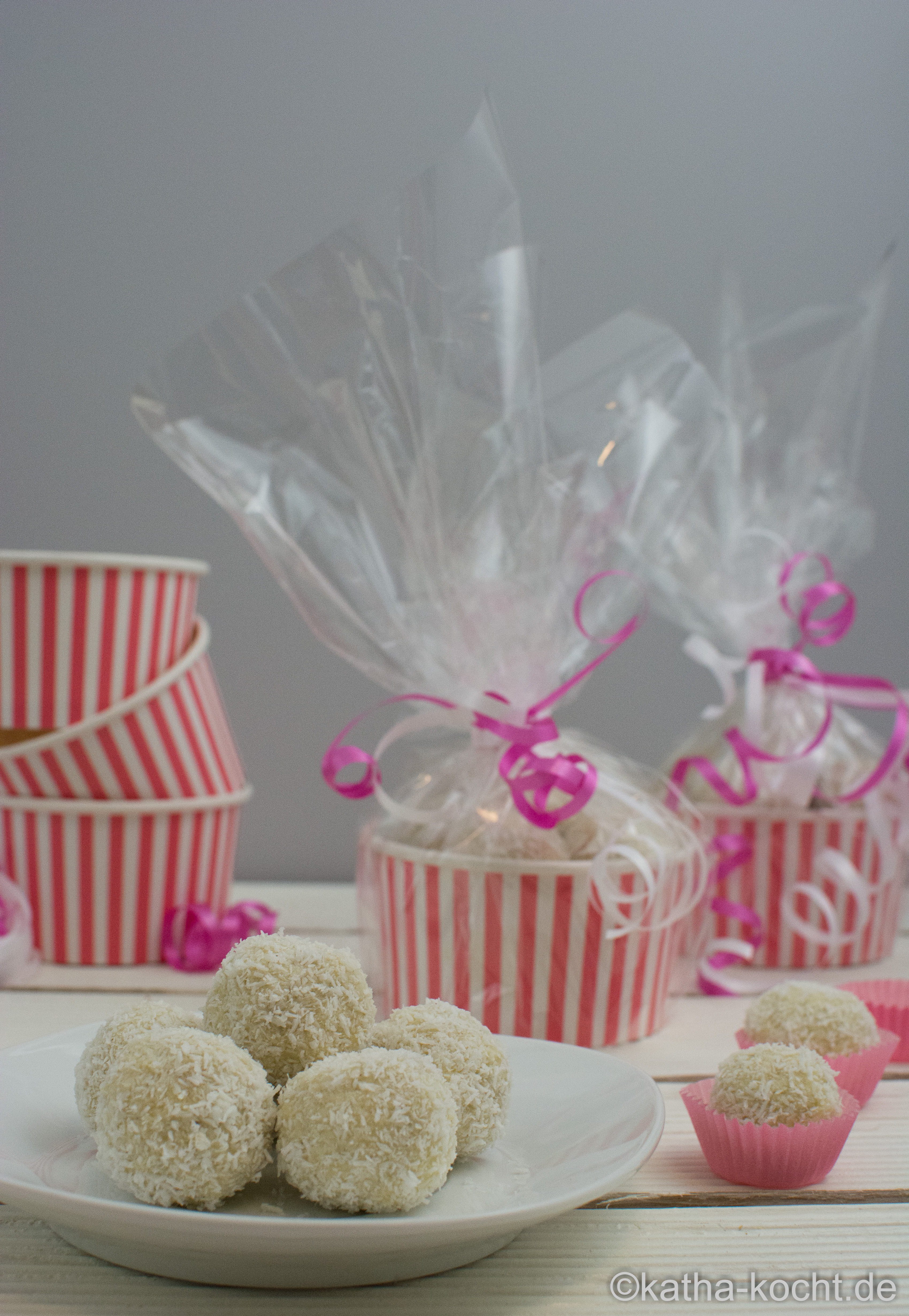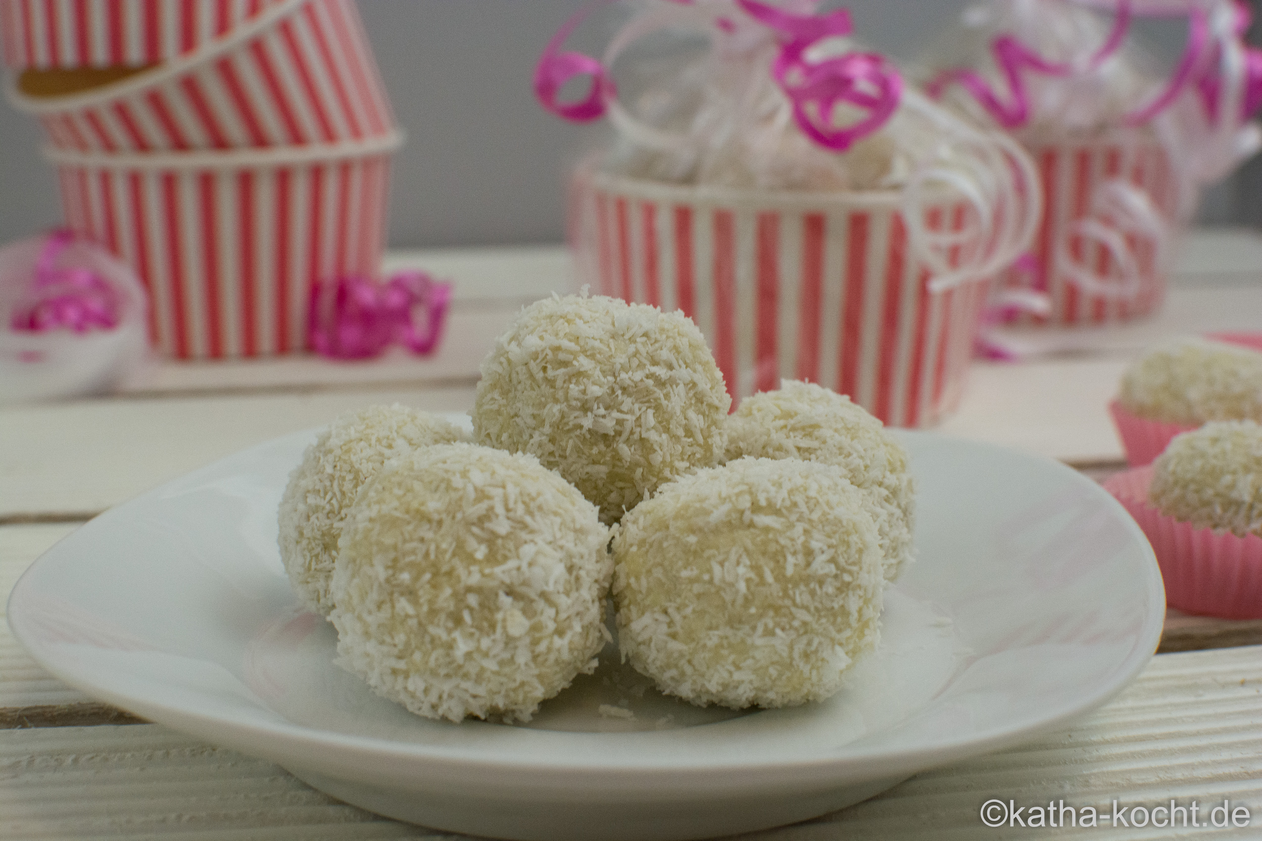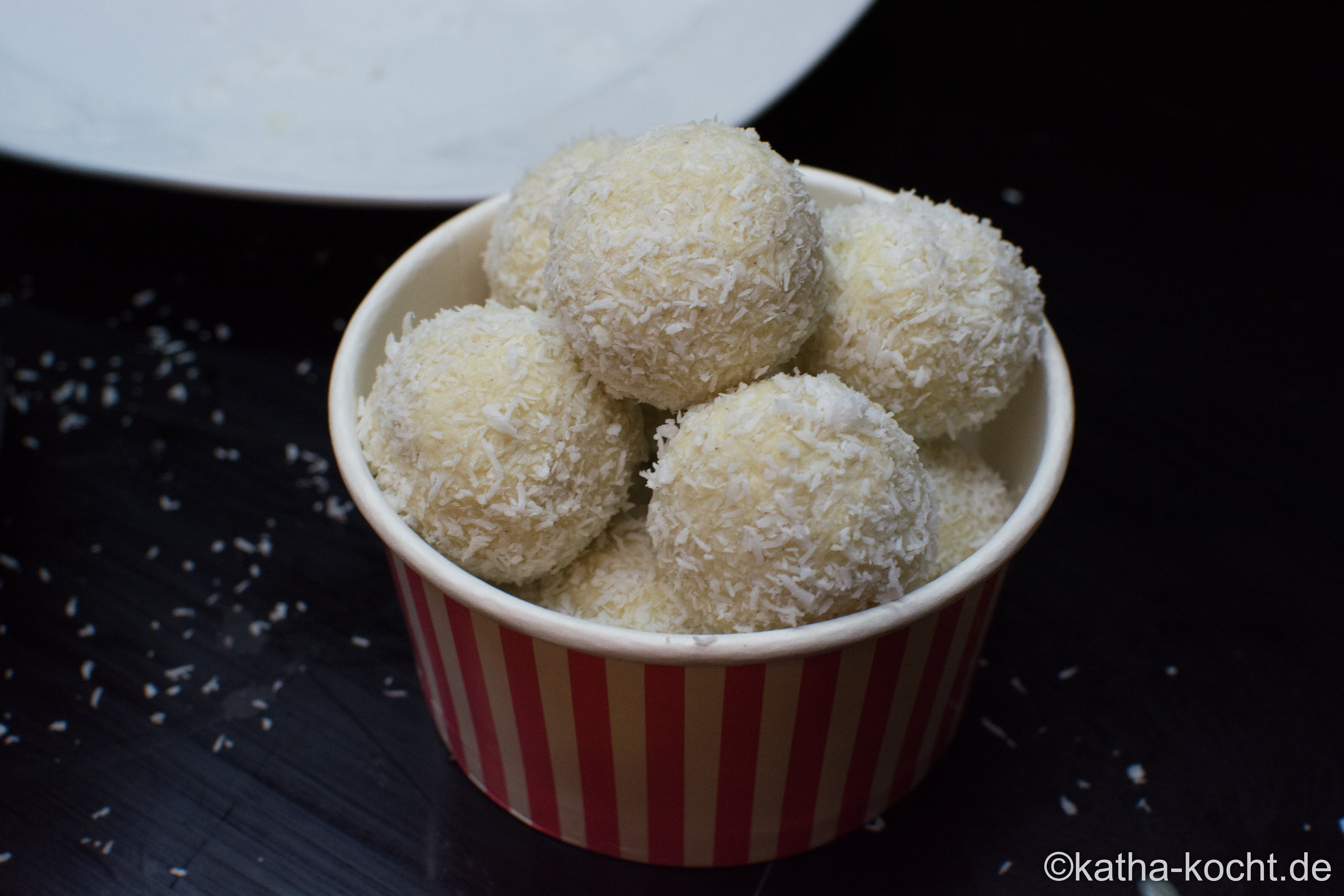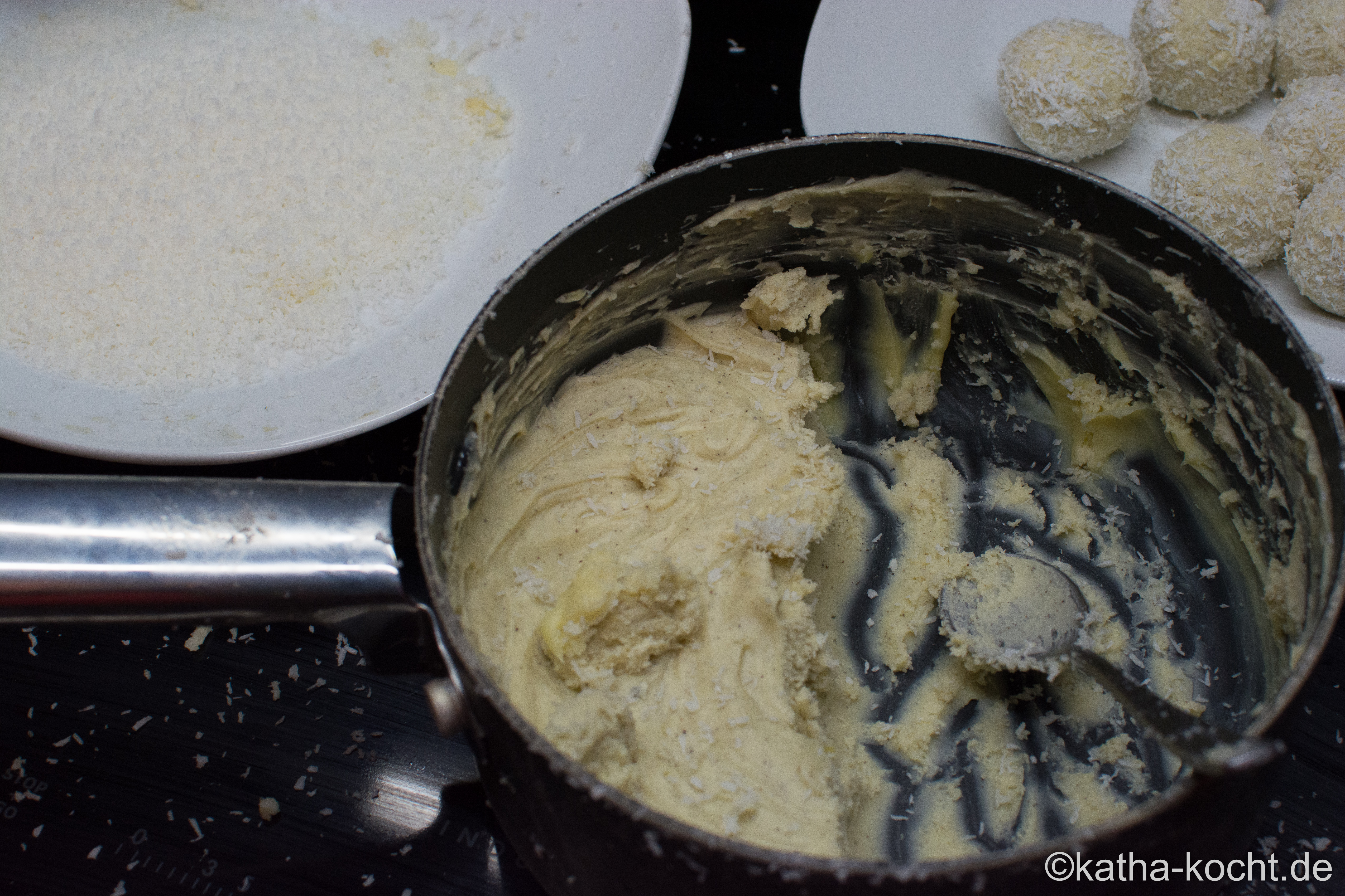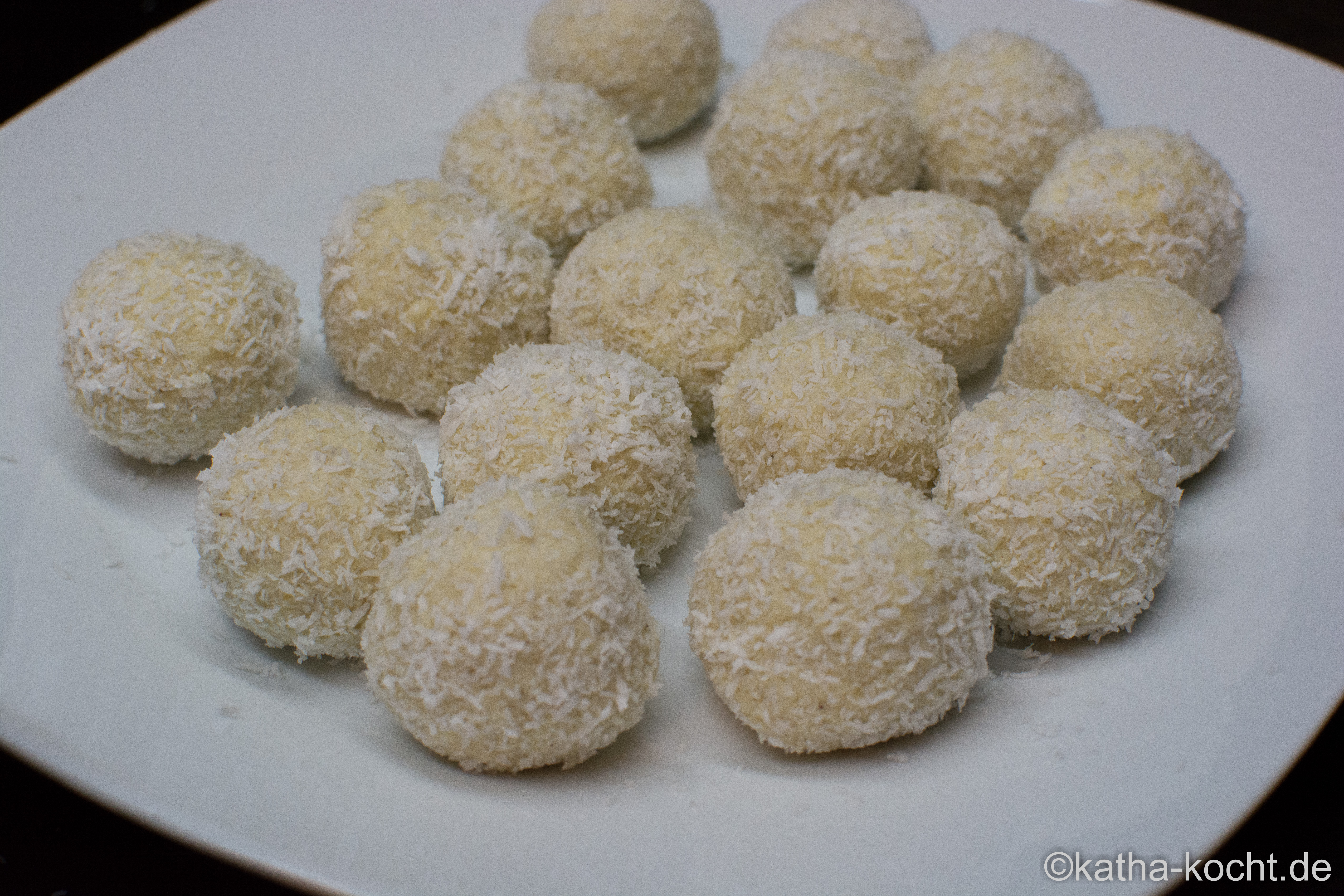 Die Masse ist jetzt ziemlich fest – mit einem Teelöffel etwas Masse abstechen, ca. eine Walnussgroße Menge, und mit den Händen rund formen. Die Kokosraspeln in einen tiefen Teller geben und die Kugeln darin rollen. Noch einmal rund rollen und wieder in den Kokosrapseln rollen. Vorsichtig auf einen Teller setzen.