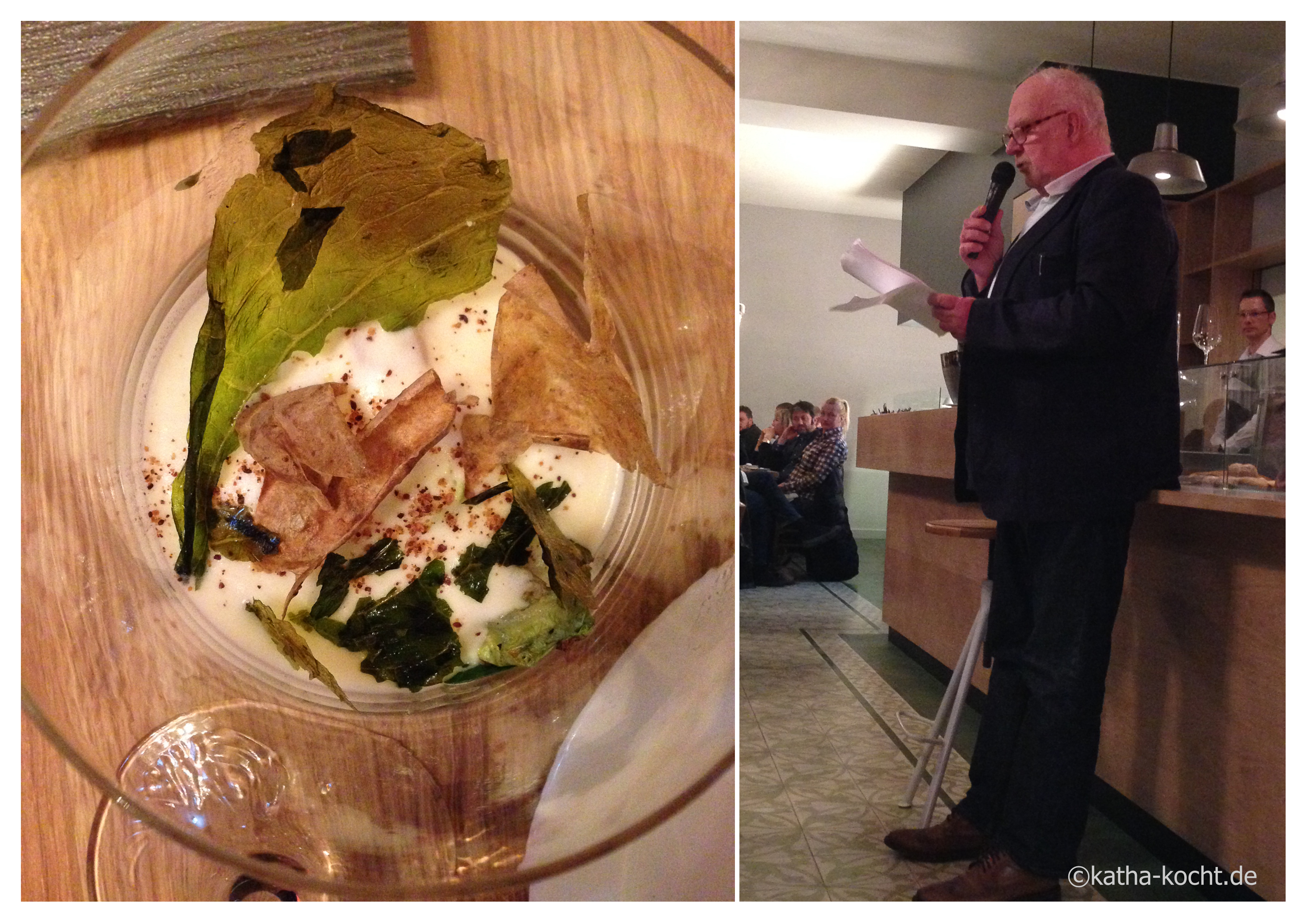 Küchenchef Martin Harder und sein Team haben als ersten Gang eine moderne Variante von Kartoffeln mit Quark für uns gezaubert – Kartoffelespuma, Brunnenkresse und Römersalat-Chips. Ich hätte nie gedacht, dass mich die Kartoffel-Quark Kombi je so positiv überraschen könnte! Dazu gibt Rolf Kremming uns einen lebhaften Einblick in die lange Geschichte der Location und des Kiezes.