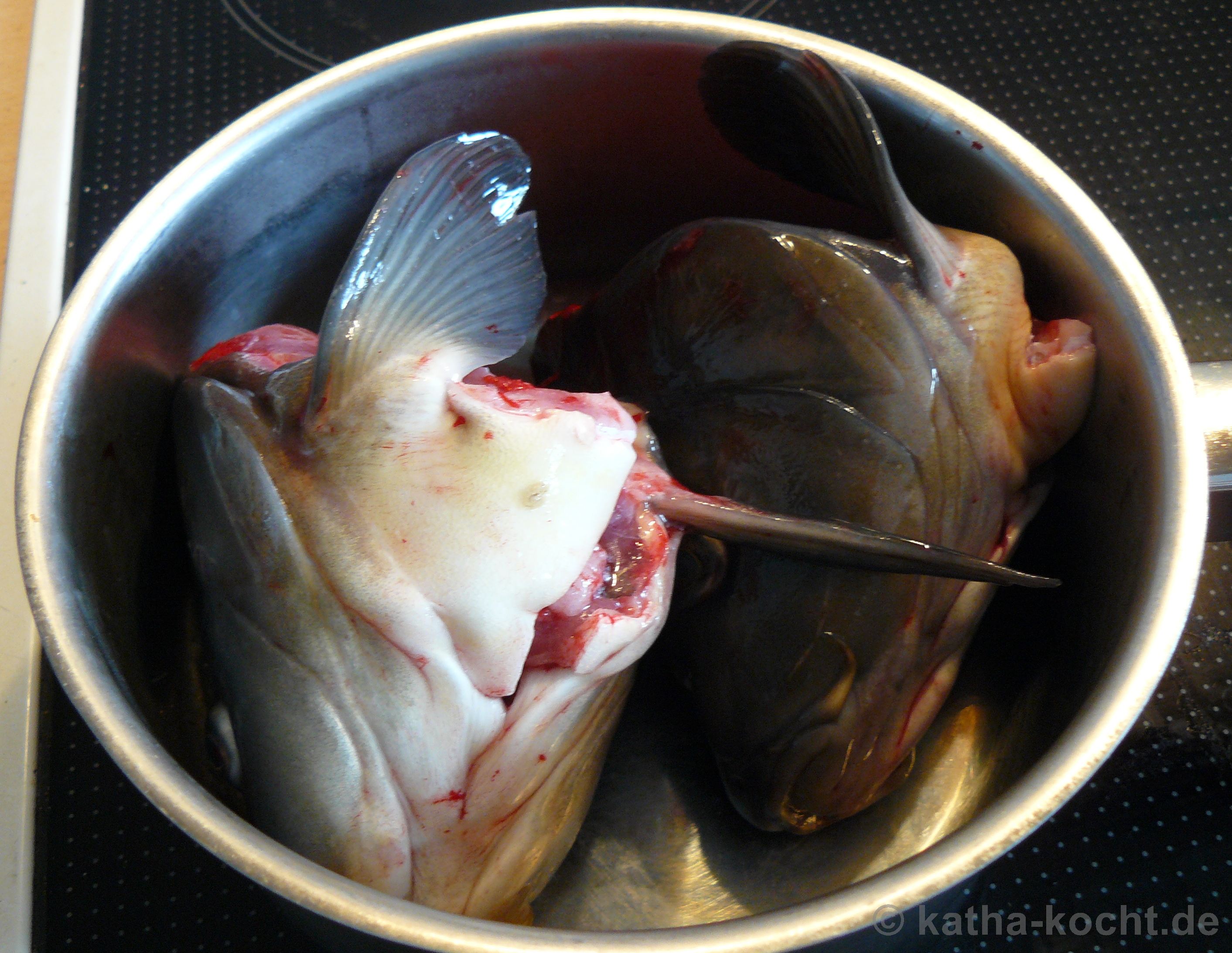 Ich gebe die Karpfenköpfe in einen Topf. Der ist definitiv zu klein.