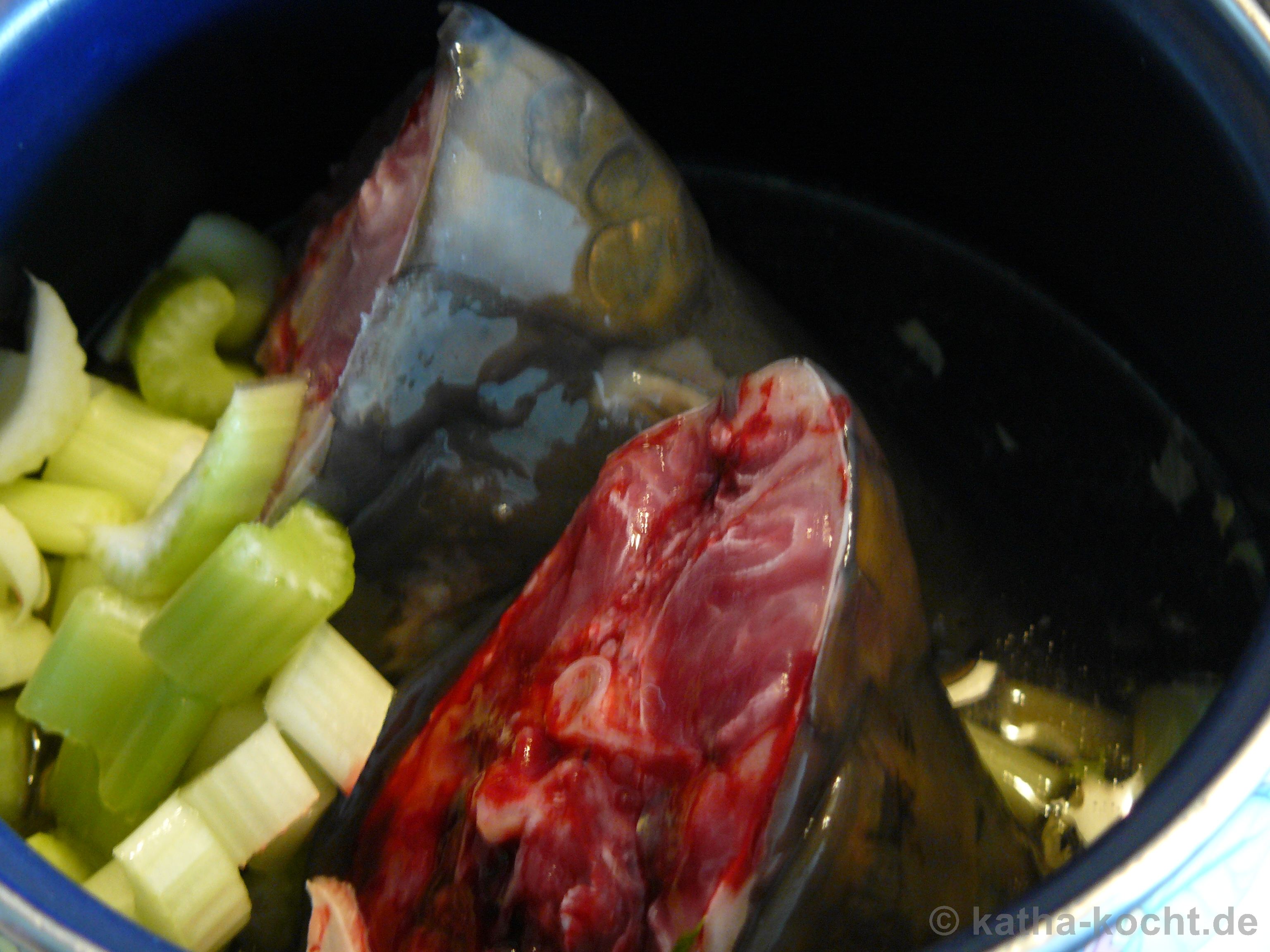 Fangen wir also von vorne an. Ich gebe die Karpfenköpfe in einen größeren Topf. Dazu kommen der in grobe Stücken geschnittene Staudensellerie und die geviertelte Zwiebel.