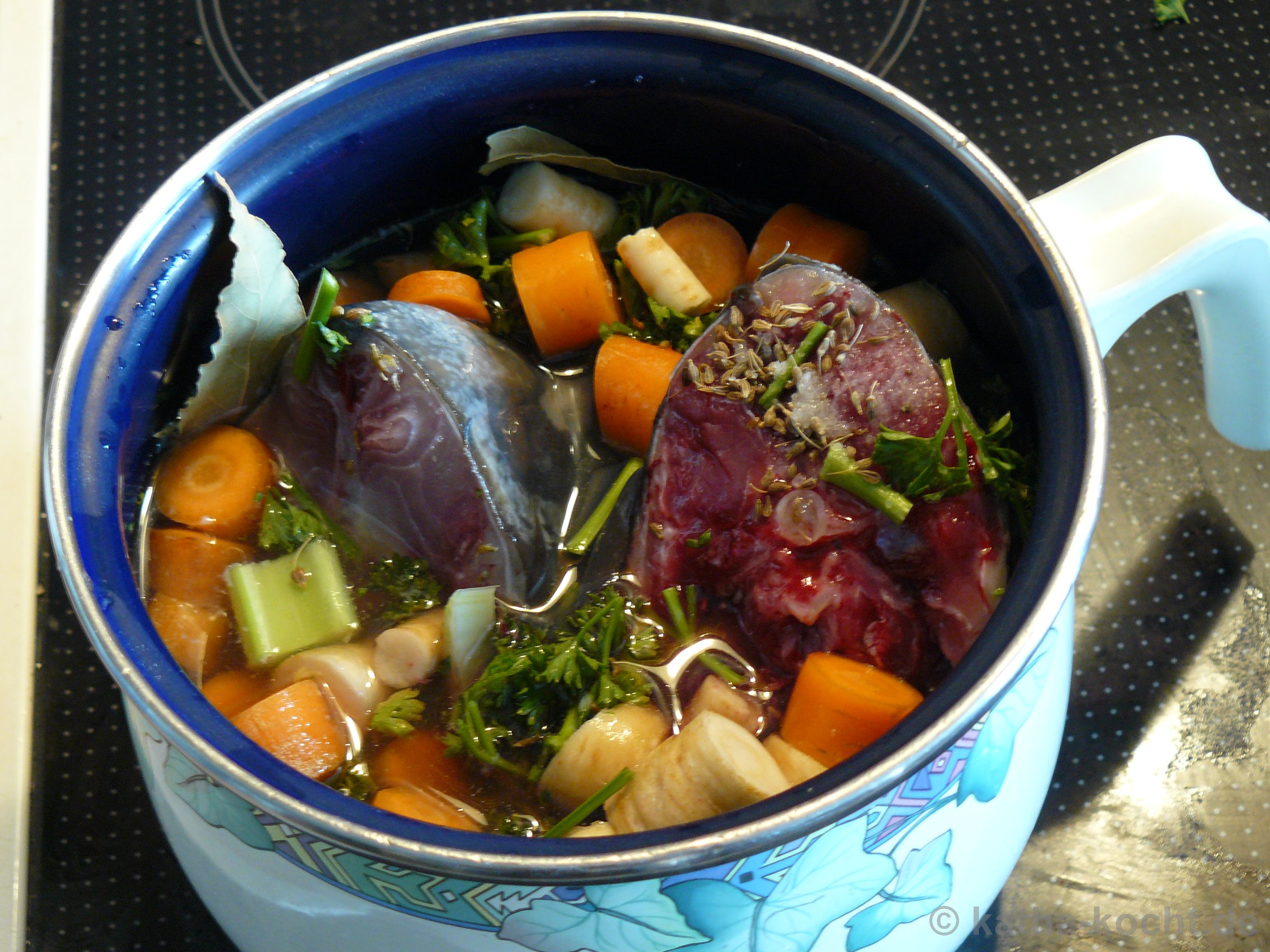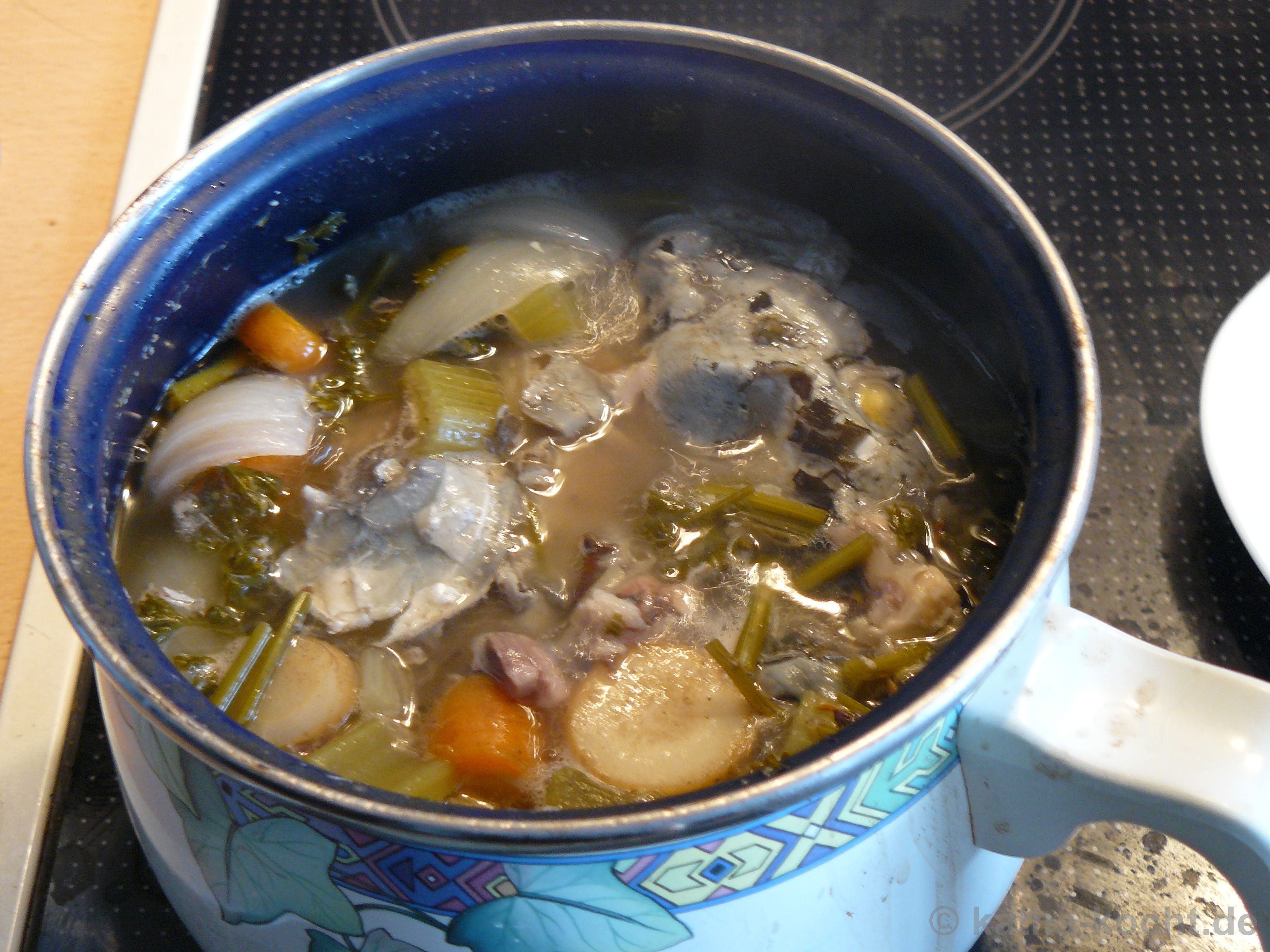 Wie hier bereits erwähnt habe ich mir die Karpfenköpfe von den zwei Weihnachtskarpfen extra einpacken lassen. Ich wollte mal wieder einen Fisch Fond kochen. Den habe ich zwar über die Feiertage nicht gebraucht, aber jetzt ist er eingefroren und wartet auf seinen Einsatz. Was man hat, das hat man! Die Gemüseeinlage basiert auf den Resten aus meinem Gemüsefach. So war der Kühlschrank auch gleich mal wieder aufgeräumt.