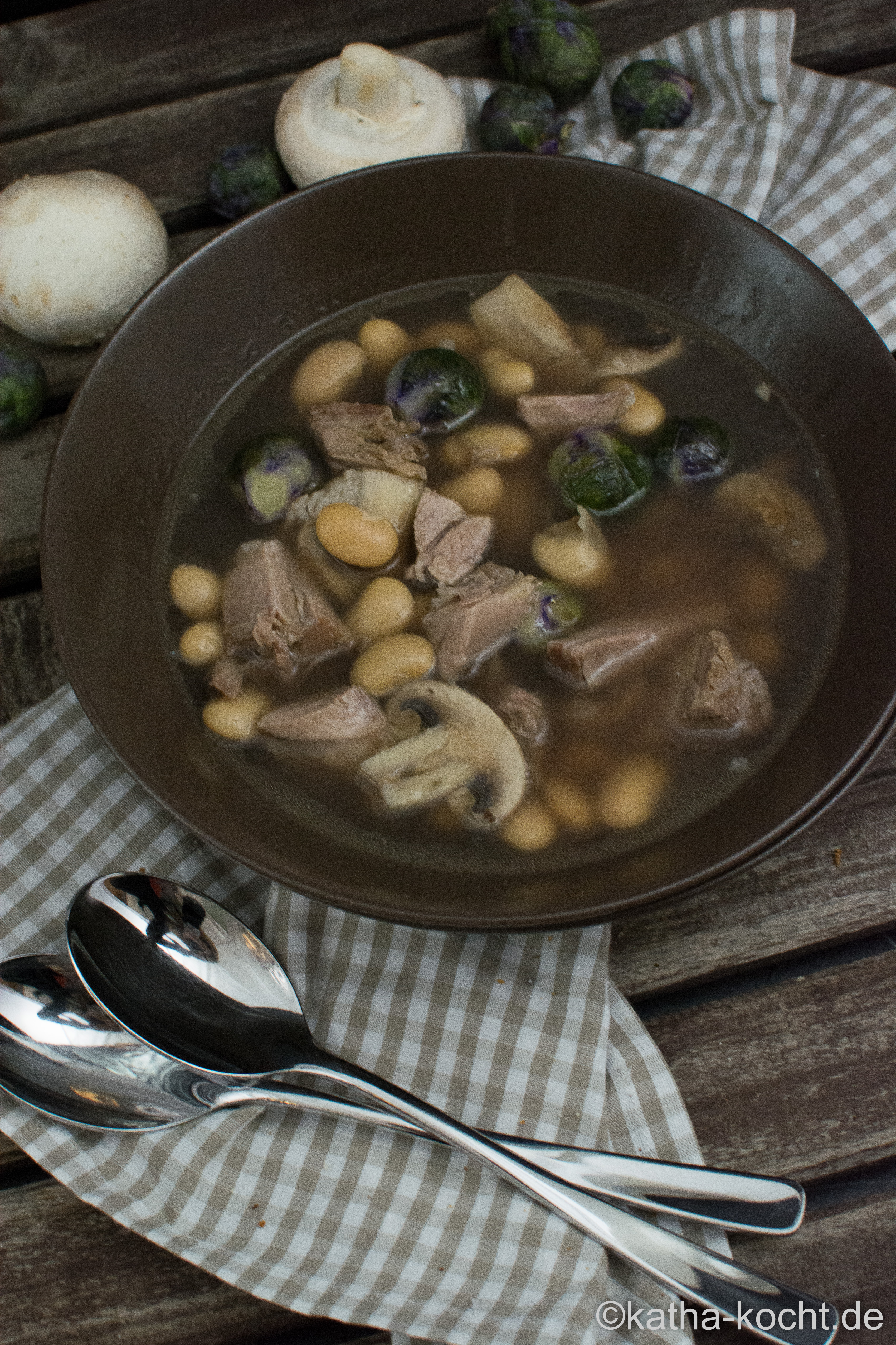 Die Bohnen, die halbierten Rosenkohlröschen und die geviertelten Champignons in die Suppe geben und 10 Minuten köcheln lassen bis der Rosenkohl gar ist. Das Fleisch vom Eisbein zupfen und mit in die Suppe geben. Alles mit Pfeffer, Salz und Zitronensaft abschmecken und die Suppe mit Eisbein und Bohnen auf tiefe Teller verteilen.