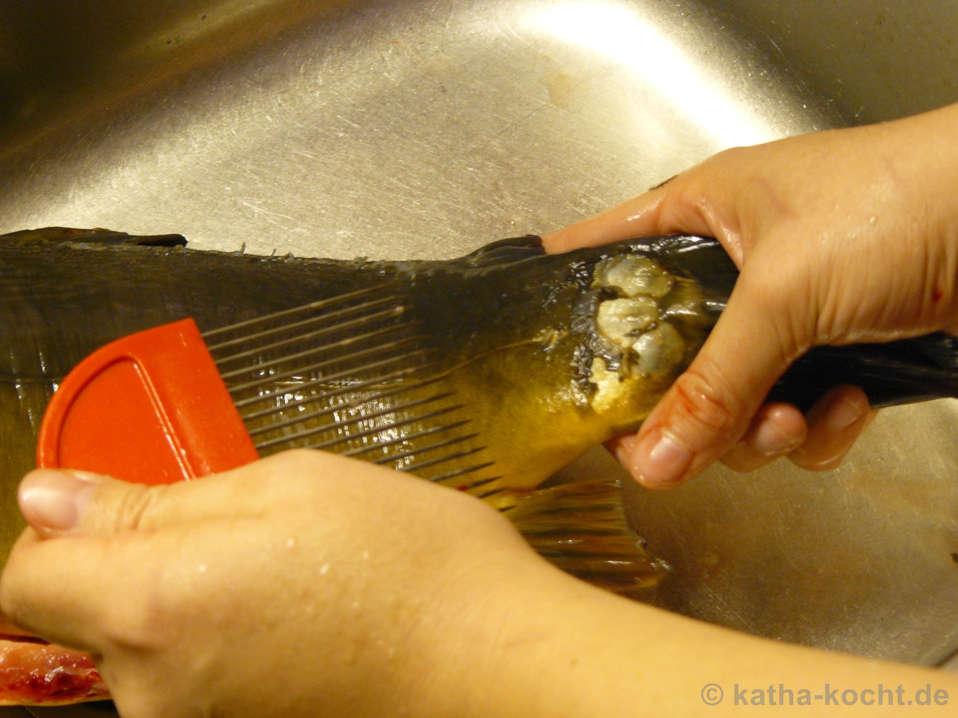 Ich war Team Karpfen, die Omi hat genaue Instruktionen geliefert. Zuerst wurde der Fisch geschuppt. Dazu habe ich mit einem kleinen „Schuppen-Kamm“ gegen den Strich die Schuppen vom Fisch gekratzt. Klingt nicht so schwer, der Fisch war aber verdammt glitschig – es hätte also auch einfacher sein können.