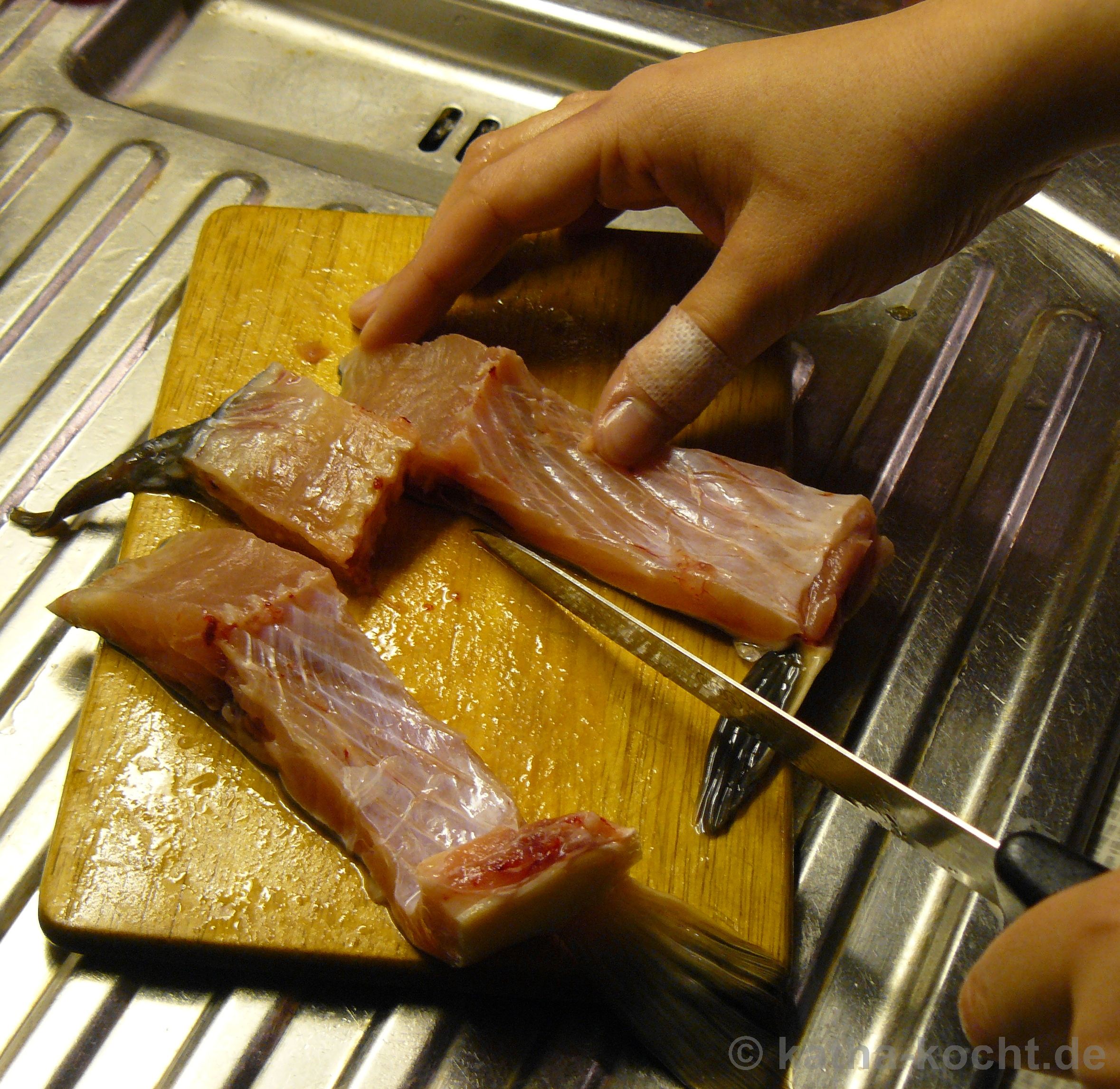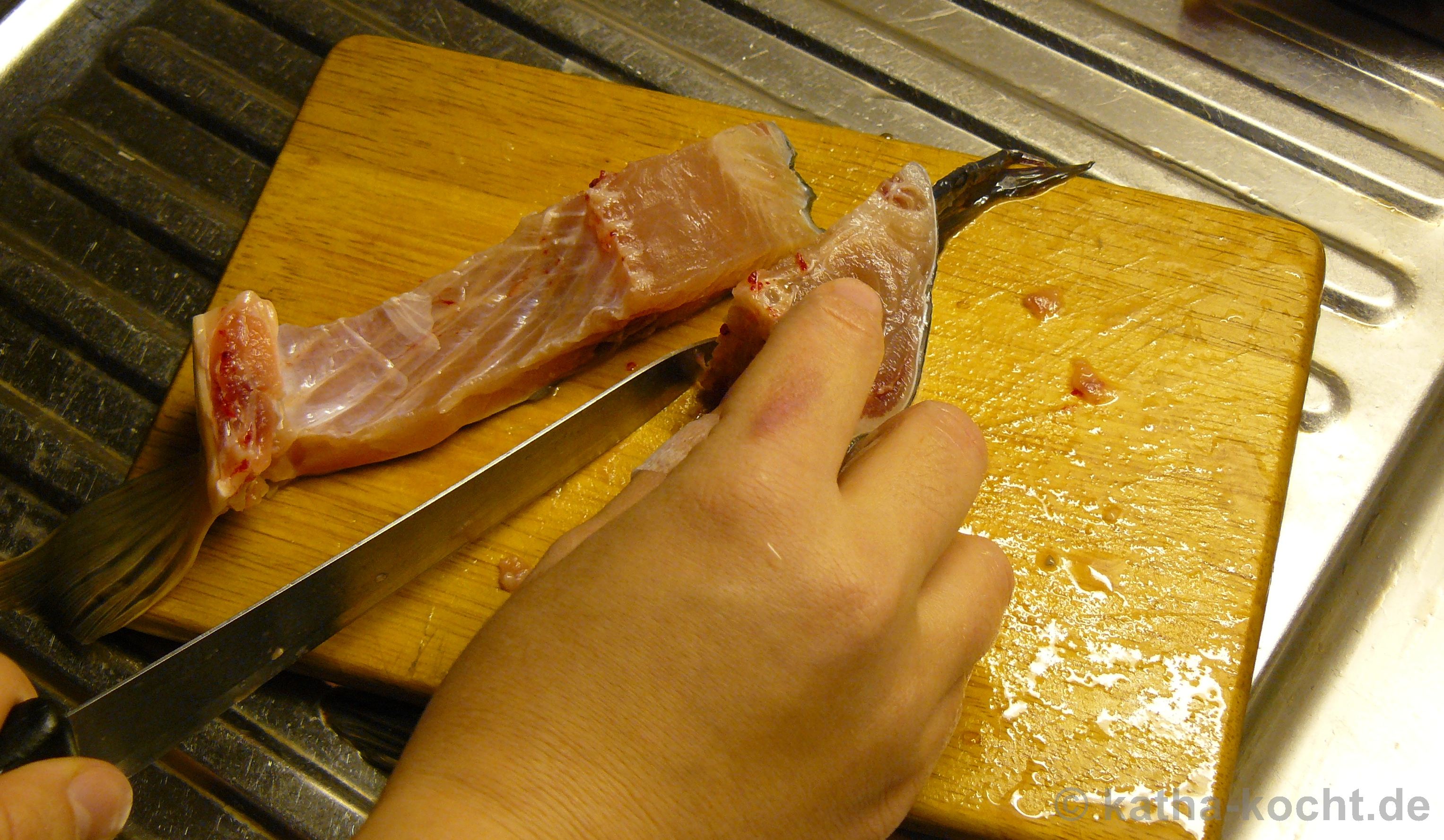 Jetzt geht die wirkliche Arbeit los. Man darf diesen kleinen Fisch nicht unterschätzen – der hat wirklich extrem stabile Gräten. Besonders die Wirbelsäule ist sehr wiederspenstig. Ich habe dabei für mich die folgende Taktik entwickelt: Ich habe mit dem Messer Haut und Fleisch entlang der vorgelegten Einschnitten komplett aufgeschnitten. Dann habe ich das Messer auf der Wirbelsäule angesetzt und mit aller Kraft runtergedrückt. Dazu wäre ein etwas schwereres Messer hilfreich gewesen. Die Omi hat das immer mit Hammer und Beil gemacht. Es ging aber auch so. Das Beil war mir irgendwie nix.