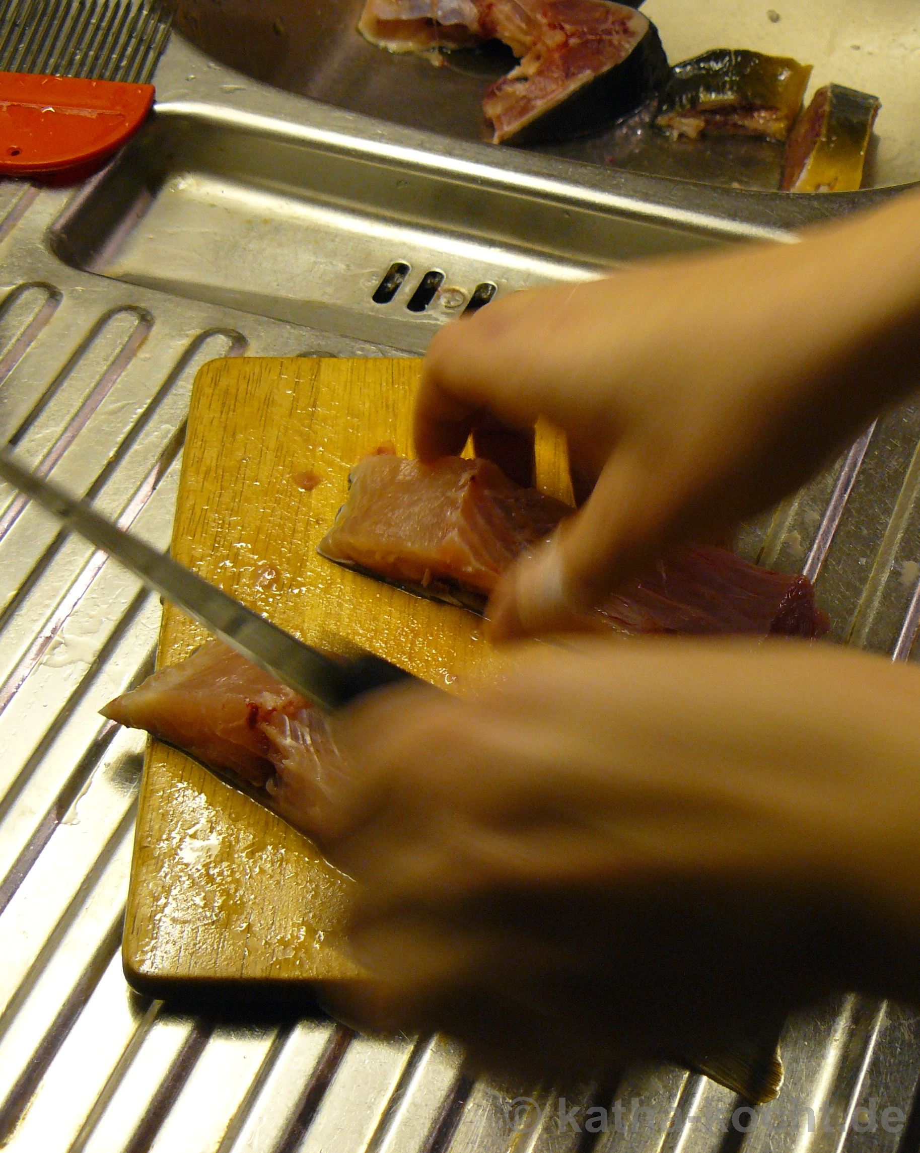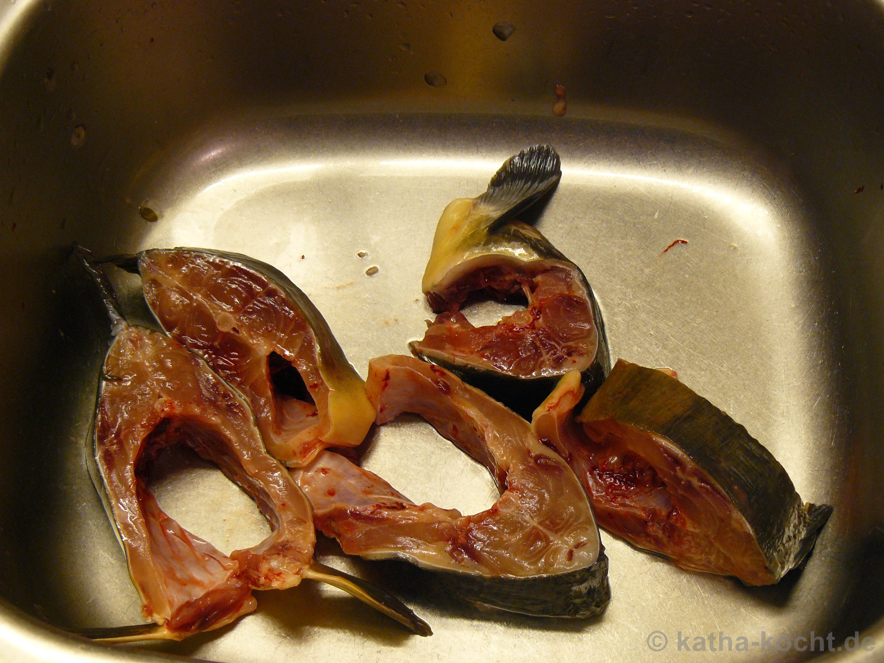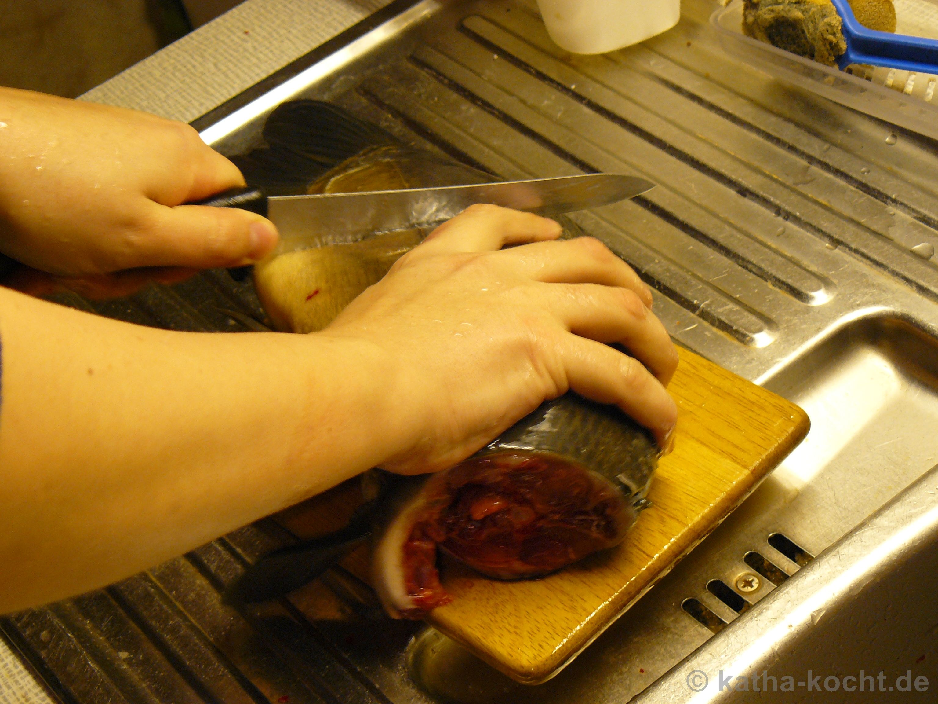 Die Fischscheiben haben wir in der Spüle gesammelt. Als der ganze Fisch zerlegt war wurden sie nochmal ganz ordentlich abgewaschen.