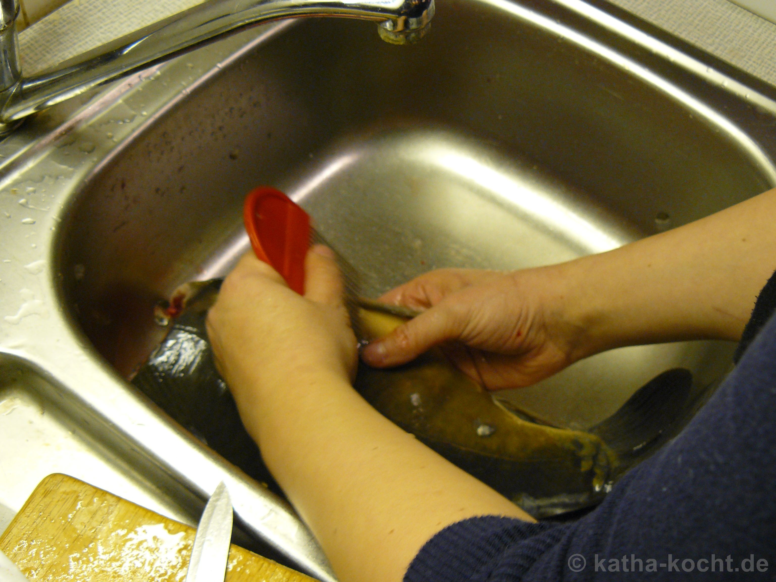Im zweiten Schritt wurde der Fisch entschleimt. Dazu zieht man mehrfach leicht gegen den Strich über die Haut und spült ihn dann unter fließend Wasser ab. Glitschig ist er immer noch, aber man merkt, dass er sich verändert hat.