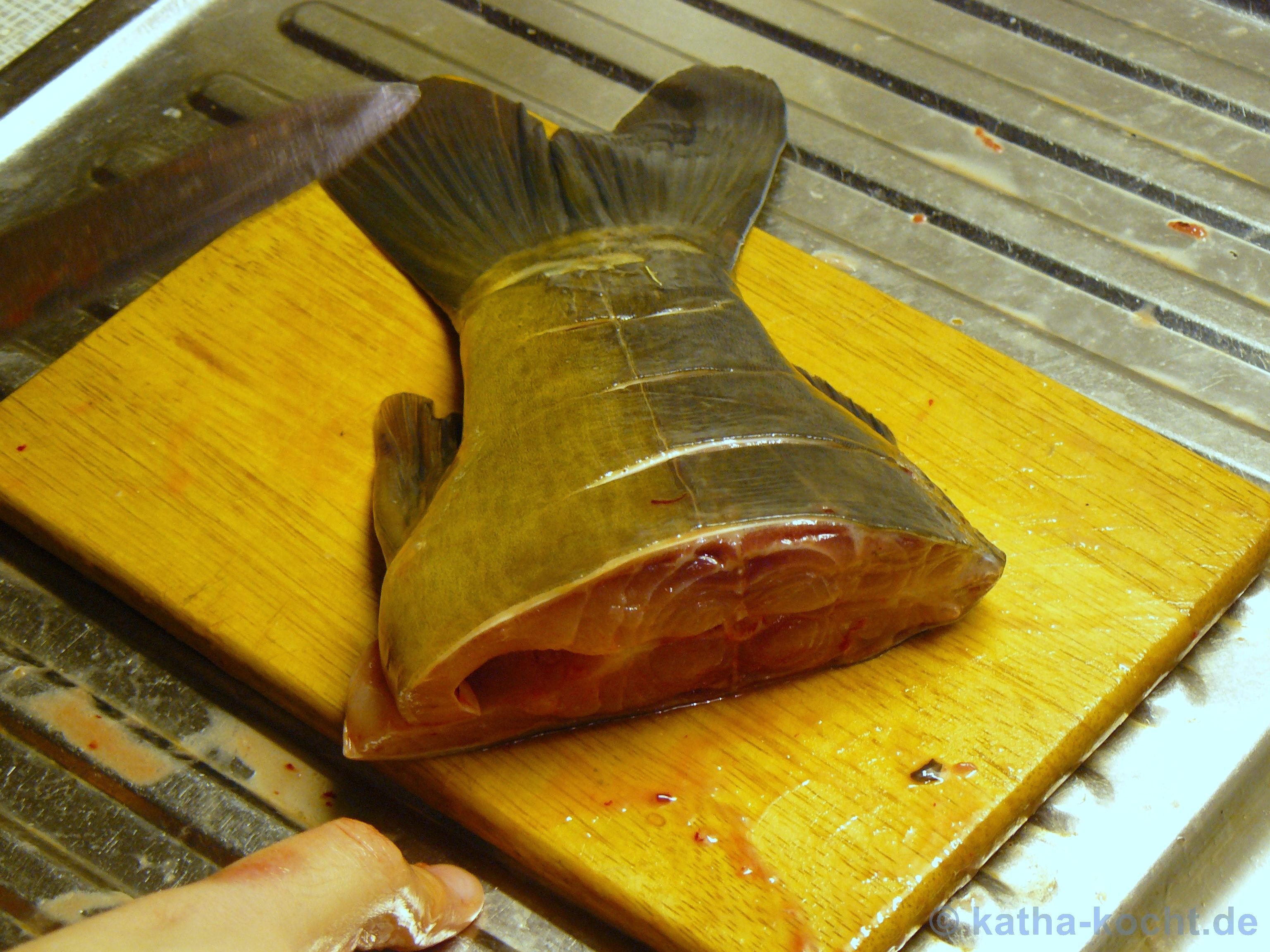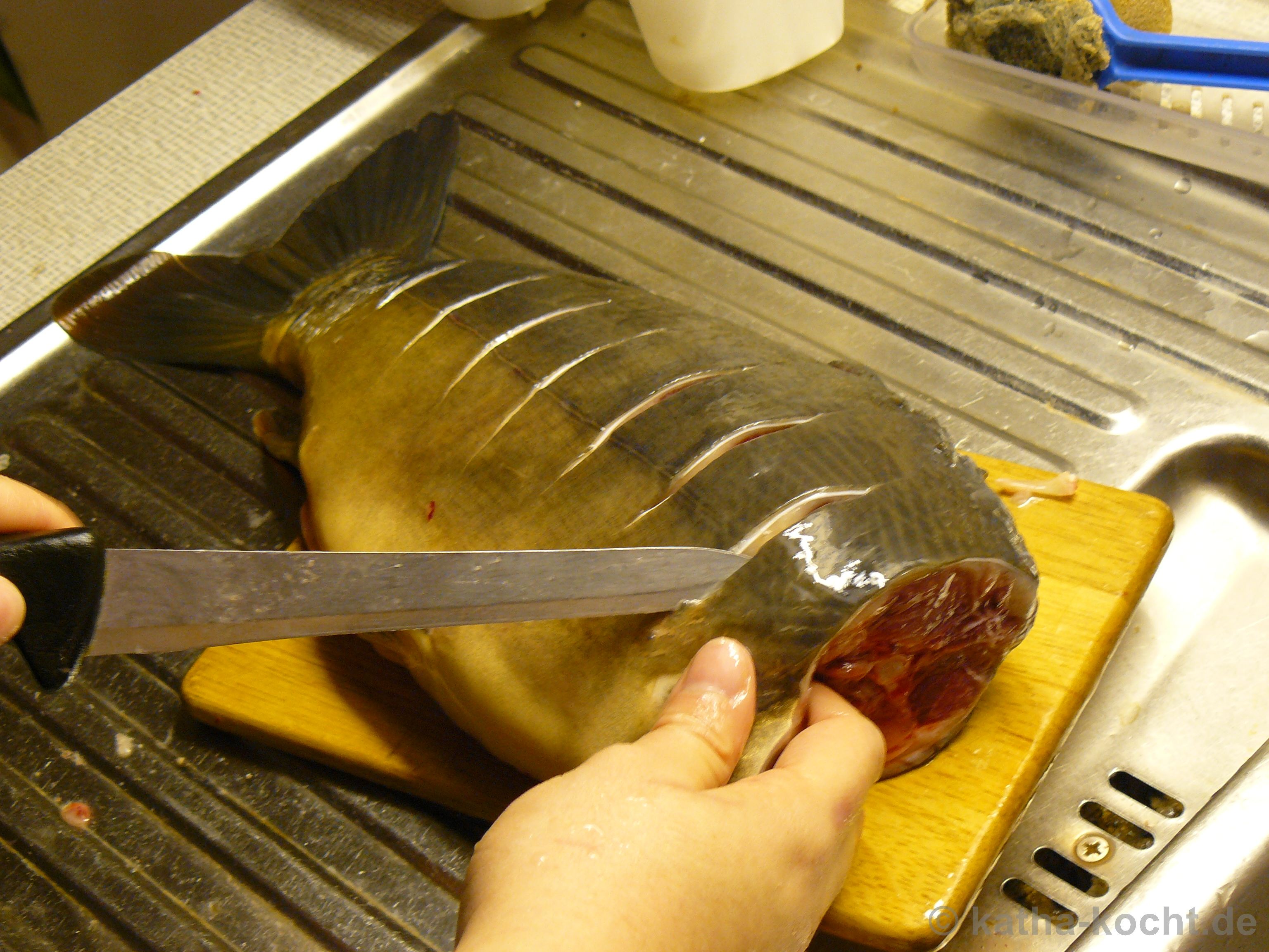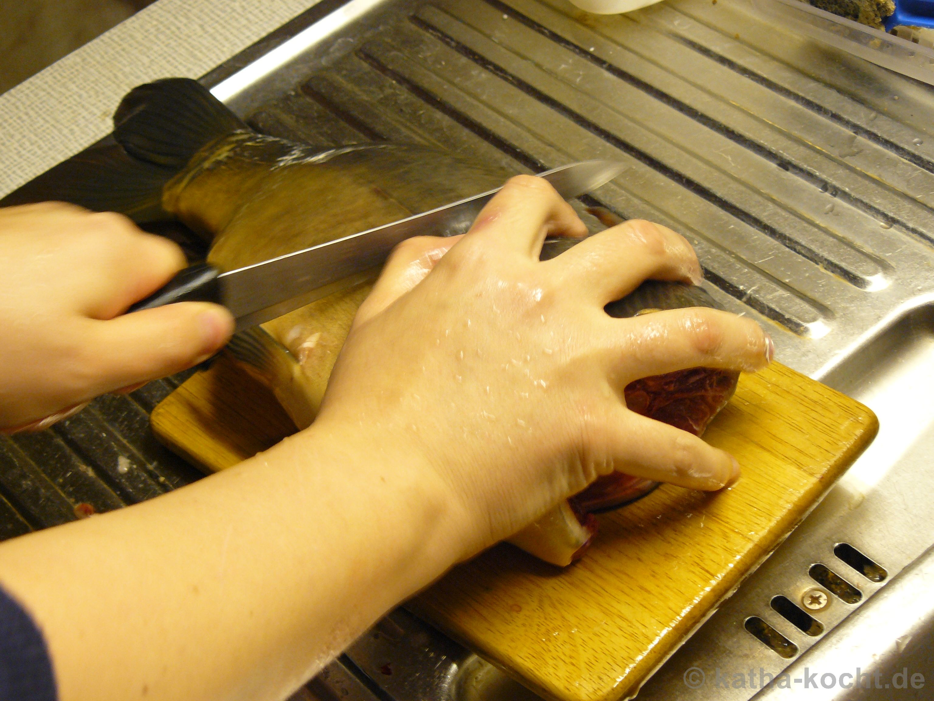 Warum mit dem Messer quälen. Ich nehme eine, aber auch gute, Geflügelschere, damit läßt sich der Karpfen bestens zerlegen.