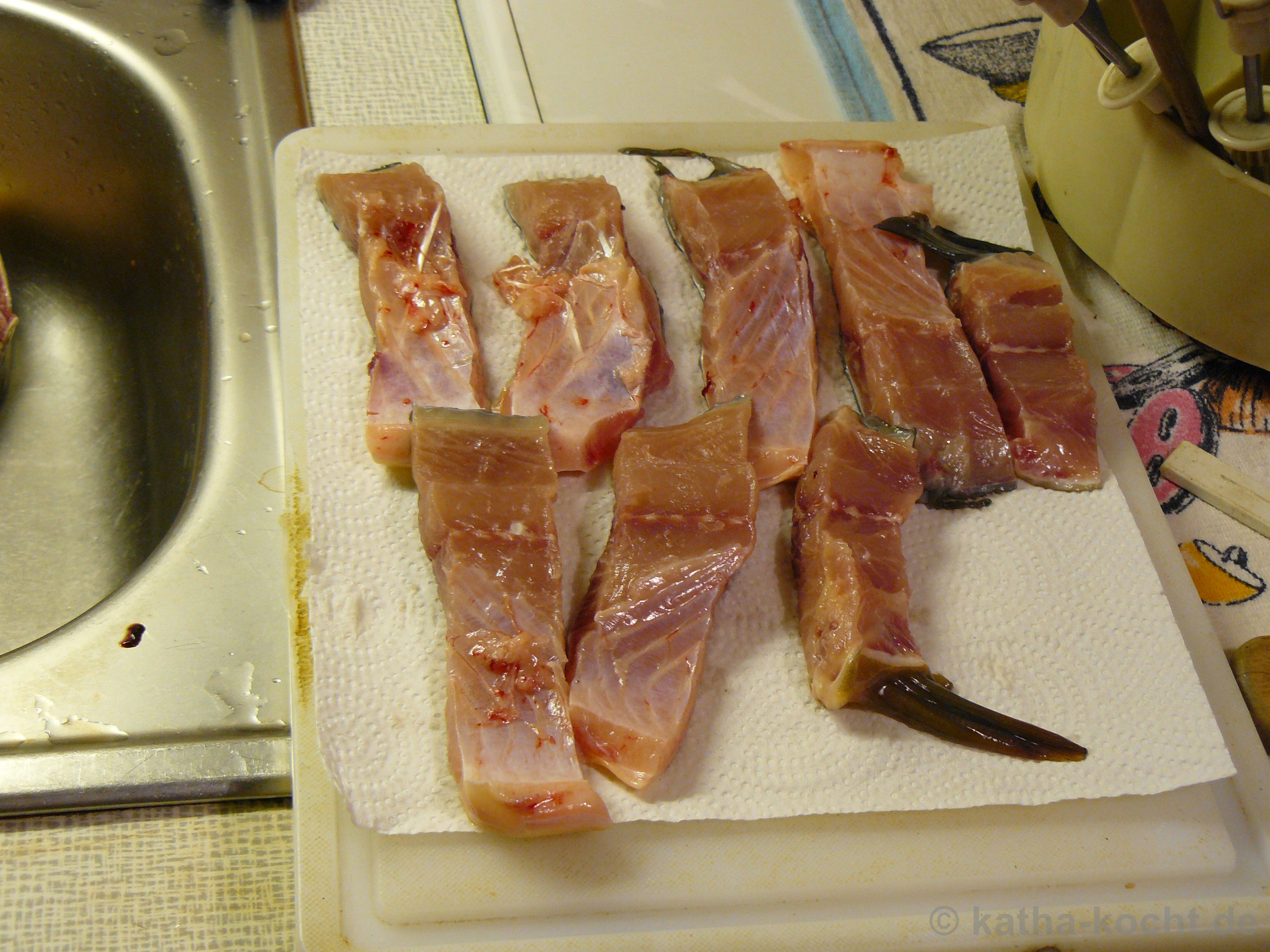 Die Flossen sollten dran bleiben, da kann man laut der Omi dran knabbern. Da werde ich nicht widersprechen. Man kann sie aber natürlich auch entfernen. Ich werde beim nächsten Mal auch die größeren Gräten ziehen. Die fertigen Stücken werden jetzt mit der Haut nach unten auf ein mit Haushaltspapier ausgelegtes Brett gelegt.