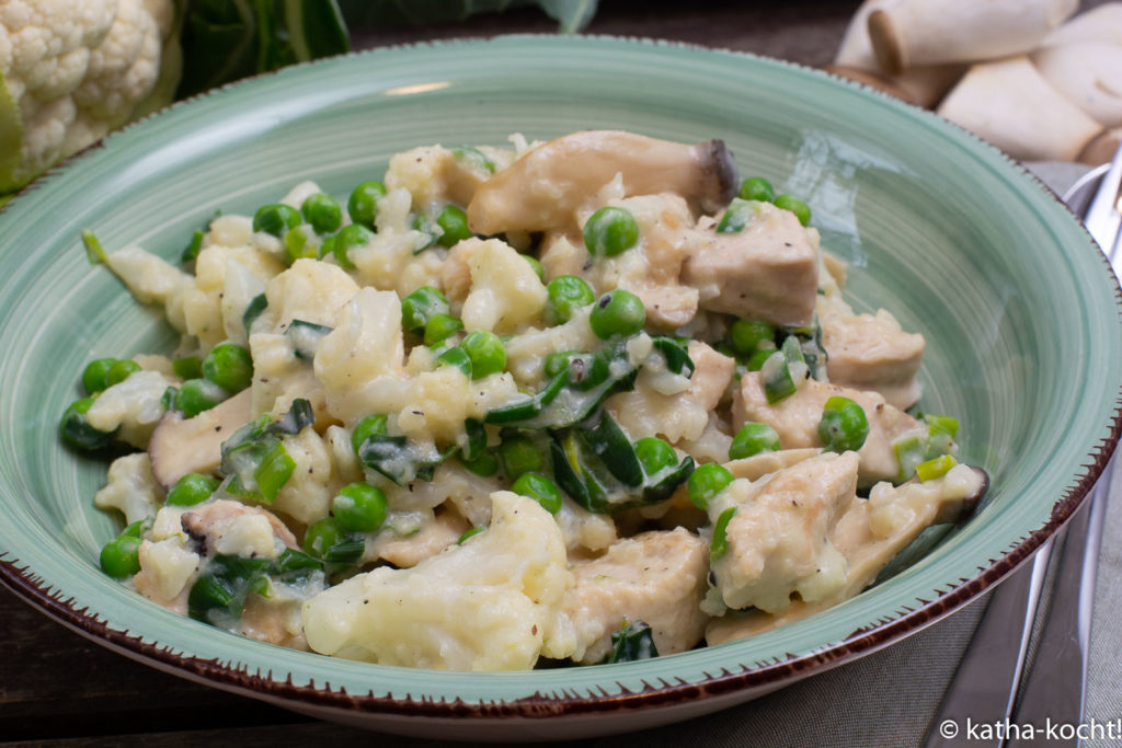 Kategorie: Gerichte mit Geflügel Stichworte: blumenkohl, erbsen, huhn, kräuterseitlinge, lauch