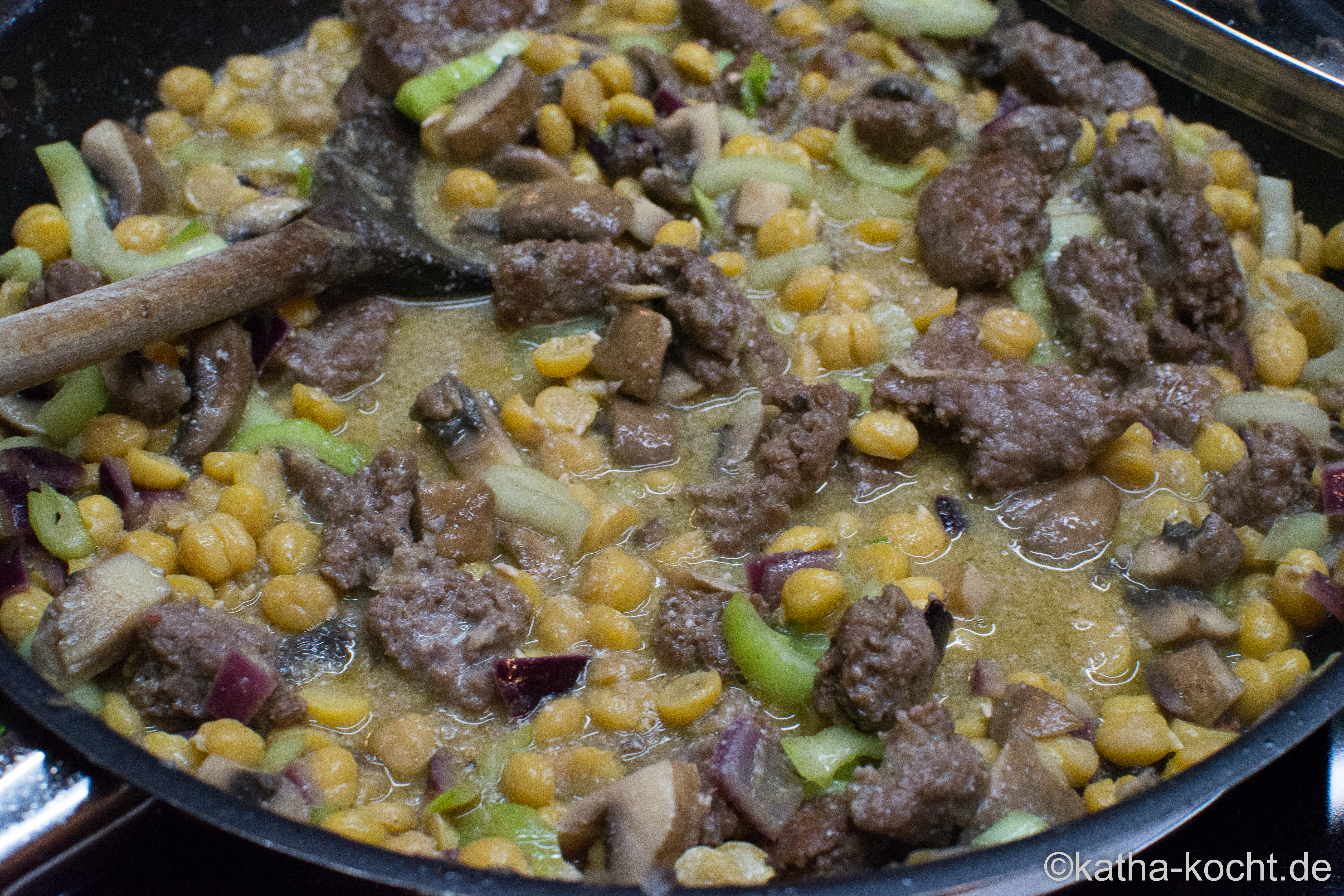 Es gibt ja so Rezepte, die entstehen total spontan und mit dem was gerade da ist. Da stöbert man zuerst im Vorratsschrank, räumt dann das Gemüsefach im Kühlschrank auf und durchwühlt am Ende noch schnell das Tiefkühlfach. Das Ergebnis kann man dann als Restessen bezeichnen, oder als das Ergebnis einer Schatzsuche im Vorratsschrank. Die veranstaltet Susanne von Magentratzerl regelmäßig und so gibt sie einem immer wieder einen schönen Grund zu schauen was man da eigentlich alles noch gehamstert hat. Kommen wir endlich zum Punkt – bei mir gab es ein Kichererbsen Curry. Die Kichererbsen hatte ich schon am Vortag eingeweicht, was darauf wird habe ich dann spontan entschieden. Und so sind Hackfleisch, Currypaste, Joghurt, Petersilie, Pak Choi, Champignons und rote Zwiebeln in die Pfanne gewandert. Scharf und lecker ist es geworden, mein buntes Kichererbsen Curry mit Hackfleisch!