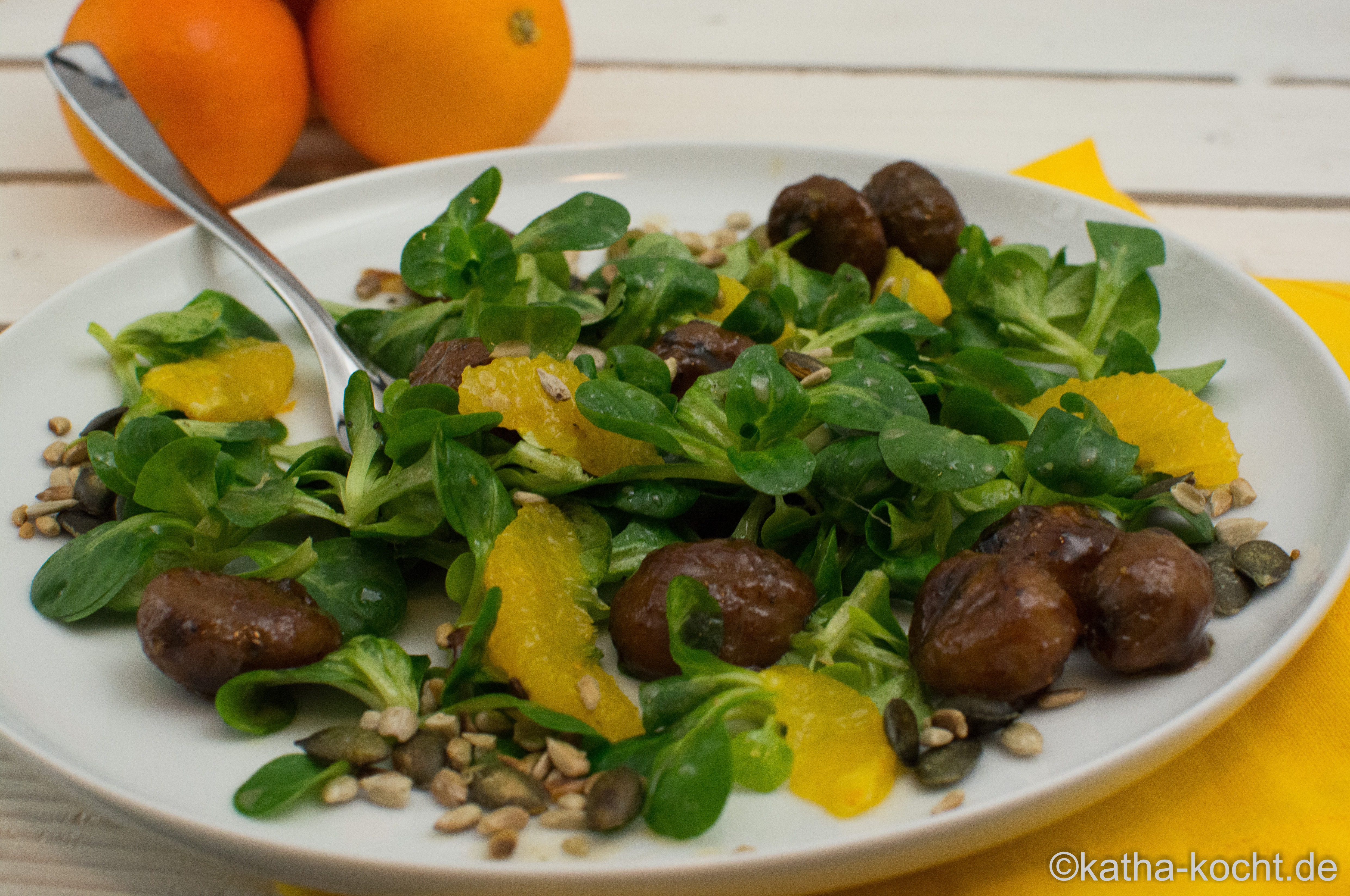 Ich habe bisher zwei Rezepte getestet – beide haben ohne Probleme funktioniert. Hier möchte ich euch den Feldsalat mit Maronen und Orange zeigen.