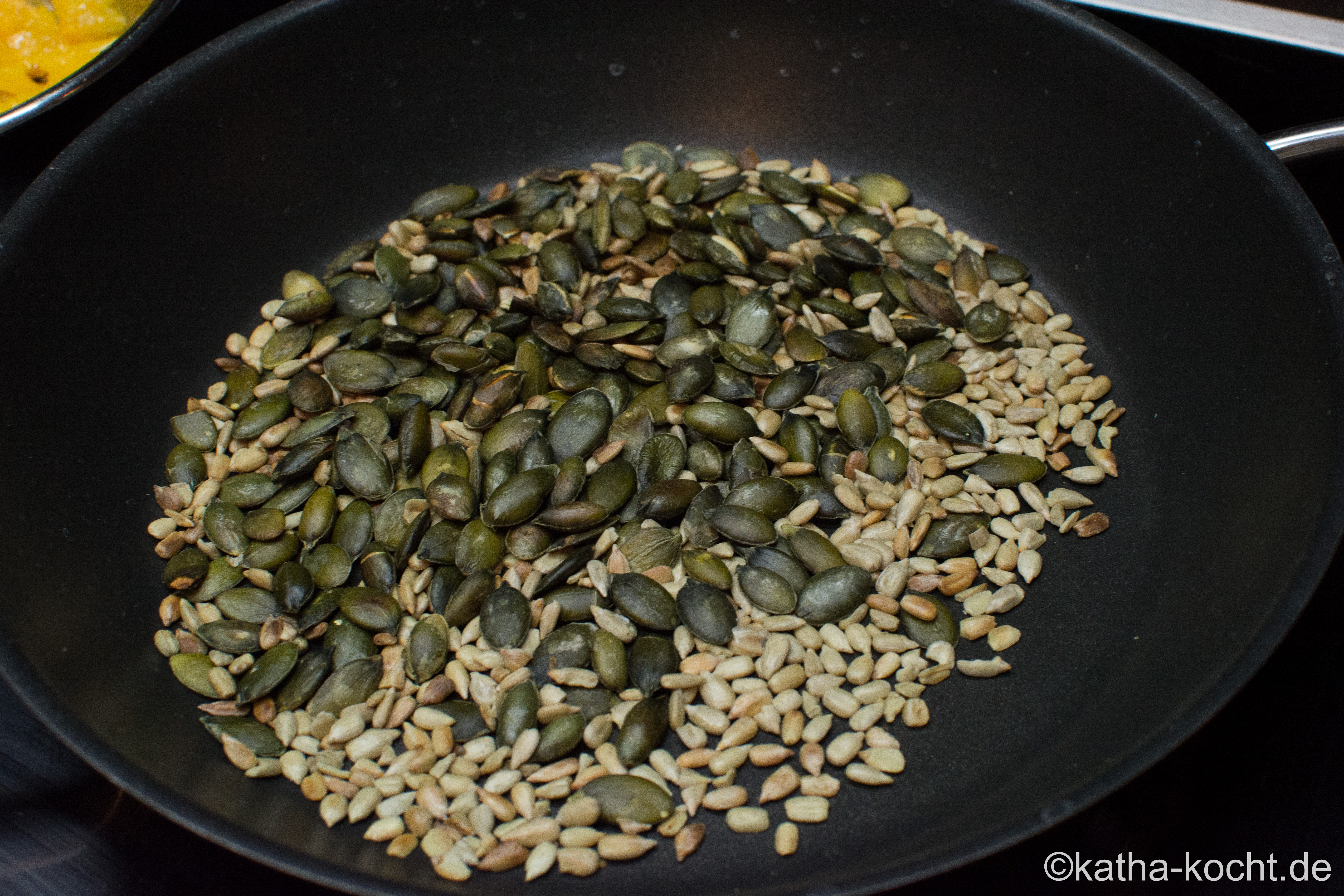 Die Kürbiskerne und Sonnenblumenkerne in einer kleinen Pfanne anrösten und beiseite stellen.
