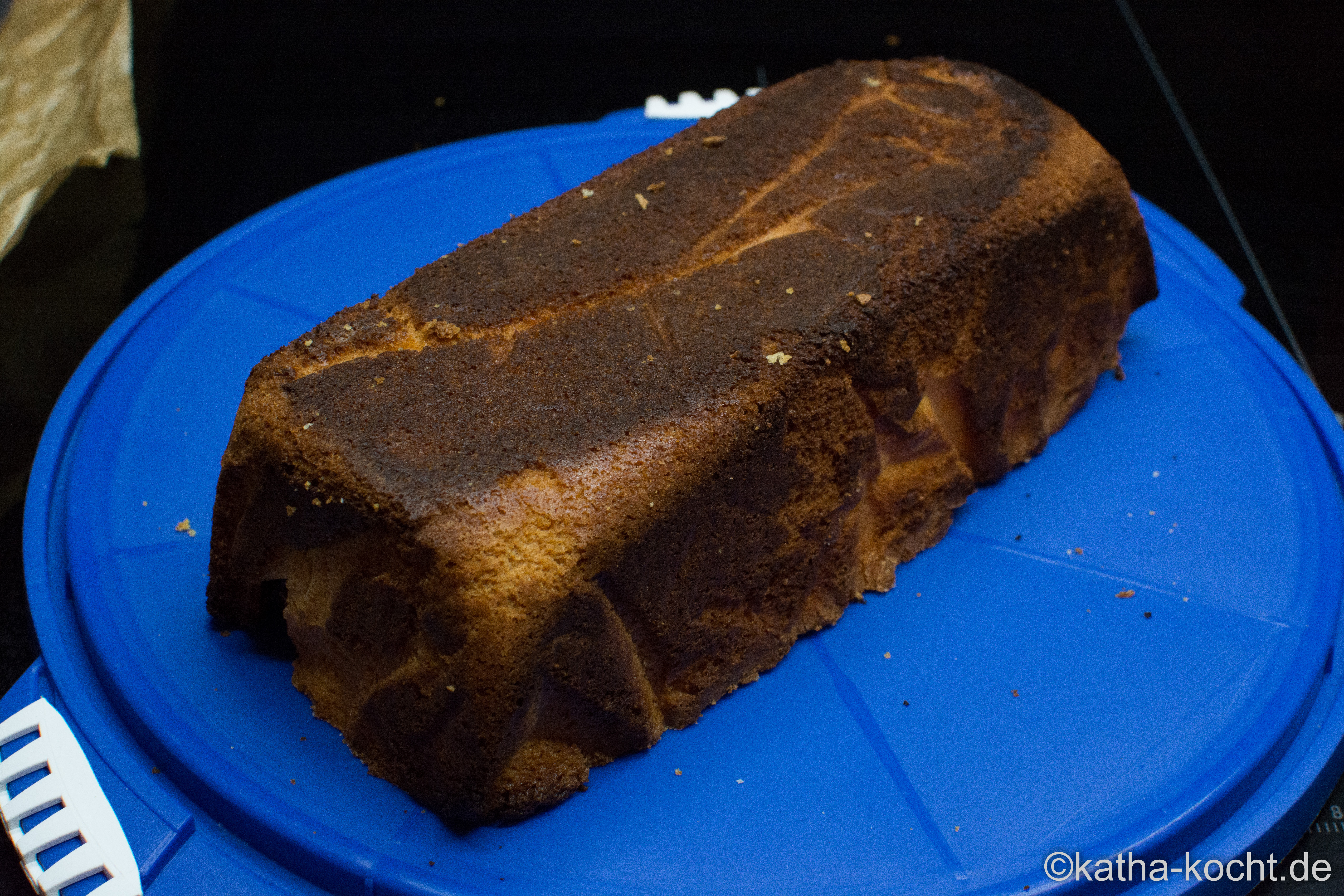Den fertigen Kuchen aus dem Ofen holen und auf einem Gitter abkühlen lassen. Dann die gewölbte Decke mit einem Brotmesser so eben und gerade wie möglich abschneiden und den Kuchen umdrehen.
