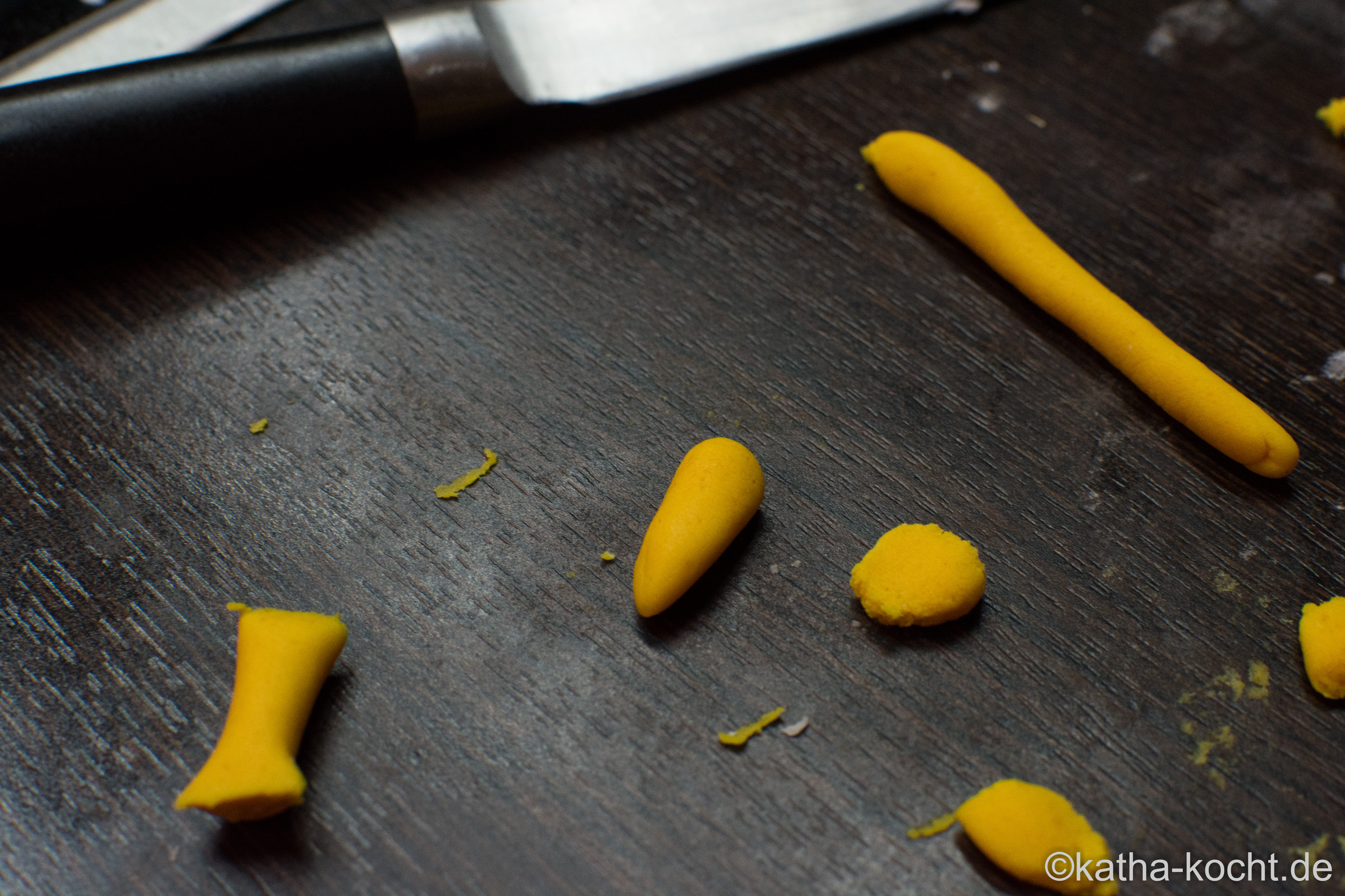 Das farbige Fondant rollen bis ihr eine lange „Wurst“ habt. In kleine Stücken teilen und daraus die Karotten formen. Bei mir sind das 12 Stück.
