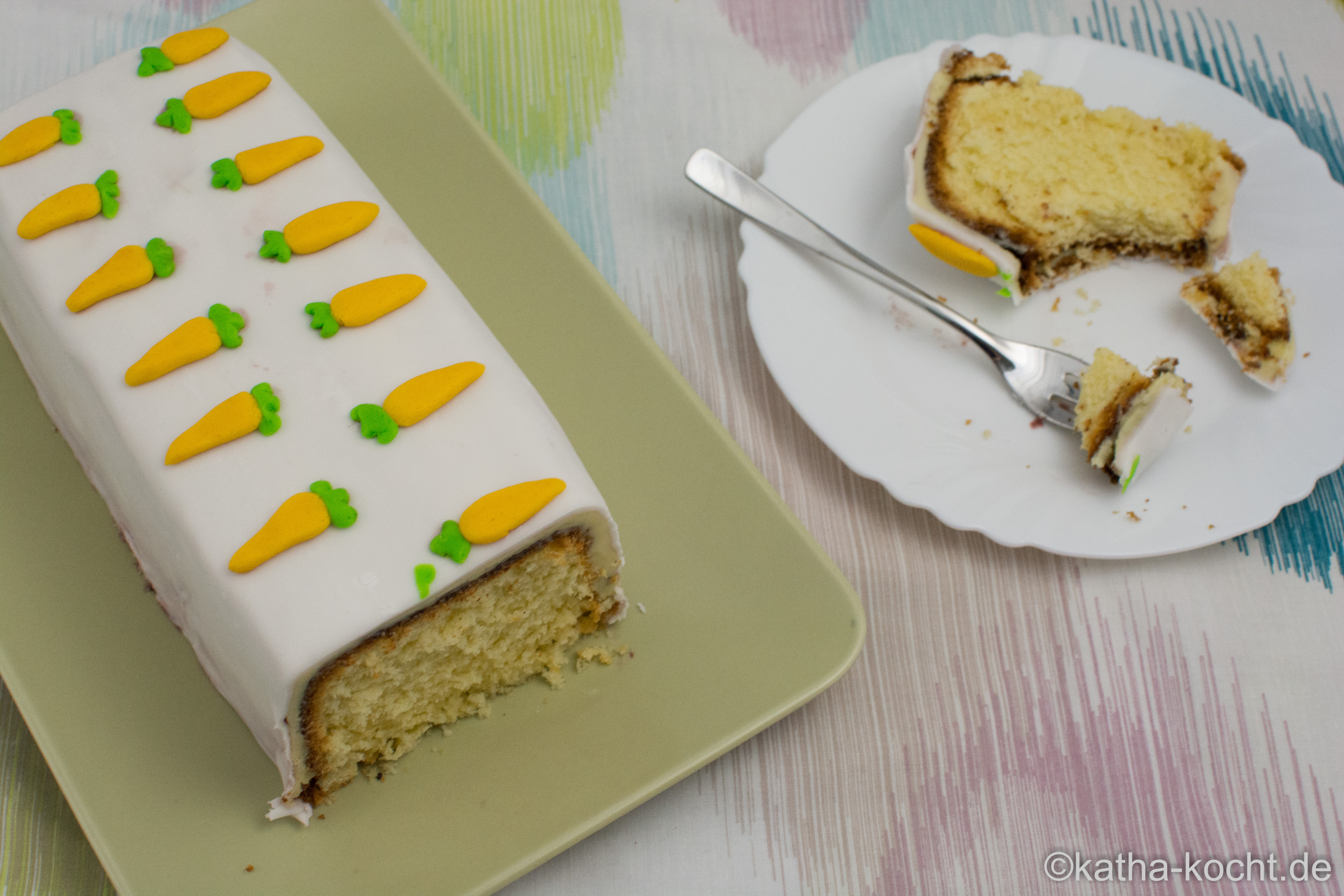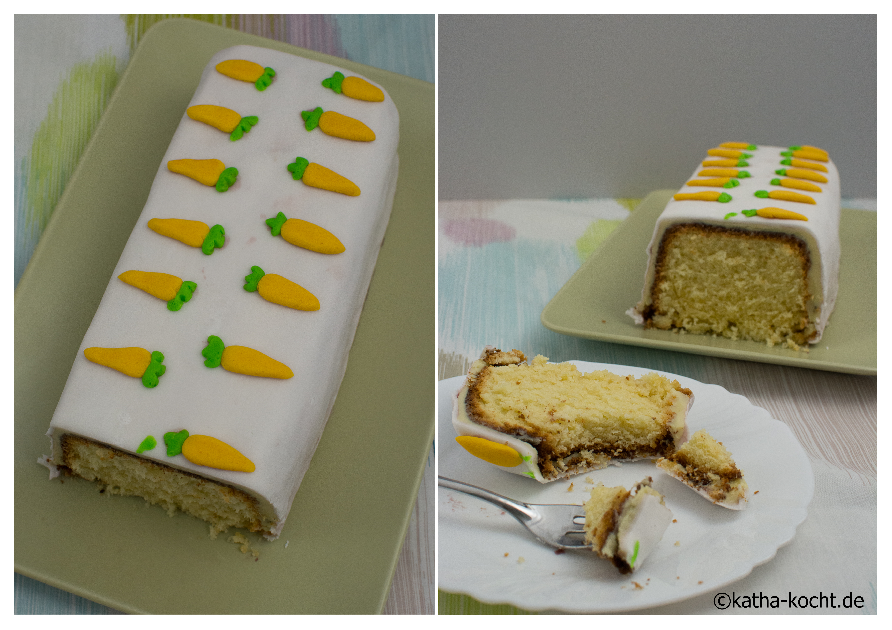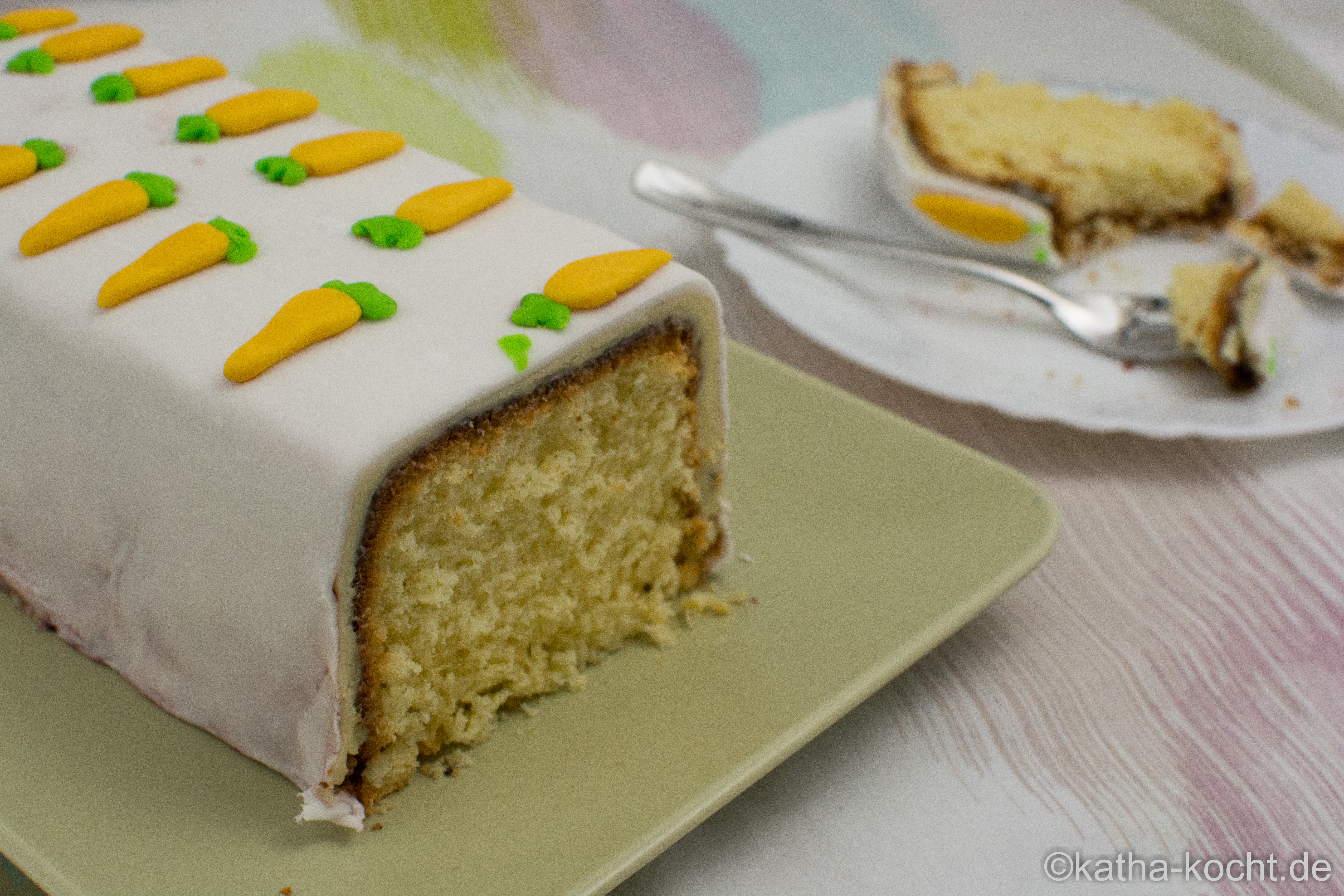 Seid ihr schon in Osterstimmung, oder kommt das bei euch erst kurz vorher? Ich kann das erste Grün im Garten kaum noch erwarten und auch wenn es noch ein paar Tage hin ist schwirren mir schon so viele bunte Ideen für Deko und Schnickschnack durch den Kopf. Die Kolleginnen im Büro sind da glücklicherweise absolut flexibel und freuen sich auch jetzt schon über meine Experimente. Hier ist er also, mein erster Osterkuchen in diesem Jahr! Als Basis-Kuchen könnt ihr natürlich nehmen was ihr möchtet – ich habe mich für diesen Eierlikör Kuchen entschieden und ihn mit weißer Ganache und Fondant eingedeckt. Mein Fazit – der Kuchen ist einfach genial fluffig und die weiße Schokolade passt super dazu. Ich habe allerdings einen Waldfruchtsirup verwendet, einfach weil ich davon noch etwas im Kühlschrank hatte und das war zum Eindecken auch kein Problem, aber beim Aufkleben der Karotten habe ich mir damit ein-zwei Flecken auf den schönen weißen Kuchen gemacht. Und – damit wären wir beim nächsten Thema – leider habe ich die Zuckerkarotten nicht rechtzeitig gekauft. Also habe ich Fondant eingefärbt, geformt und auf den Kuchen geklebt… wenn ihr an solcher Fummelarbeit nicht super viel Spaß habt solltet ihr die Karotten kaufen. Meine sind zwar optisch nicht schlecht geworden, aber ich hab mich ehrlich gesagt schon besser amüsiert. 😉