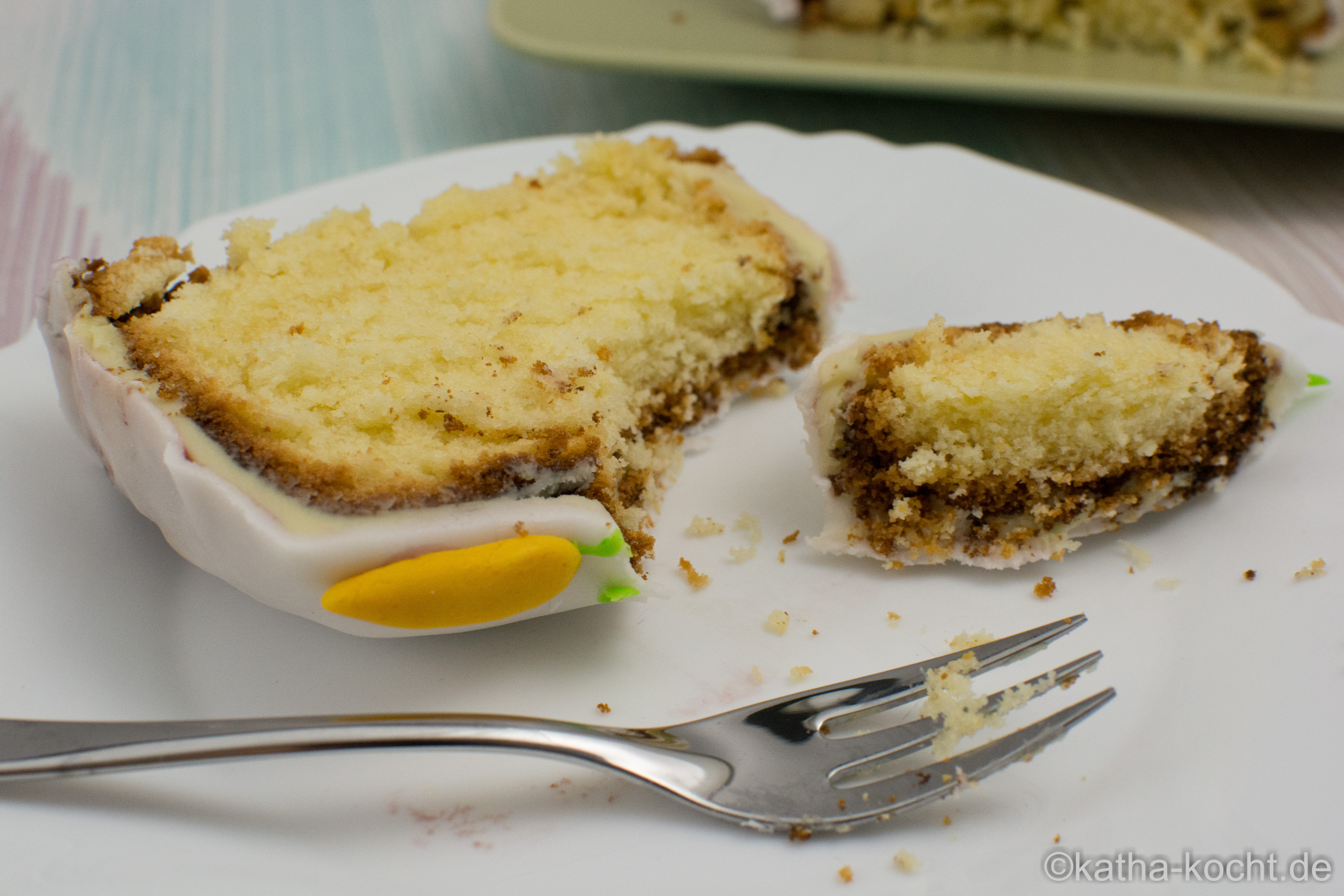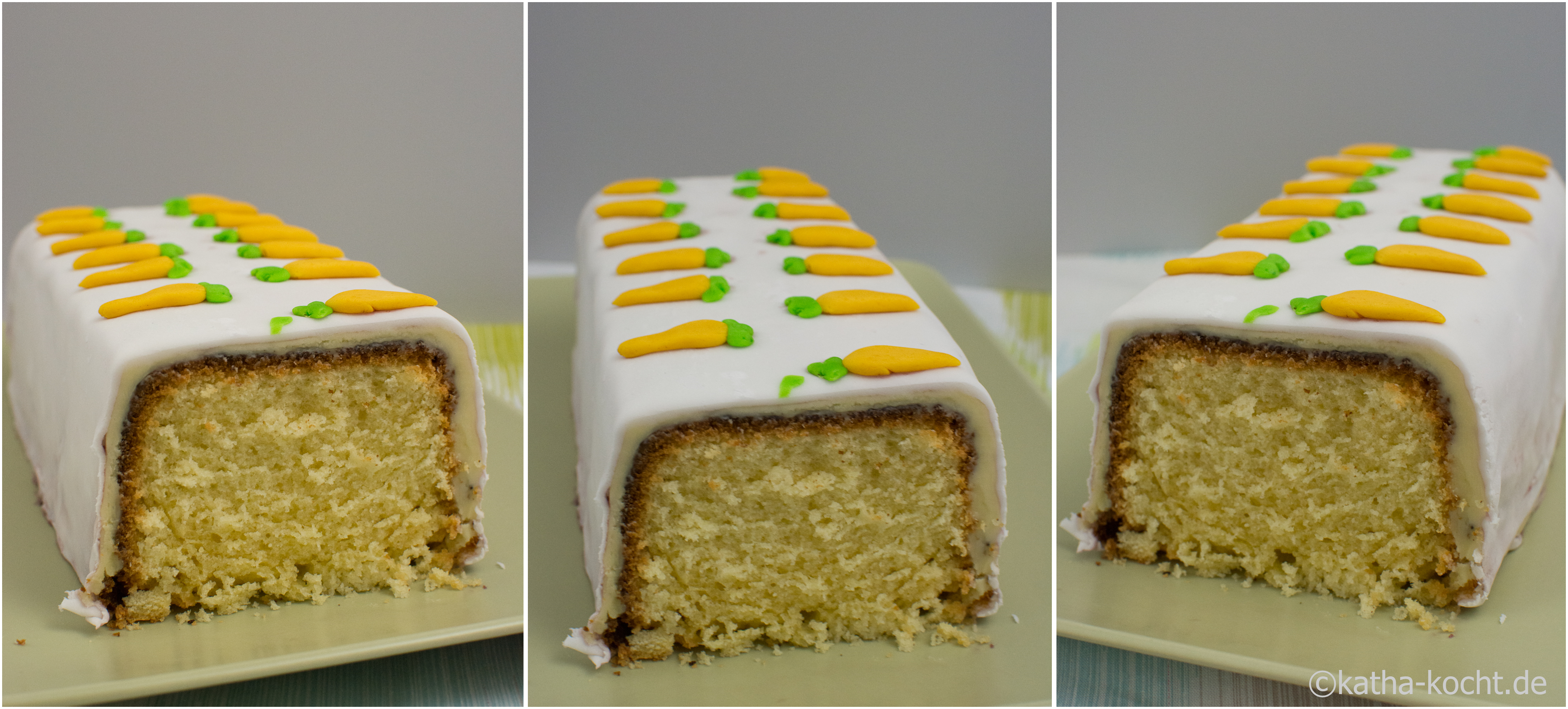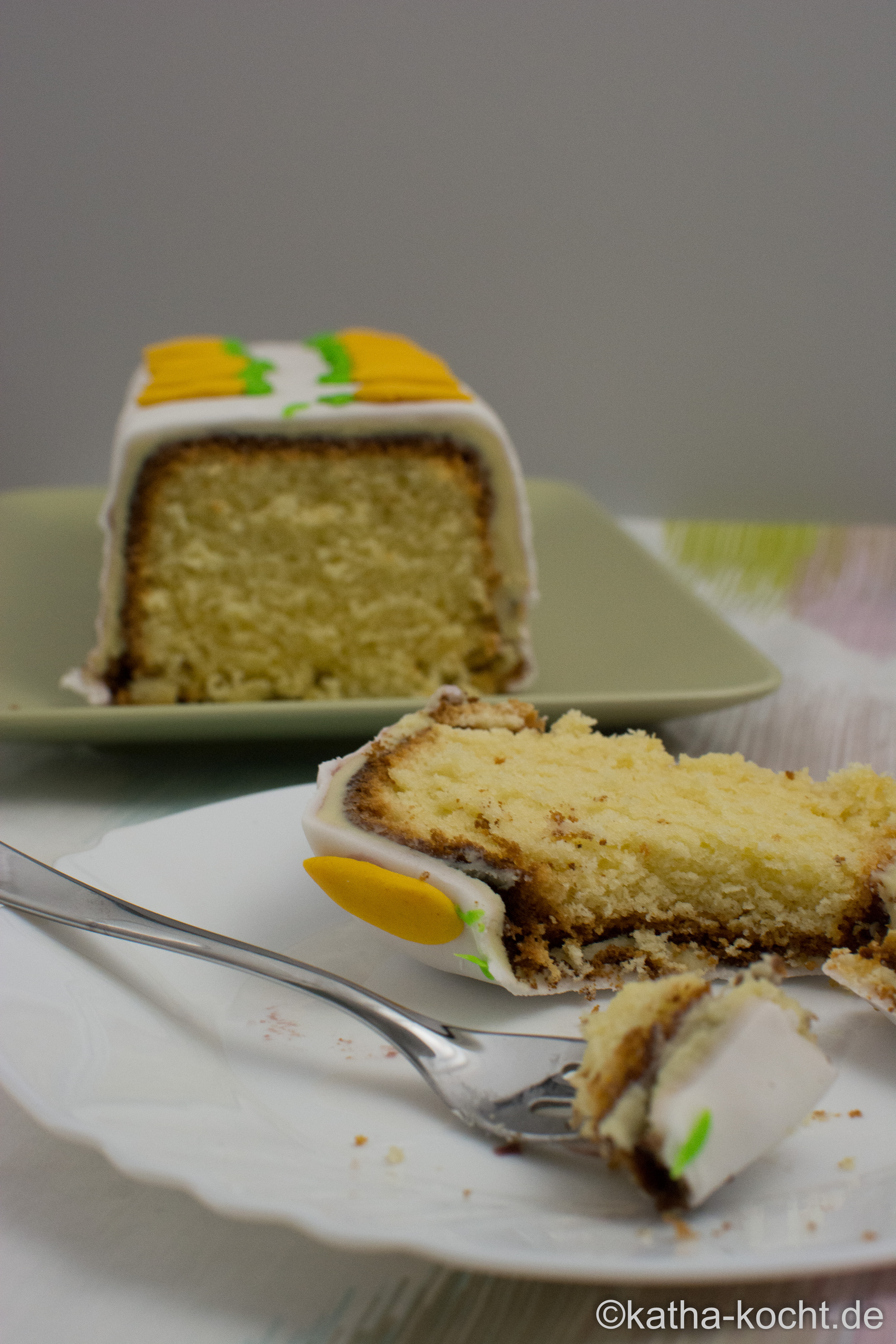 Seid ihr schon in Osterstimmung, oder kommt das bei euch erst kurz vorher? Ich kann das erste Grün im Garten kaum noch erwarten und auch wenn es noch ein paar Tage hin ist schwirren mir schon so viele bunte Ideen für Deko und Schnickschnack durch den Kopf. Die Kolleginnen im Büro sind da glücklicherweise absolut flexibel und freuen sich auch jetzt schon über meine Experimente. Hier ist er also, mein erster Osterkuchen in diesem Jahr! Als Basis-Kuchen könnt ihr natürlich nehmen was ihr möchtet – ich habe mich für diesen Eierlikör Kuchen entschieden und ihn mit weißer Ganache und Fondant eingedeckt. Mein Fazit – der Kuchen ist einfach genial fluffig und die weiße Schokolade passt super dazu. Ich habe allerdings einen Waldfruchtsirup verwendet, einfach weil ich davon noch etwas im Kühlschrank hatte und das war zum Eindecken auch kein Problem, aber beim Aufkleben der Karotten habe ich mir damit ein-zwei Flecken auf den schönen weißen Kuchen gemacht. Und – damit wären wir beim nächsten Thema – leider habe ich die Zuckerkarotten nicht rechtzeitig gekauft. Also habe ich Fondant eingefärbt, geformt und auf den Kuchen geklebt… wenn ihr an solcher Fummelarbeit nicht super viel Spaß habt solltet ihr die Karotten kaufen. Meine sind zwar optisch nicht schlecht geworden, aber ich hab mich ehrlich gesagt schon besser amüsiert. 😉