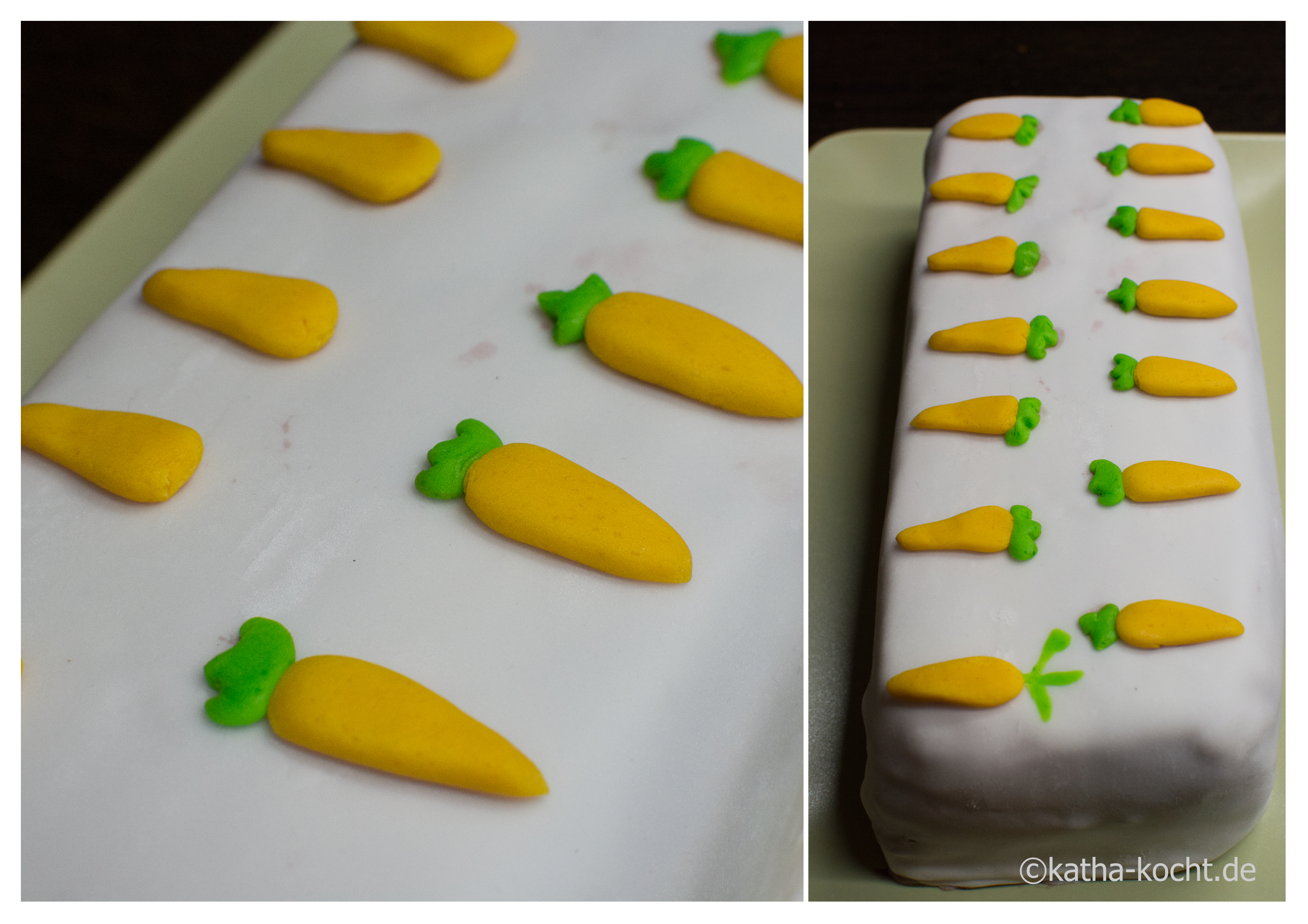 … die kleine Karotte einmal kurz darauf drücken und sofort auf den Kuchen kleben. Ich platziere die Karotten etwas versetzt, so kommt später auf jedes Stück eine Karotte.