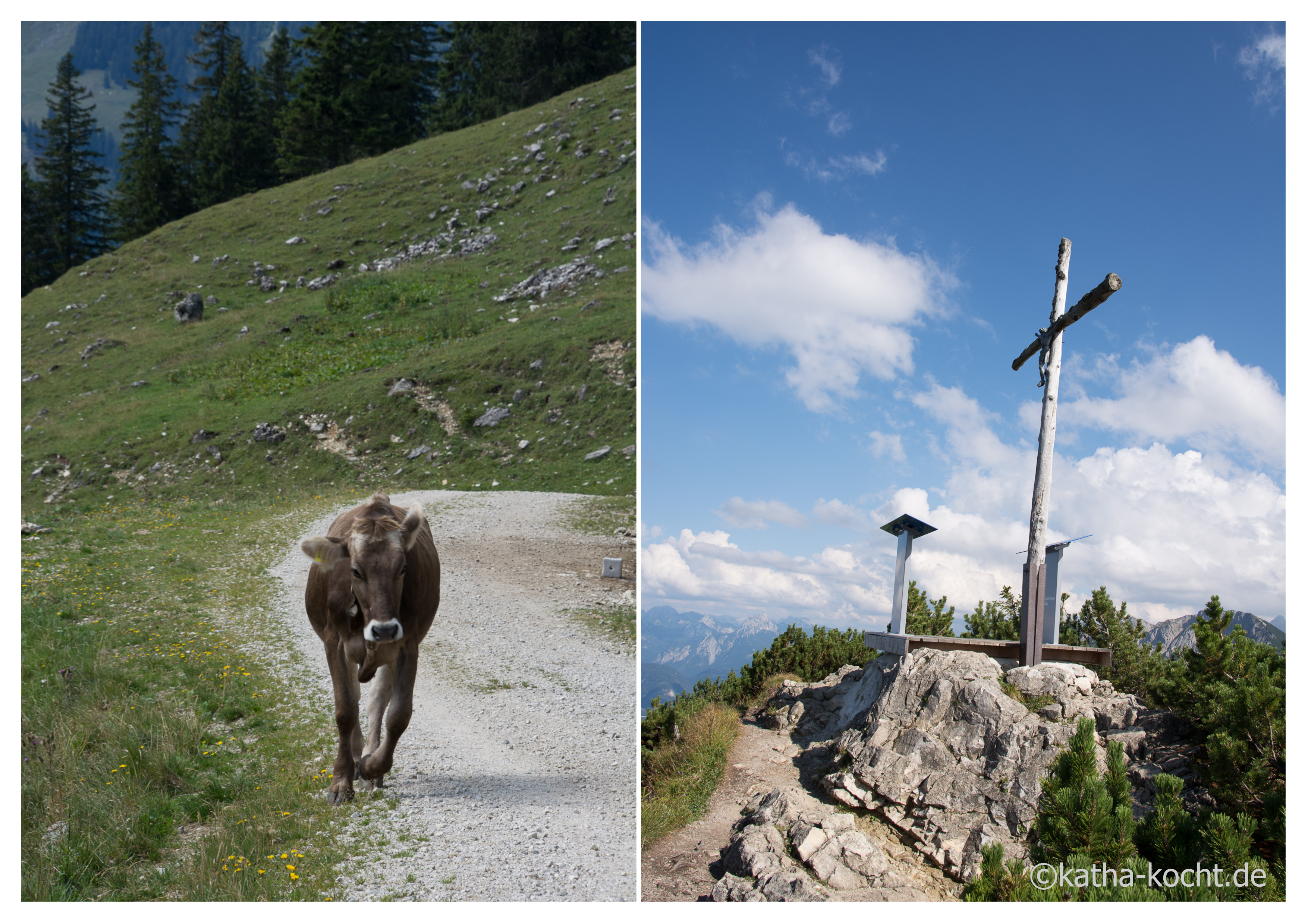 Auf dem Gipfel steht eine ganz bezaubernde Almhütte. Wir haben Glück und können einen Platz am Geländer mit Blick in Richtung Österreich ergattern. Ein absolut genialer Ausblick, oder?