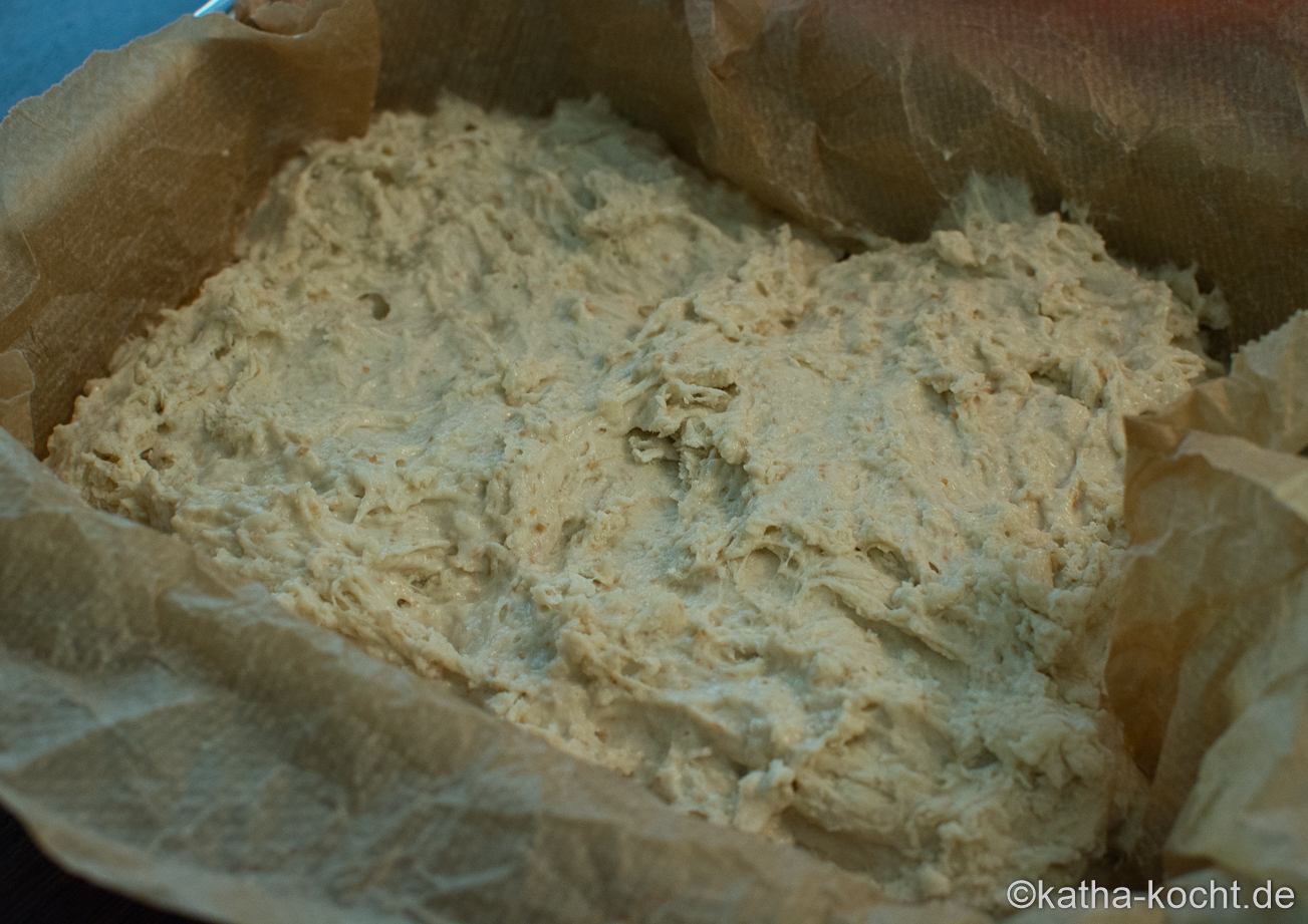 Am Backtag den Teig halbieren. Eine Auflaufform mit Backpapier auskleiden und den Teig hinein geben.