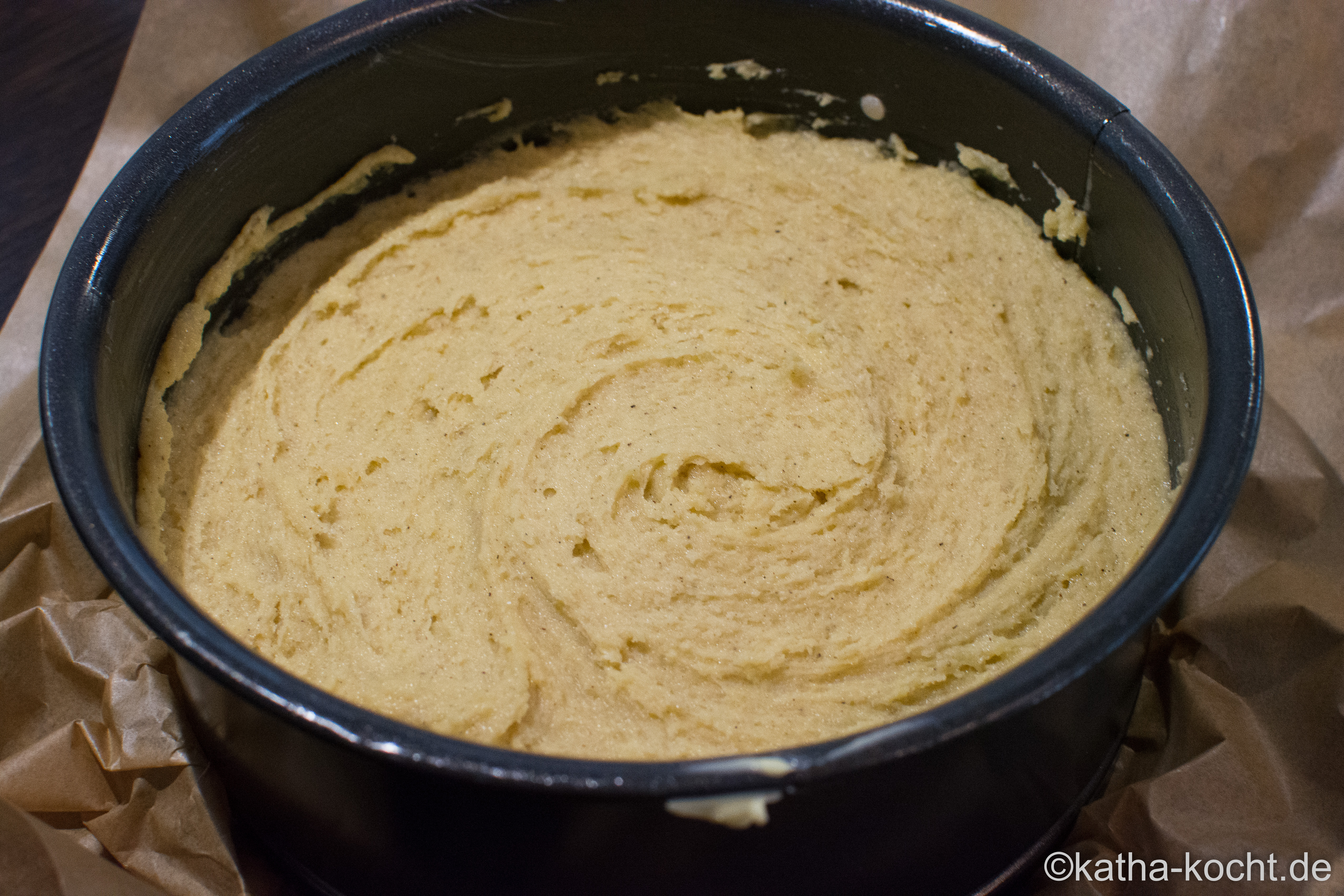 Für die Torte werden Mehl, Zucker, Backpulver, Eier, Butter und Vanille in die Rührschüssel gegeben und zu einem glatten Rührteig vermengt. Eine 16cm Backform unten mit Backpapier auslegen und am Rand mit Butter einfetten. Den Ofen auf 180°C Umluft vorheizen und den Teig hinein füllen.