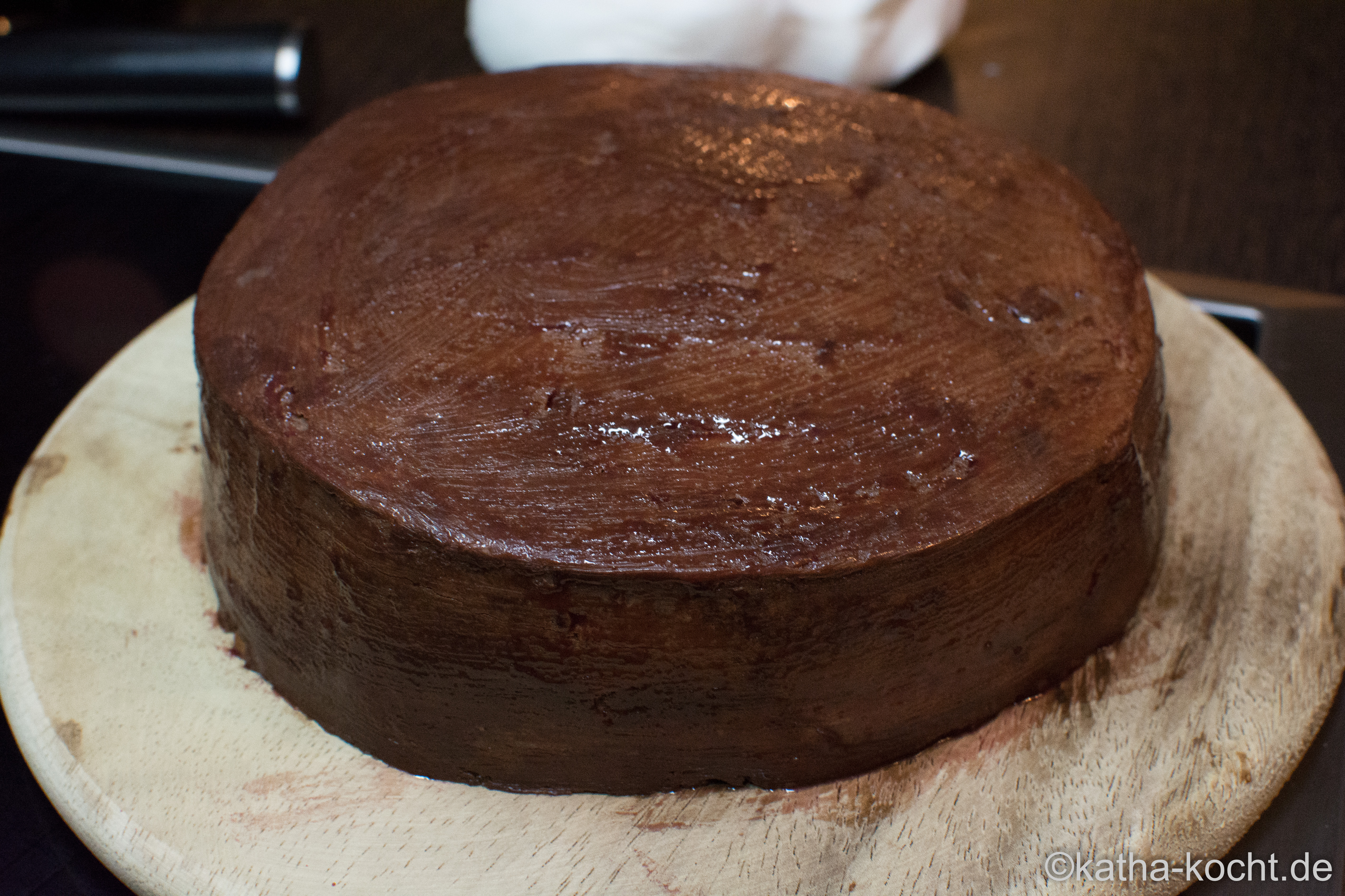 Wieder ab damit in den Kühlschrank zum Aushärten. Im nächsten Schritt sind Feingefühl und Geduld gefragt. Die Palette (bei mir ein Brotmesser) in einen Messbecher mit kochend heißem Wasser stellen, abtrocknen und damit rundum über die Torte gehen um die Schokolade minimal anzuschmelzen und kleine Unebenheiten glatt zu ziehen. Immer wieder ins heiße Wasser stellen, abtrocknen und wieder ran an die Torte. Irgendwann denke ich mir – das sieht doch jetzt ganz gut aus. Naja, glaubt mir: wenn das Fondant auf der Torte liegt sieht man jede noch so kleine Delle. Aber das nennt sich dann wohl Erfahrung. Hier auf dem Foto ist die Oberfläche gemacht, der Rand aber noch nicht.