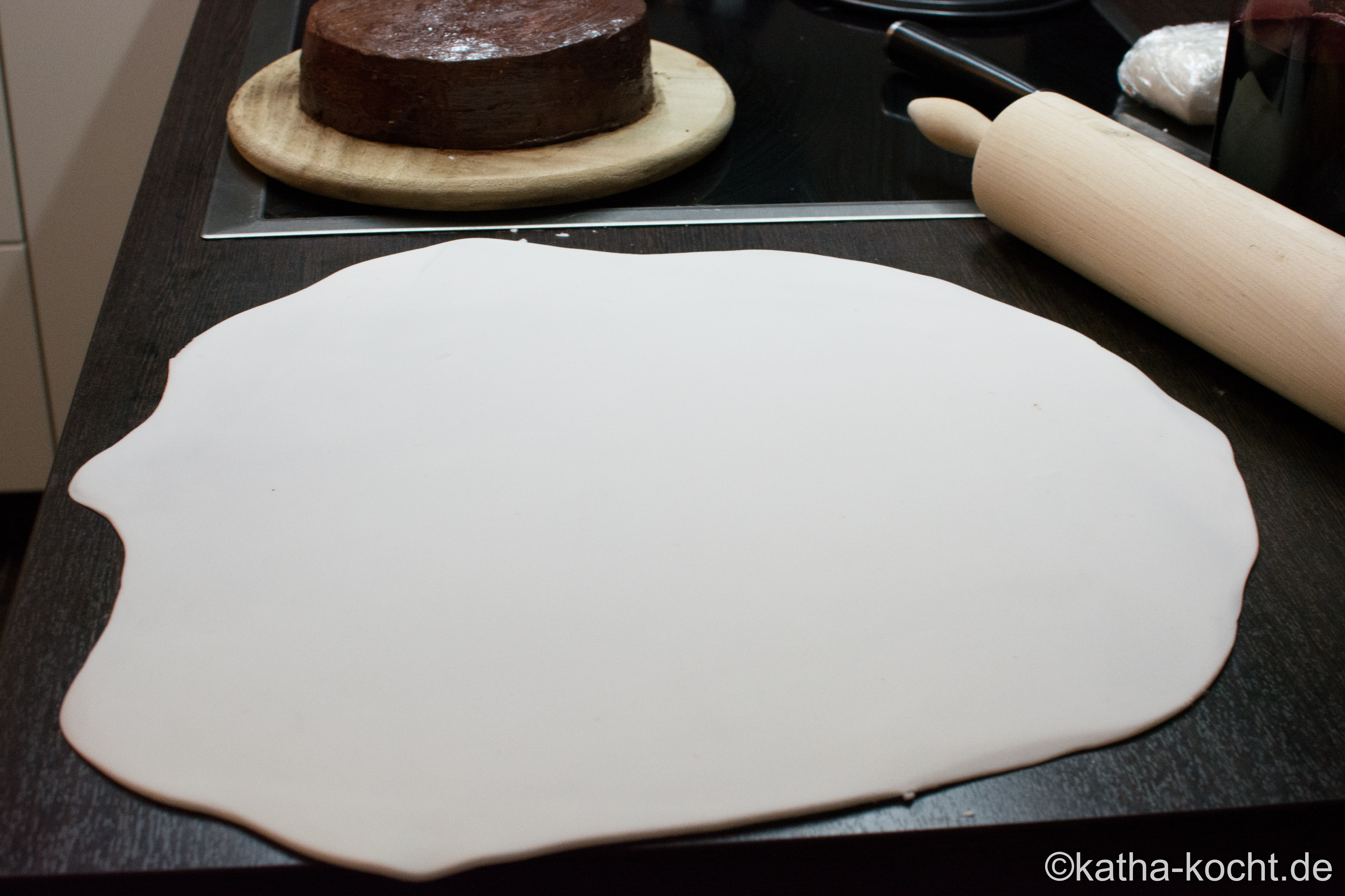 Den Fondant muss man jetzt aber erst weich kneten. Dazu die Arbeitsplatte so gründlich wie ihr könnt abwischen und den Fondant mit Kraft wie einen Hefeteig kneten bis er ein wenig elastischer wird. Im Prinzip genauso wie Knete für Kinder. Die Arbeitsplatte hauchdünn mit Speisestärke bepudern – die Variante von Betty mit einem Perlonstrumpf habe ich nicht probiert, ich habe die Stärke durch ein Zuckersieb gestäubt.