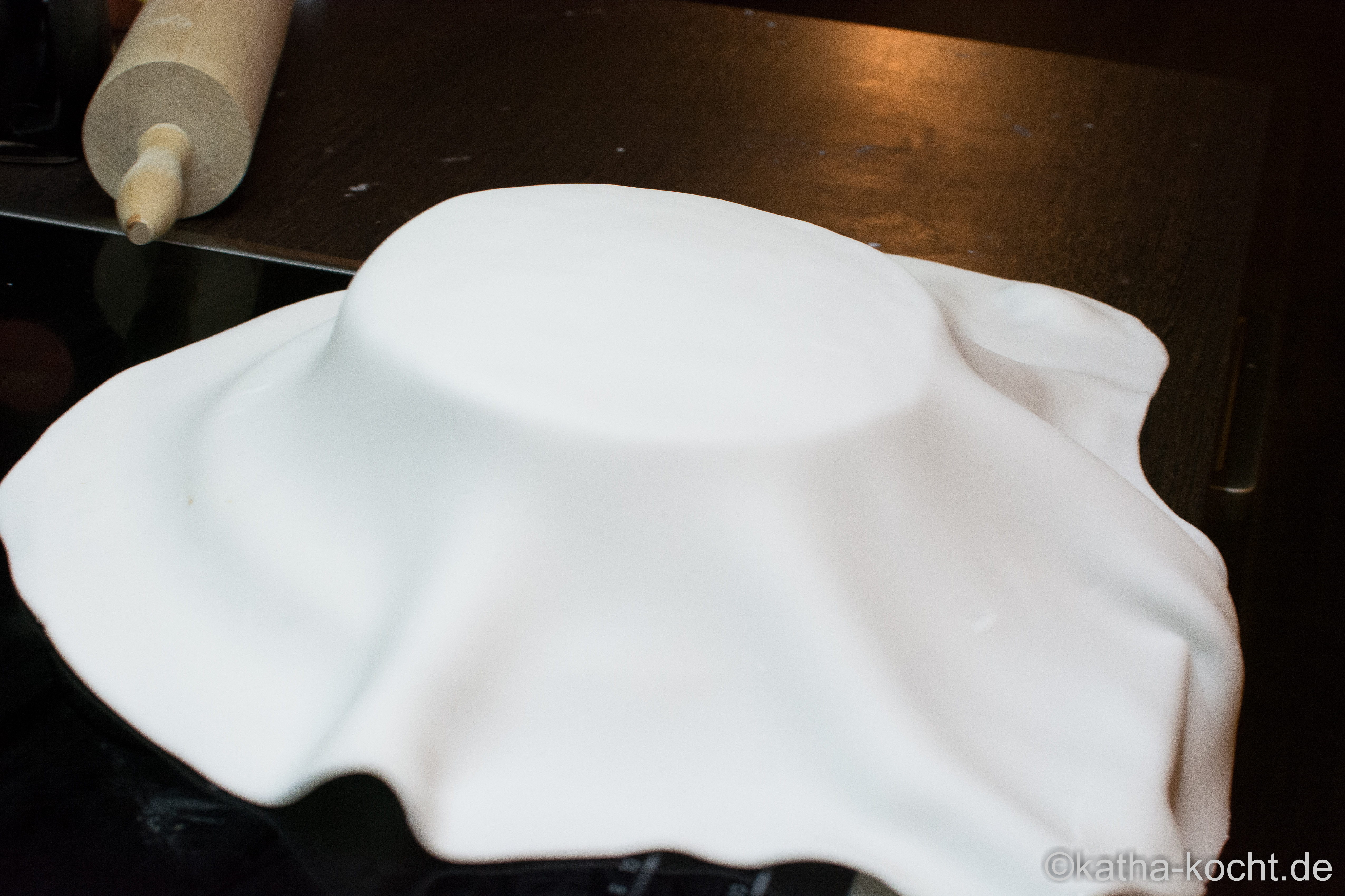 Um die Kanten faltenfrei zu bekommen muss man die Fondantdecke etwas wegziehen (wie eine Zeltwand) und mit der flachen Hand glatt an die Torte streichen. Am Ende bleibt dann eine Falte übrig, das macht man es aber genauso – ein Stück wegziehen und von oben glatt anstreichen.