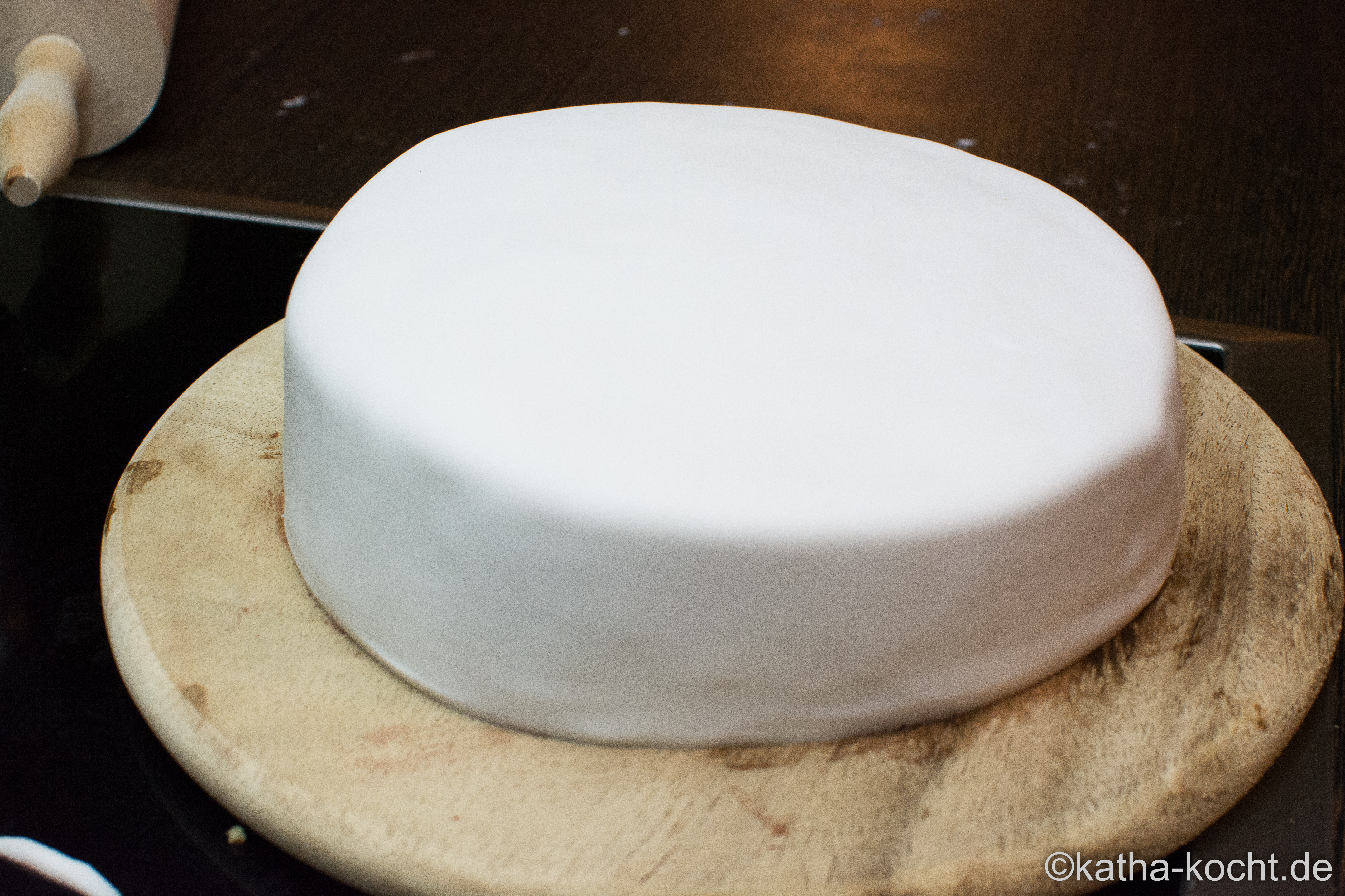 Jetzt den Fondant mit einem Nudelholz dünn und gleichmäßig ausrollen. Das Holz dabei auf der Rolle und nicht an den Griffen anfassen – so wird es gleichmäßiger und den Fondant auf keinen Fall wenden! Was einmal unten ist bleibt auch unten.