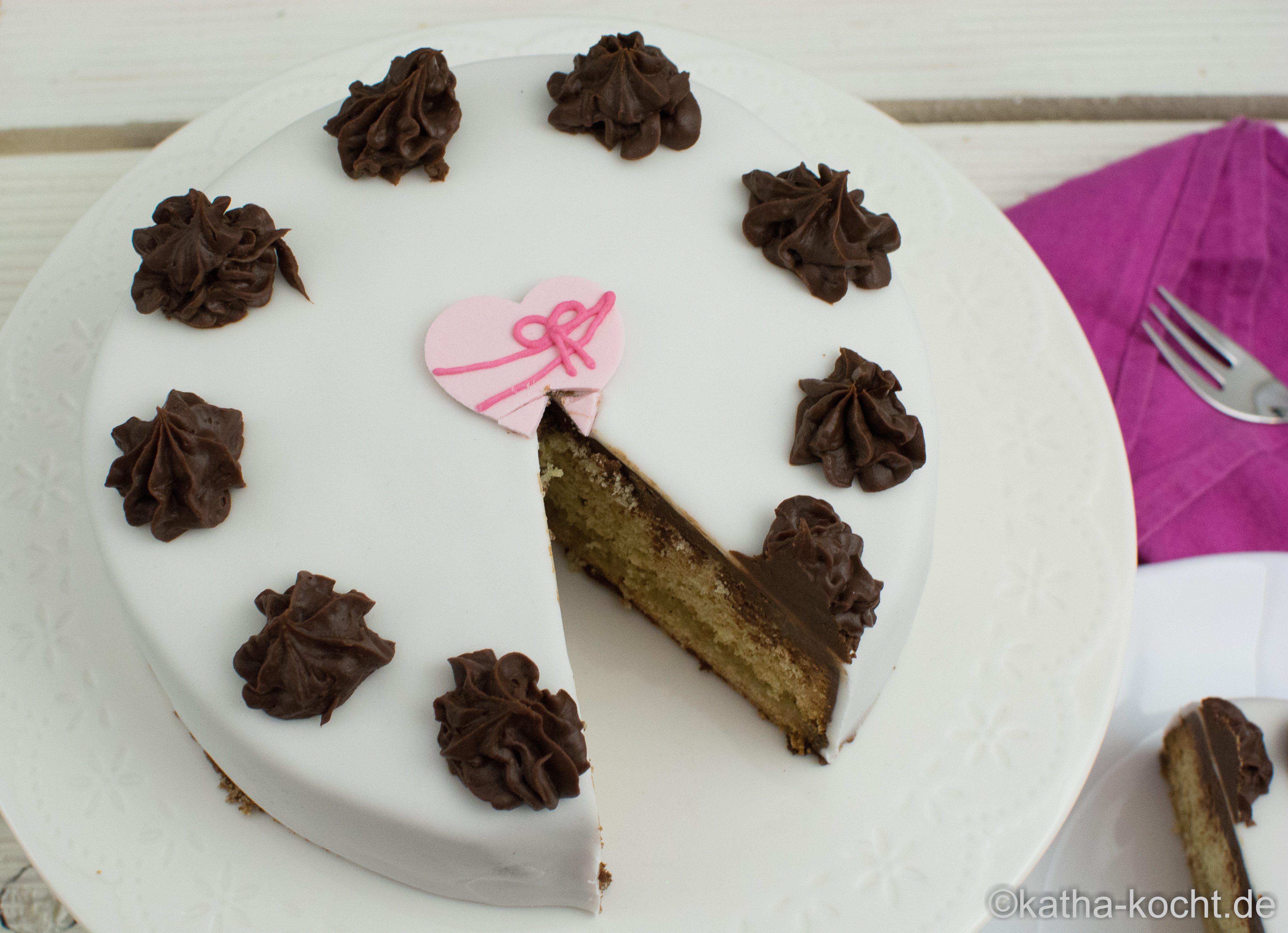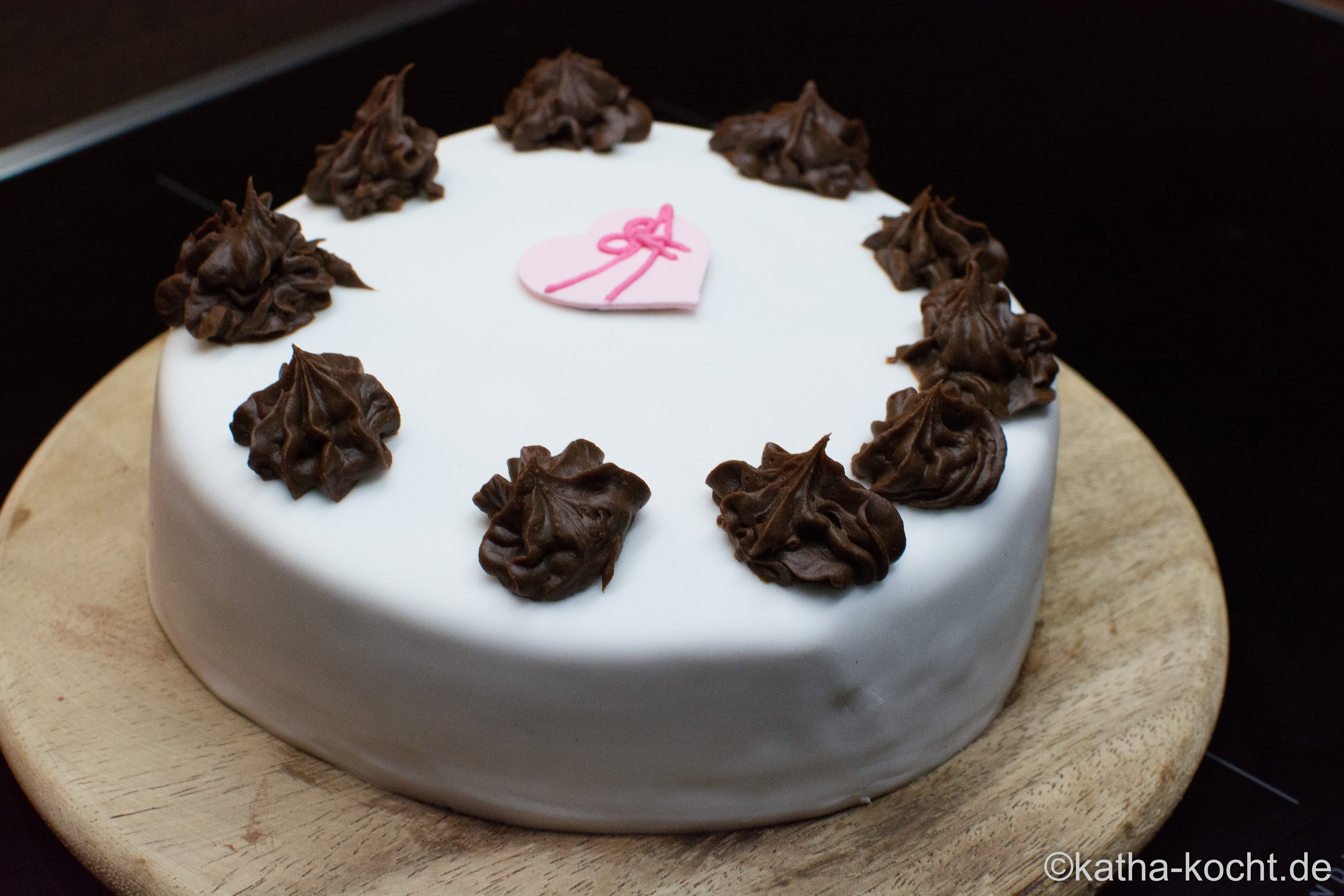 Das mit den Abständen übe ich wohl besser nochmal. Und weil die Mitte so leer aussieht kommt da noch ein Zuckerherz aus der Kramkiste drauf, das lässt sich ganz einfach mit der Ganache festkleben.
