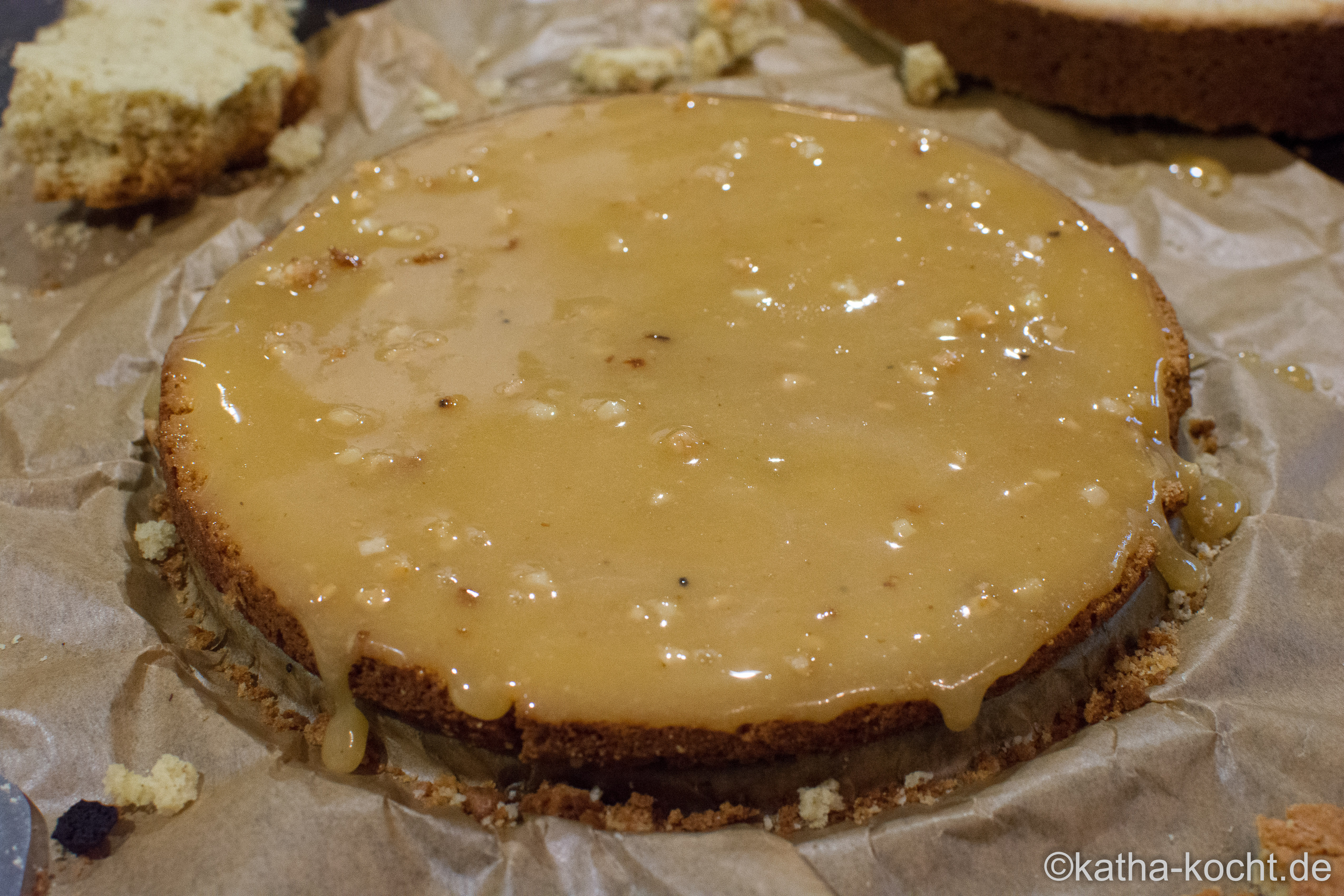 Den Kuchen aus dem Ofen holen und vollständig abkühlen lassen. Die Decke begradigen – ich habe das mit einem Brotmesser und per Augenmaß gemacht – und den Kuchen dann noch mittig halbieren. Zwischen die zwei Kuchenplatten die Honigcreme oder Marmelade streichen und die Torte abgedeckt in den Kühlschrank stellen.