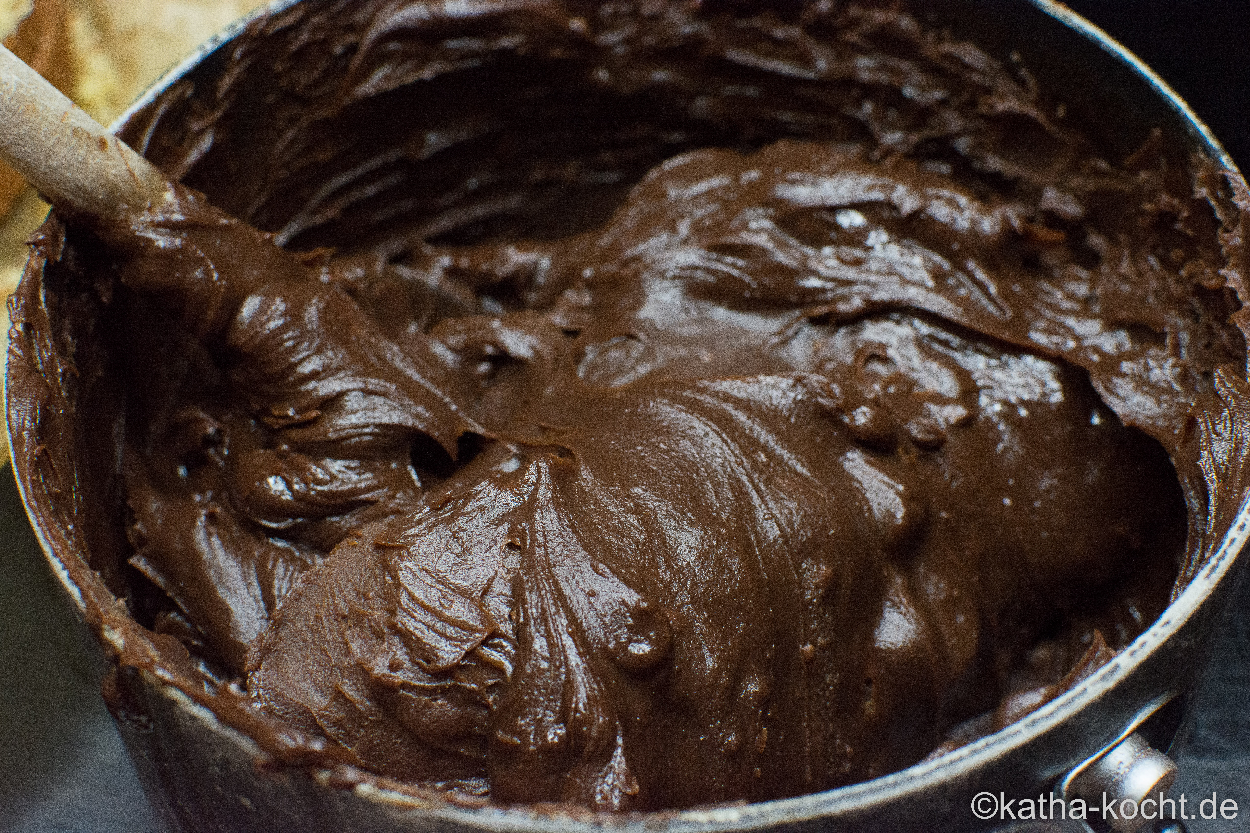 Für die Ganache die Kuvertüre in kleine Stücken brechen und die Sahne in einem kleinen Topf erhitzen bis sie leicht dampft, aber nicht kocht. Die Kuvertüre hinein geben und auf kleinster Stufe und unter Rühren schmelzen lassen. Am Ende die Butter zufügen und die Ganache abkühlen lassen. Wenn sie Raumtemperatur hat kann sie in den Kühlschrank – sie sollte zur Weiterverarbeitung etwas fester als Nutella sein.