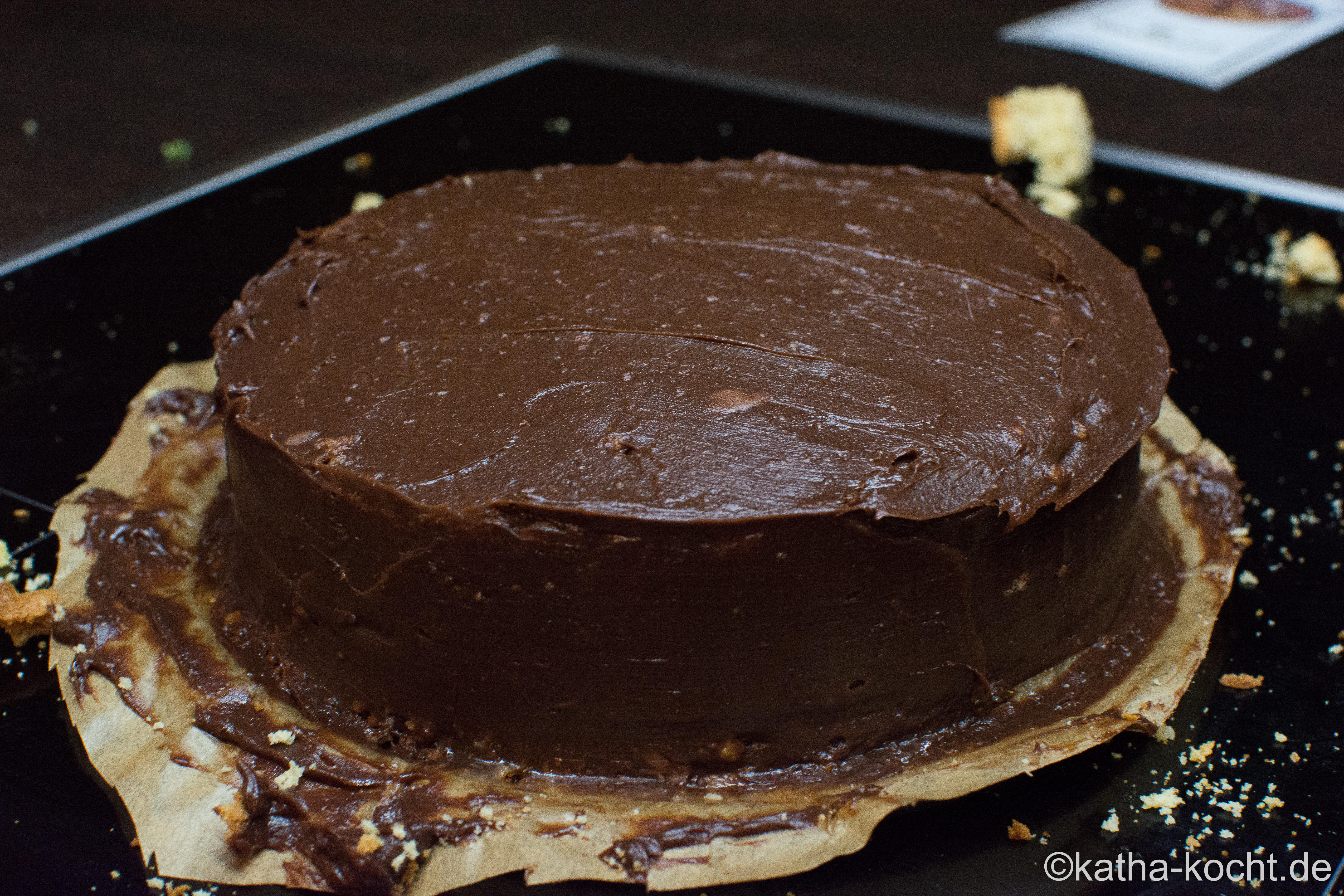 Die erste Schicht Ganache die jetzt auf die Torte kommt ist der Crumble coat und dient dazu die ganzen losen Krümelchen festzukleben. Die Torte rundum einstreichen, wer hat mit einer Palette, bei mir mit einem Saucenspatel. Im Kühlschrank für ein paar Stunden aushärten lassen und dann eine zweite Schicht auftragen mit der ihr die Torte begradigt und Unebenheiten ausgleicht. Diese Schicht muss aber auch noch nicht 100% perfekt sein.