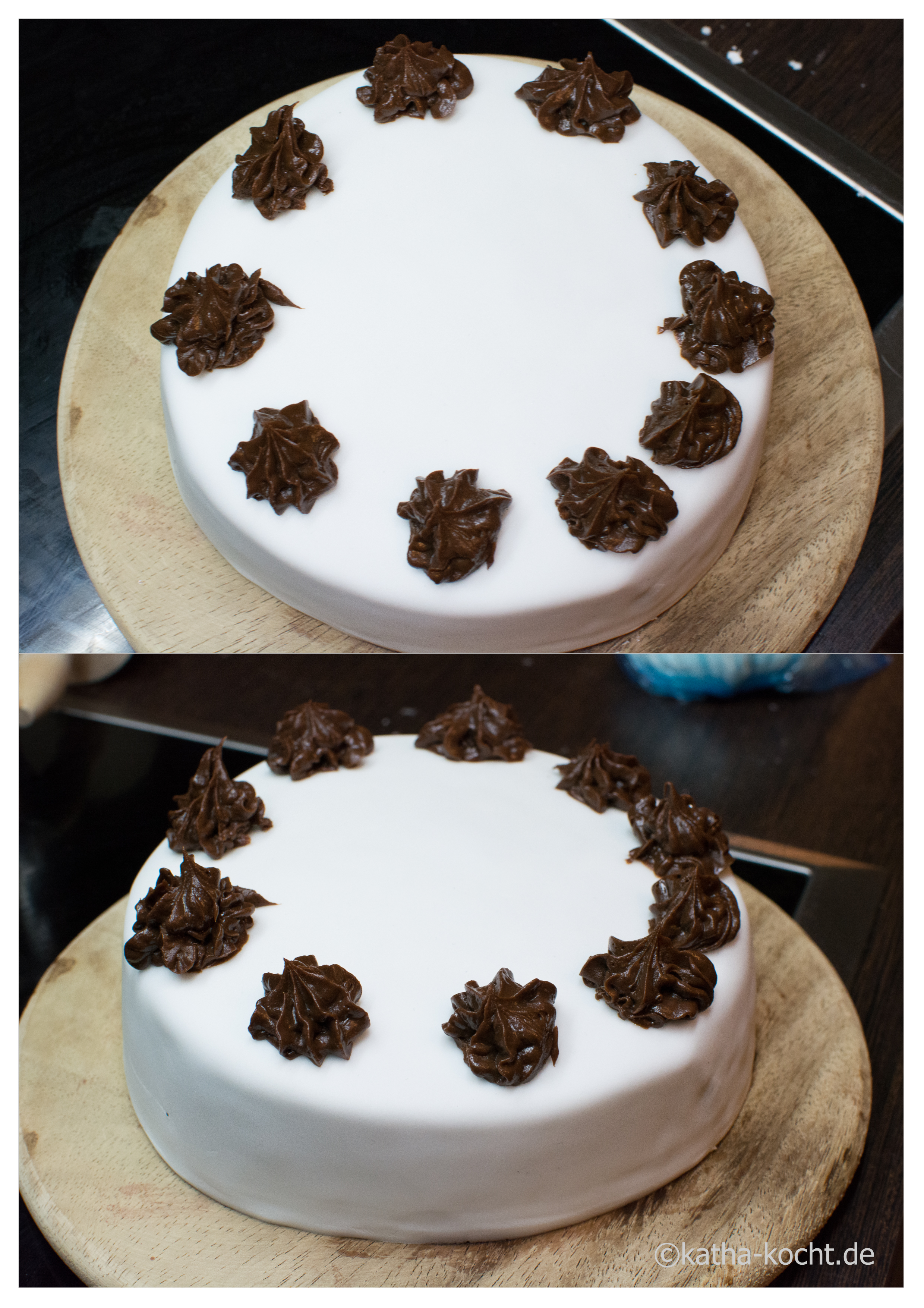 Jetzt gibt es noch zwei Folgen wie man Blumen und Schleifen modelliert. Habe ich mir angeschaut, fand ich toll, aber abgesehen von einem Mangel an Nerv für diese Feinarbeit hatte ich auch das benötigte Pulver um den Fondant modellierbar zu machen nicht im Haus und ich persönlich finde Fondantdeko zwar super, super toll anzusehen – aber zum essen einfach zu süß. Da ich noch Reste von der Ganache habe entscheide ich mich also an dieser Stelle für die Spritztülle. Die Ganache im Topf ein ganz klein wenig erwärmen damit sie wieder cremig wird und auf die Fondanttorte spritzen.