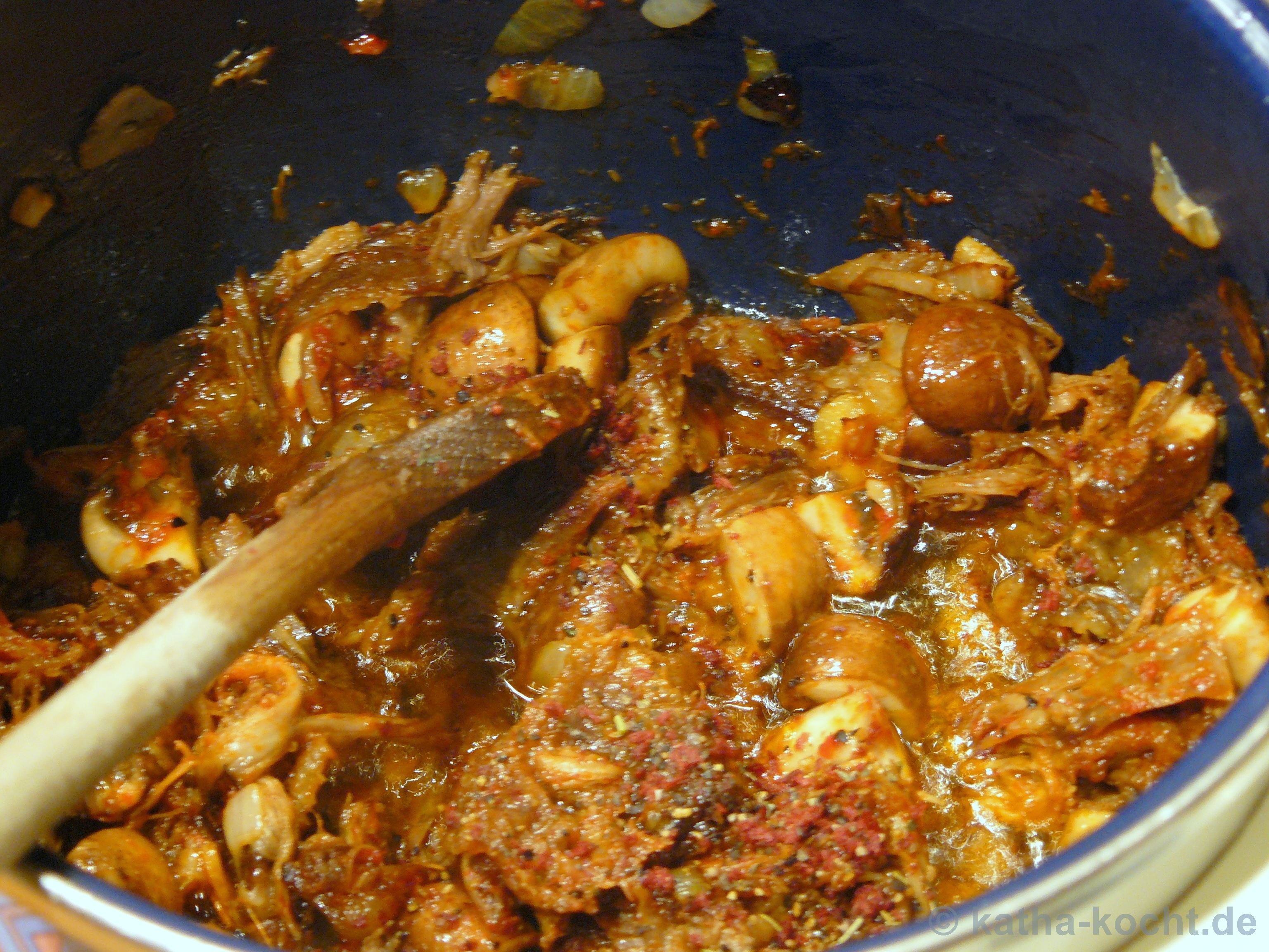 Als nächstes kommen die (aufgetauten) Reste vom Gänsebraten in den Topf. Kurz umrühren und das Olivenöl, Tomatenmark, Paprikamark, die getrockneten Kräuter und den Zitronensaft dazu geben.