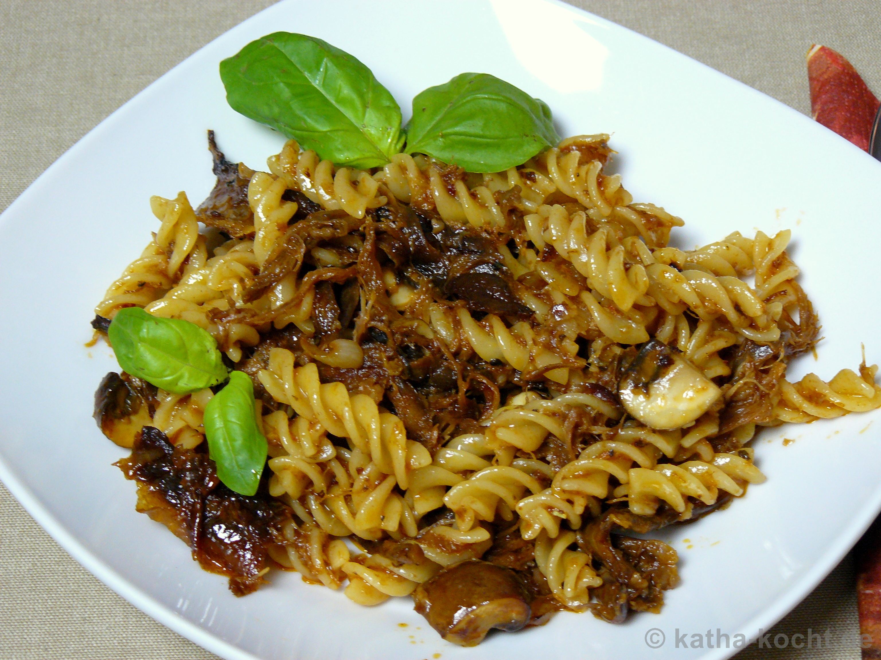 Ich koche die Spirelli in einem ausreichend großen Topf mit Salzwasser bis sie al dente sind. In dieser Zeit werden Zwiebel und Knoblauch fein gewürfelt und mit etwas Olivenöl angebraten bis die Zwiebeln glasig werden. Dann kommen die geviertelten Champignons dazu. Mit Pfeffer und Salz würzen.