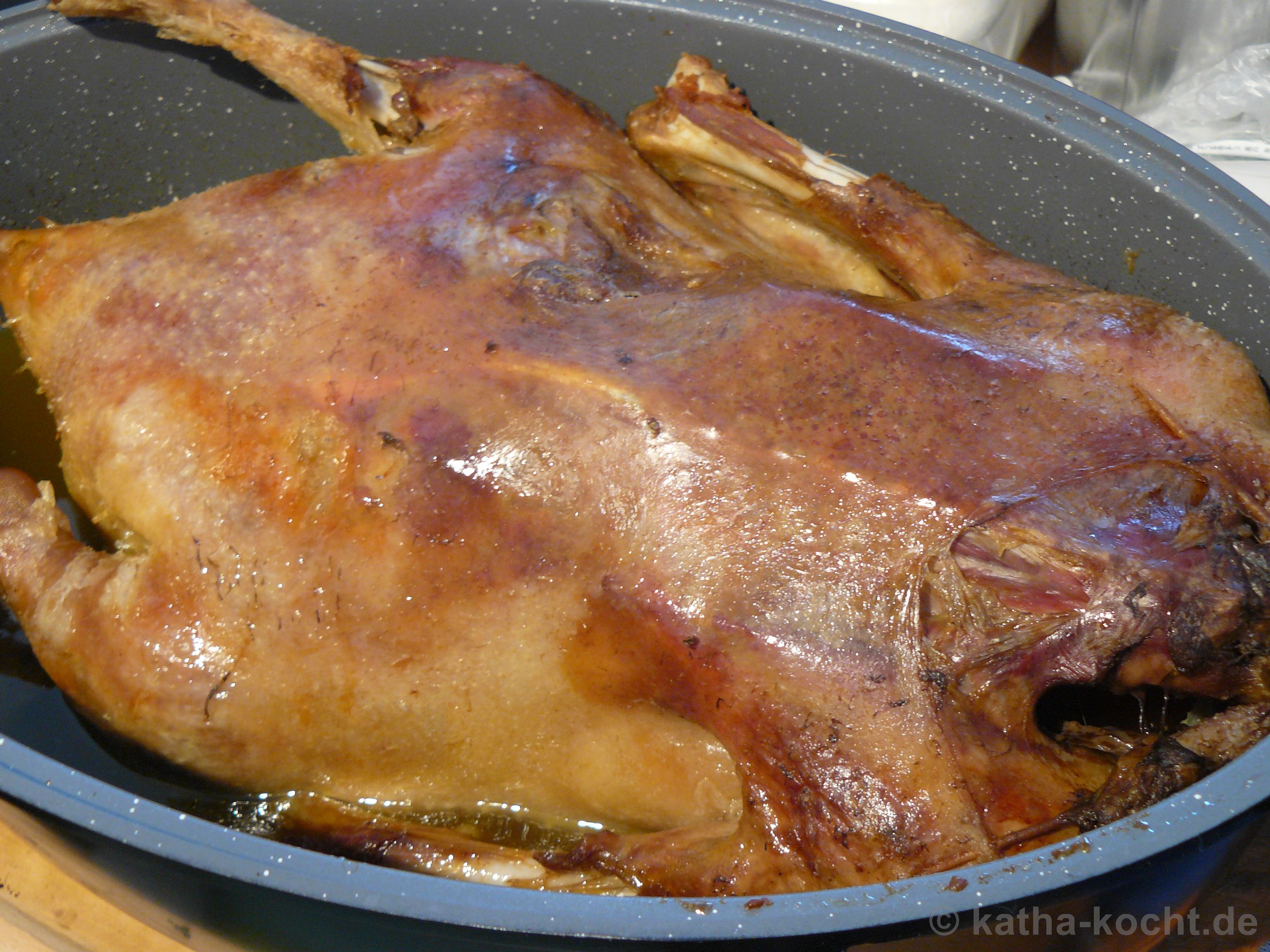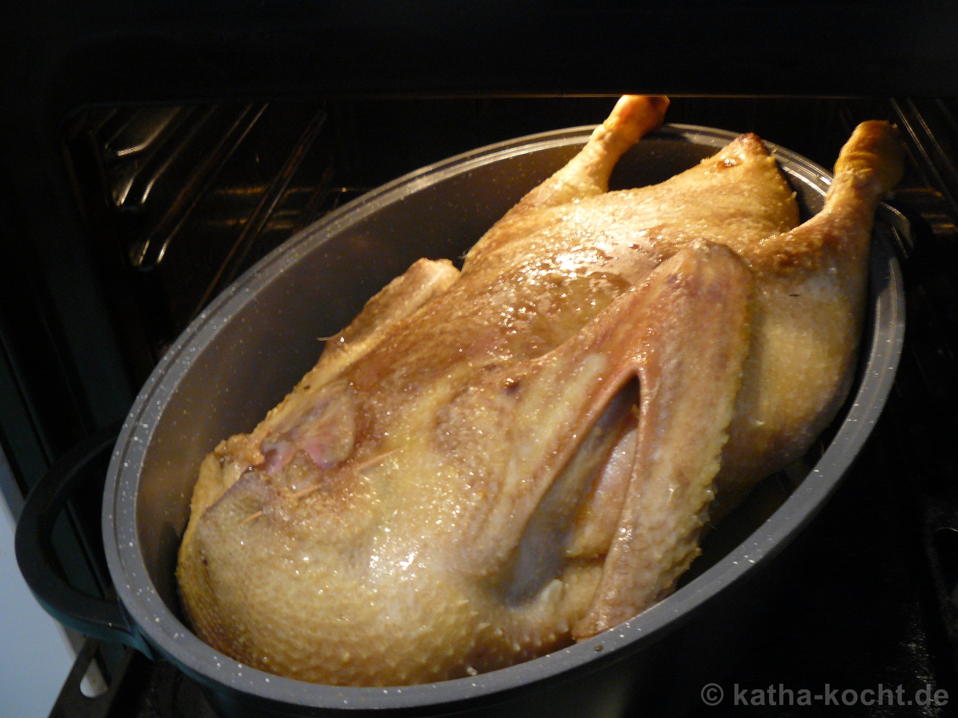 Zwischendurch immer nach der Gans schauen, bei Bedarf Fett abschöpfen oder die Gans mit Fett übergießen. Einmal pro Stunde sollte die Gans umgedreht werden.
