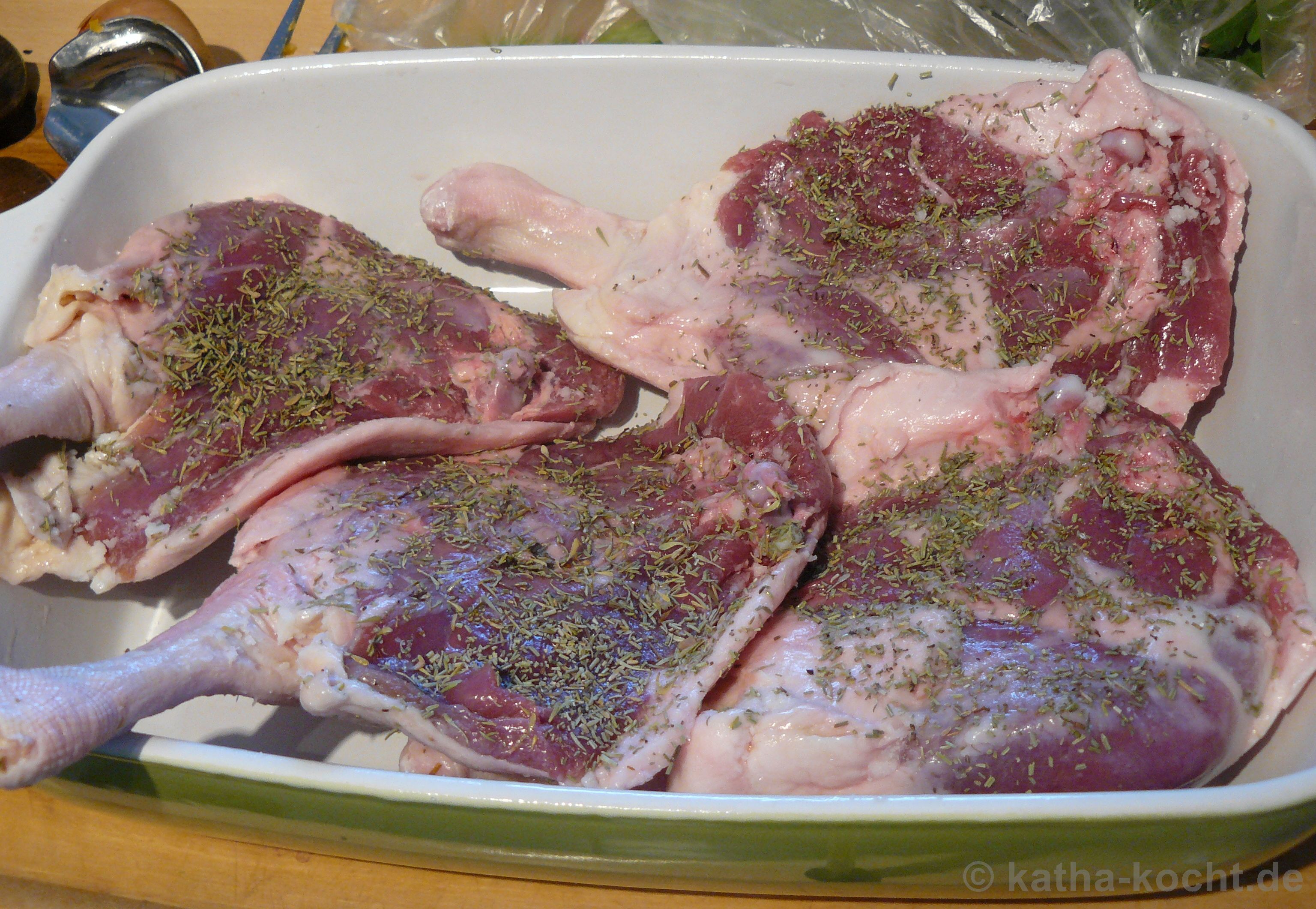 90 Minuten vor Ende die zusätzlichen Gänseteile zubereiten. Die Brust und die Keulen von allen Seiten salzen. Die Fleischseite jeweils mit Thymian würzen. Die Gans im Ofen nach unten stellen und die Gänseteile in einer Auflaufform nach oben stellen. 1-2 Tassen Wasser in die Auflaufform geben.