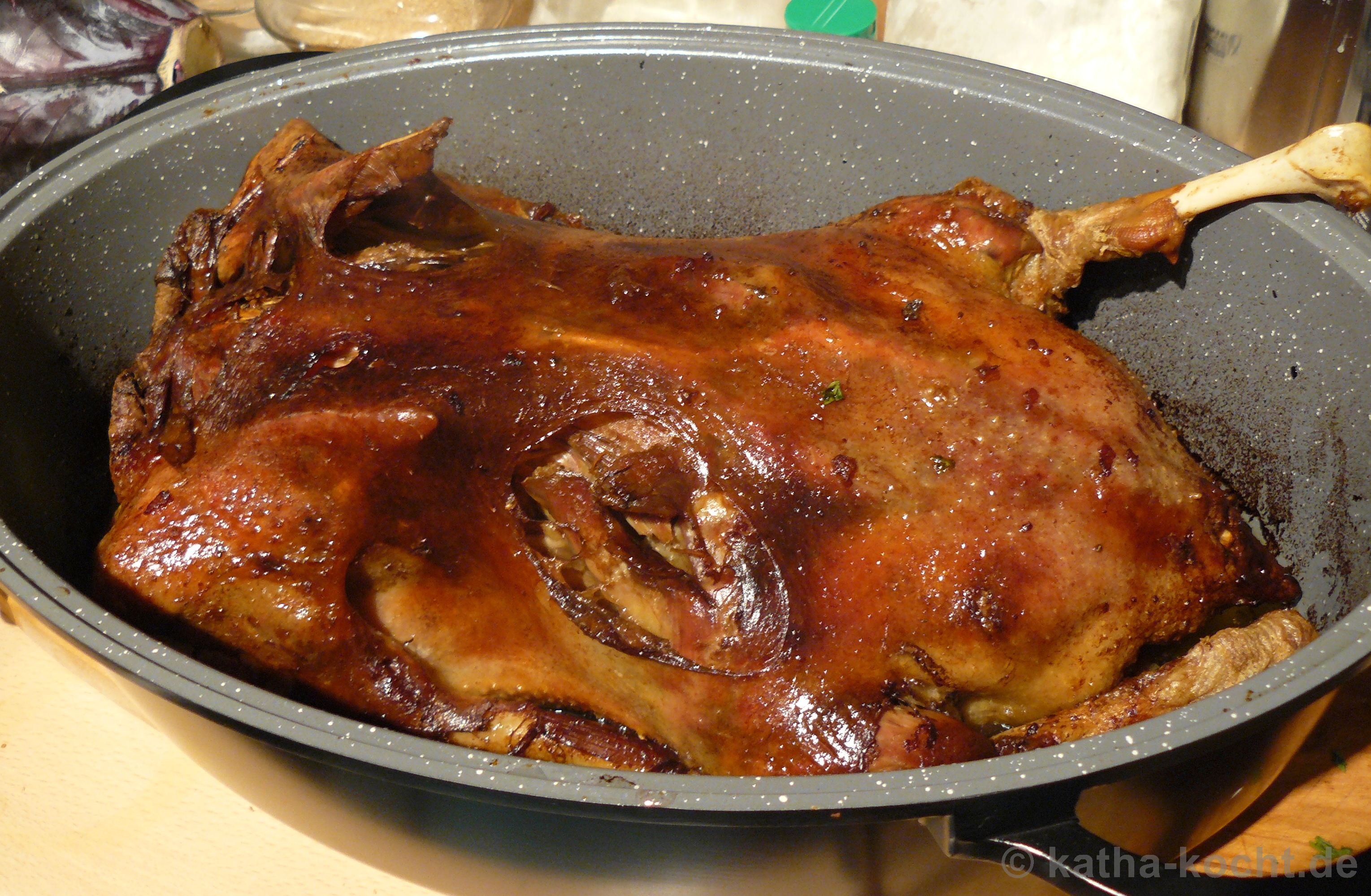 Grundsätzlich kann man sagen, dass eine „ganze Gans“ etwas weniger Zuwendung braucht als später die einzelnen Teile. Mit gelegentlichem Wenden (ca. 1x pro Stunde) und regelmäßigem, aber nicht zu häufigem Übergießen mit Bratenfett ist so eine Gans absolut zufrieden.