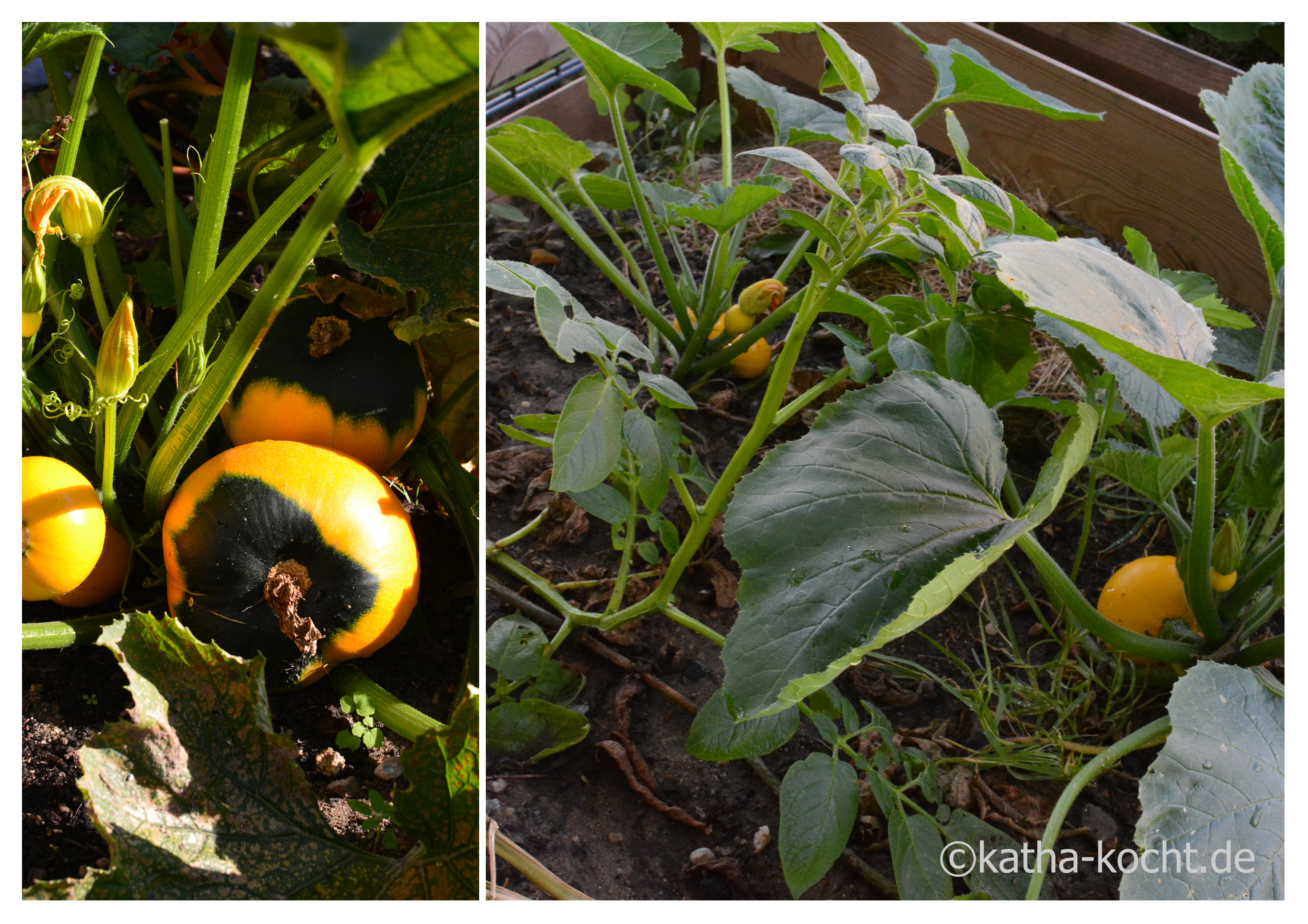 Bei mir wächst der Kürbis leider nicht ordentlich, liegt aber vermutlich am Kasten. In der „freien Wildbahn“ gefällt es denen sicherlich besser. Ich hab massig Blüten, aber die kleinen Kürbis leben nicht lange. Vielleicht auch einfach zu heiß gewesen. Ich gieße zwar ständig, aber im Kasten trocknet es dann doch schnell wieder…
