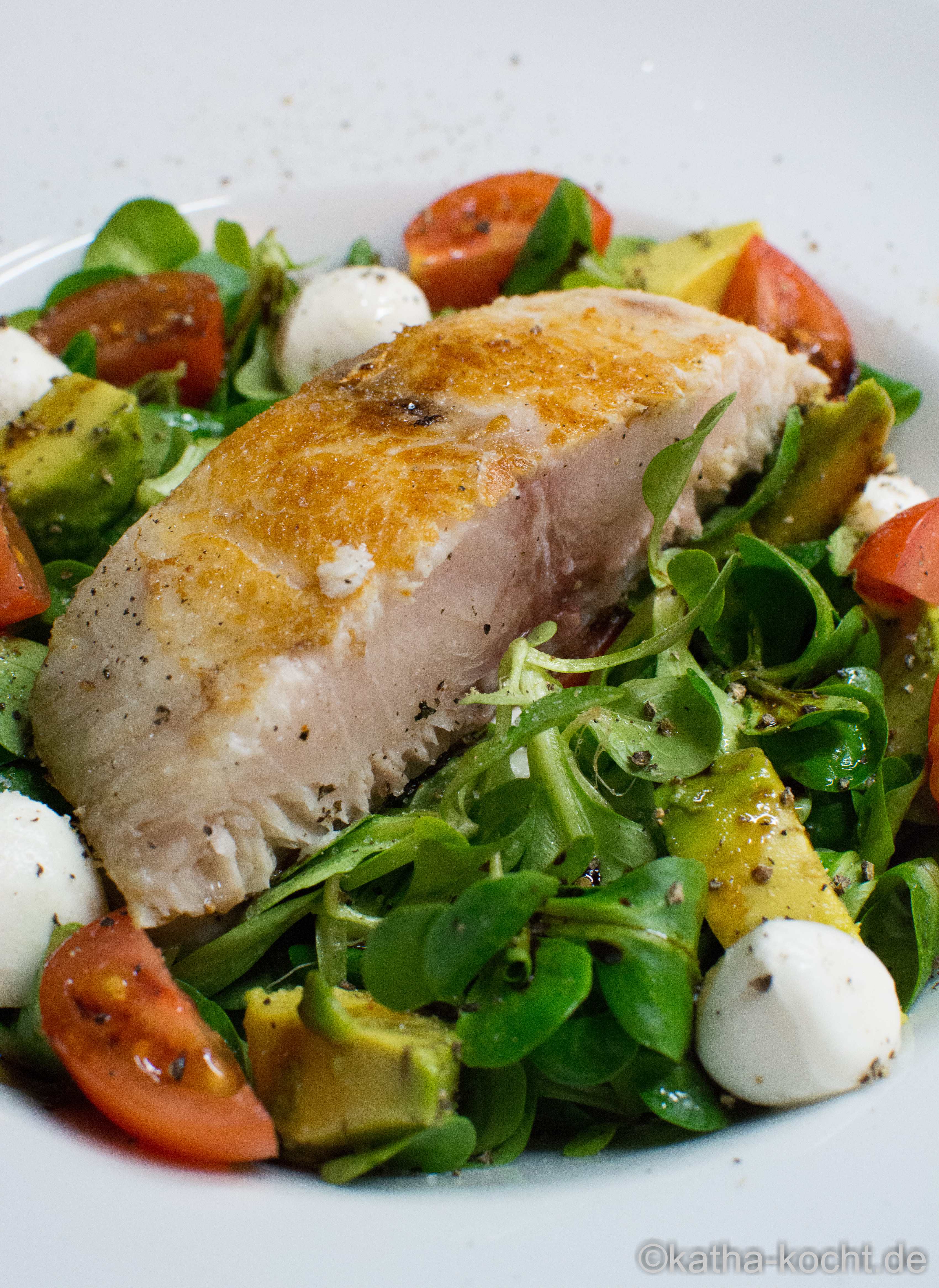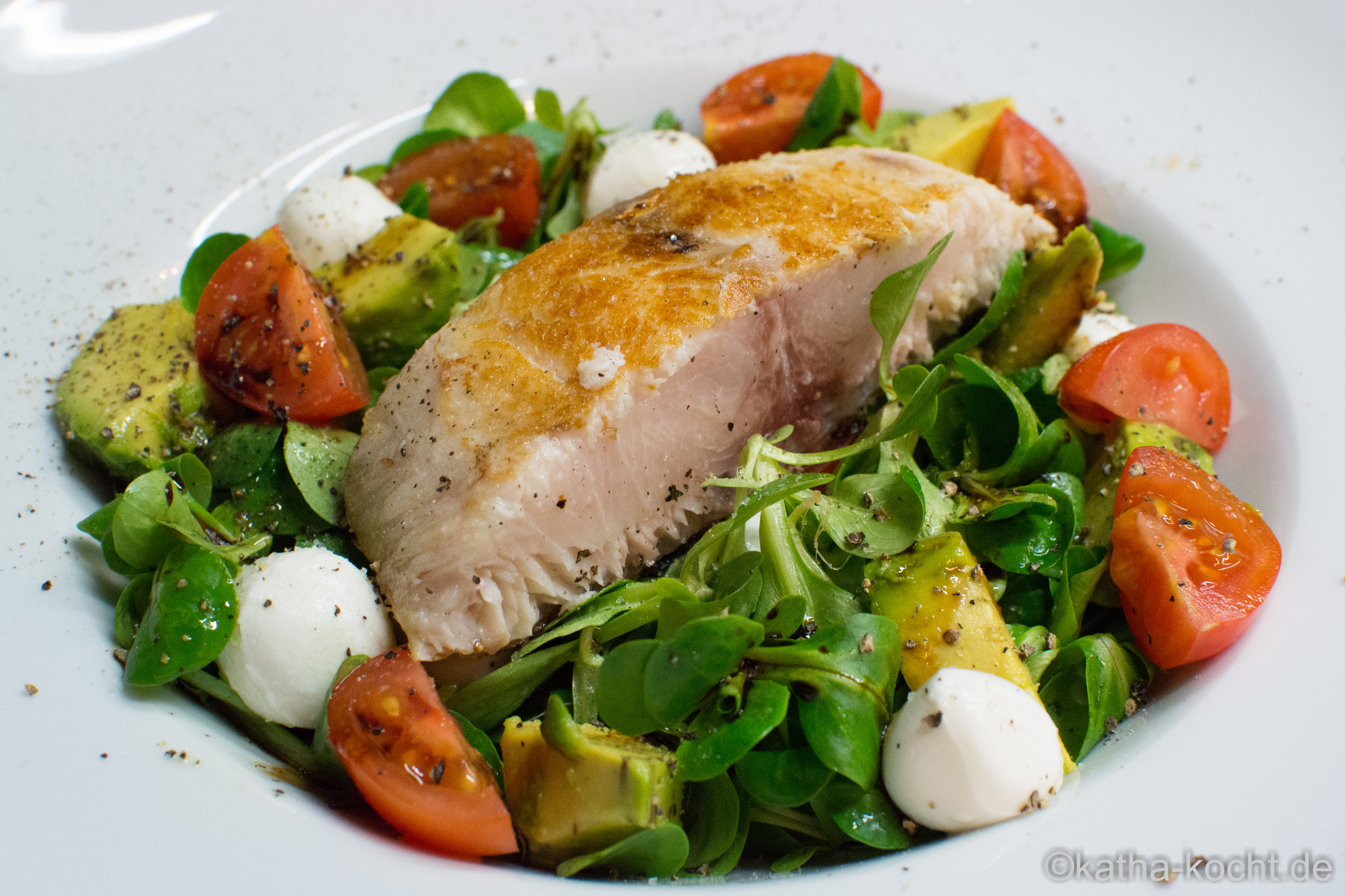 Vor ein paar Tagen habe ich euch mein Rezept für gebratenen Cobia auf Brokkoli-Reis gezeigt und auch eine gebeizte Variante mit Chili und Ingwer gab es schon – heute gibt es ein ganz leichtes und schnelles Abendessen, ich habe den Fisch gebraten und auf einem bunten Salat mit Avocado, Mozzarella und Tomate serviert. Da der Cobia ja auch als schwarzer Lachs bezeichnet wird und in seiner Konsistenz wunderbar fest ist hat das super gepasst. Ich habe ihn auf der Haut gebraten und dann am Ende nur kurz gewendet – mir schmeckt er so wirklich großartig, das Stück für Bessere Hälfte habe ich allerdings nochmal 3-4 Minuten in die Pfanne gelegt. Falls ihr also eine Idee für euren Cobia sucht – diesen Salat kann ich euch nur empfehlen!