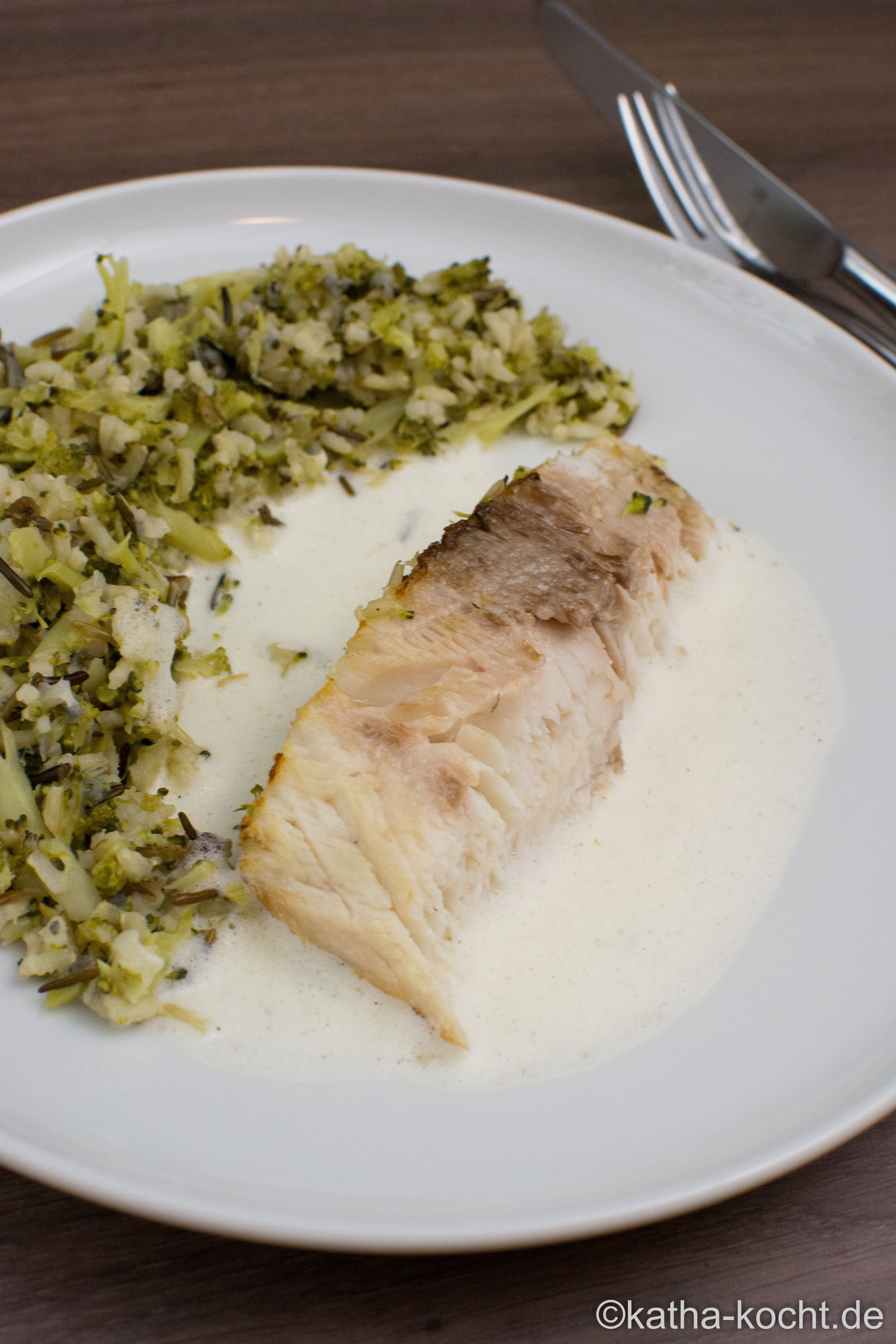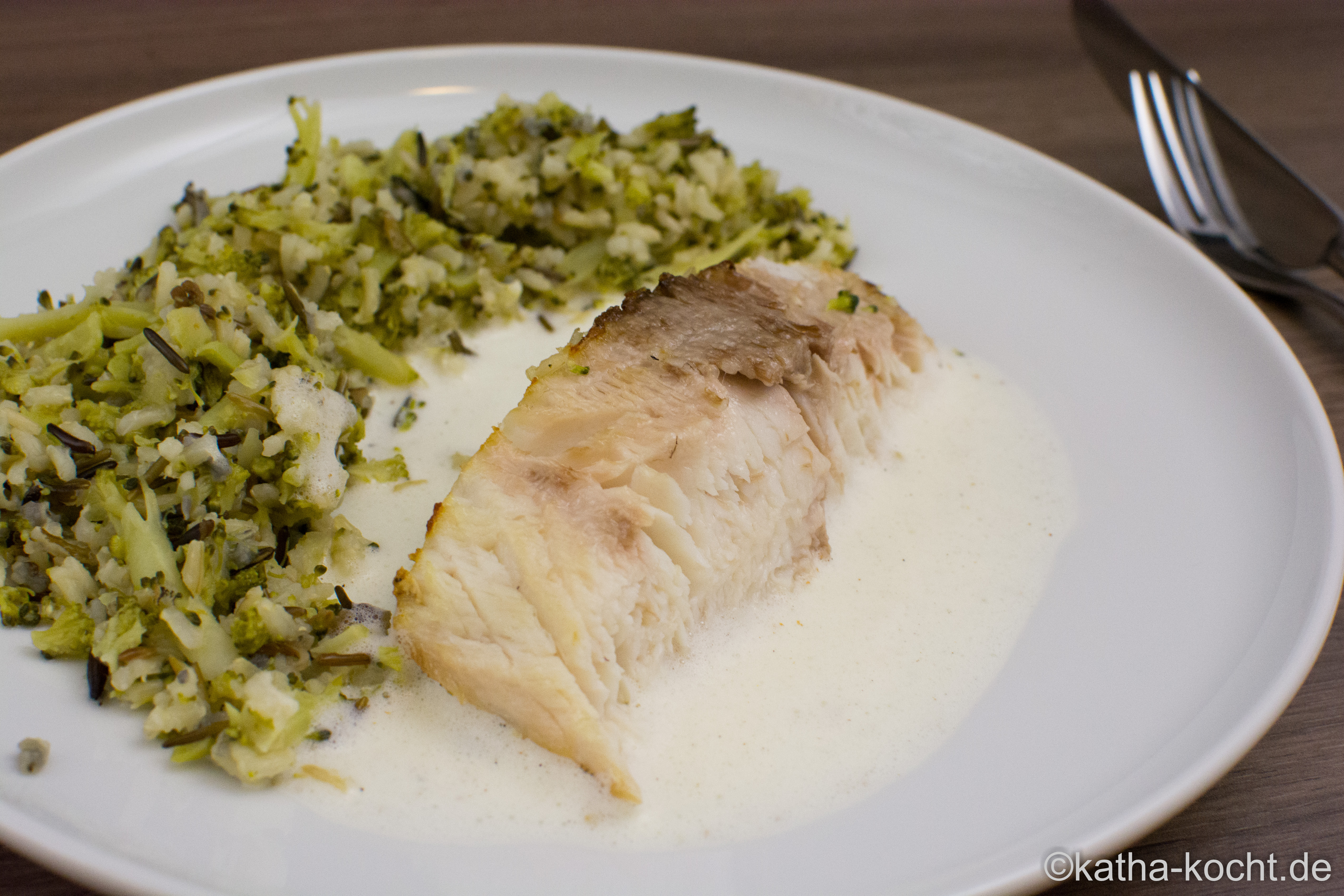 Den Brokkoli-Reis auf zwei Teller verteilen und den Fisch daneben platzieren. Etwas Sauce dazu geben und das ganze sofort servieren.