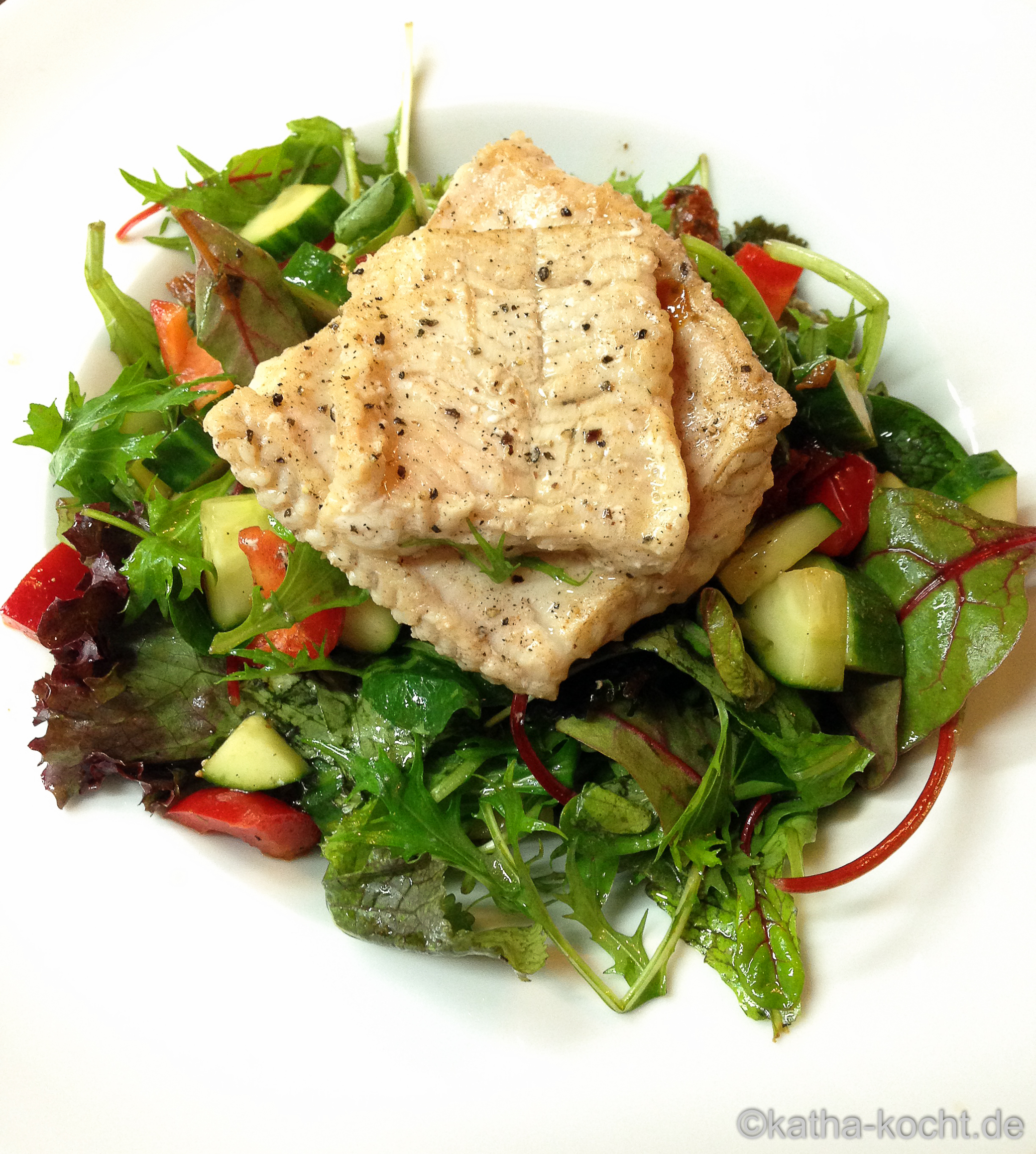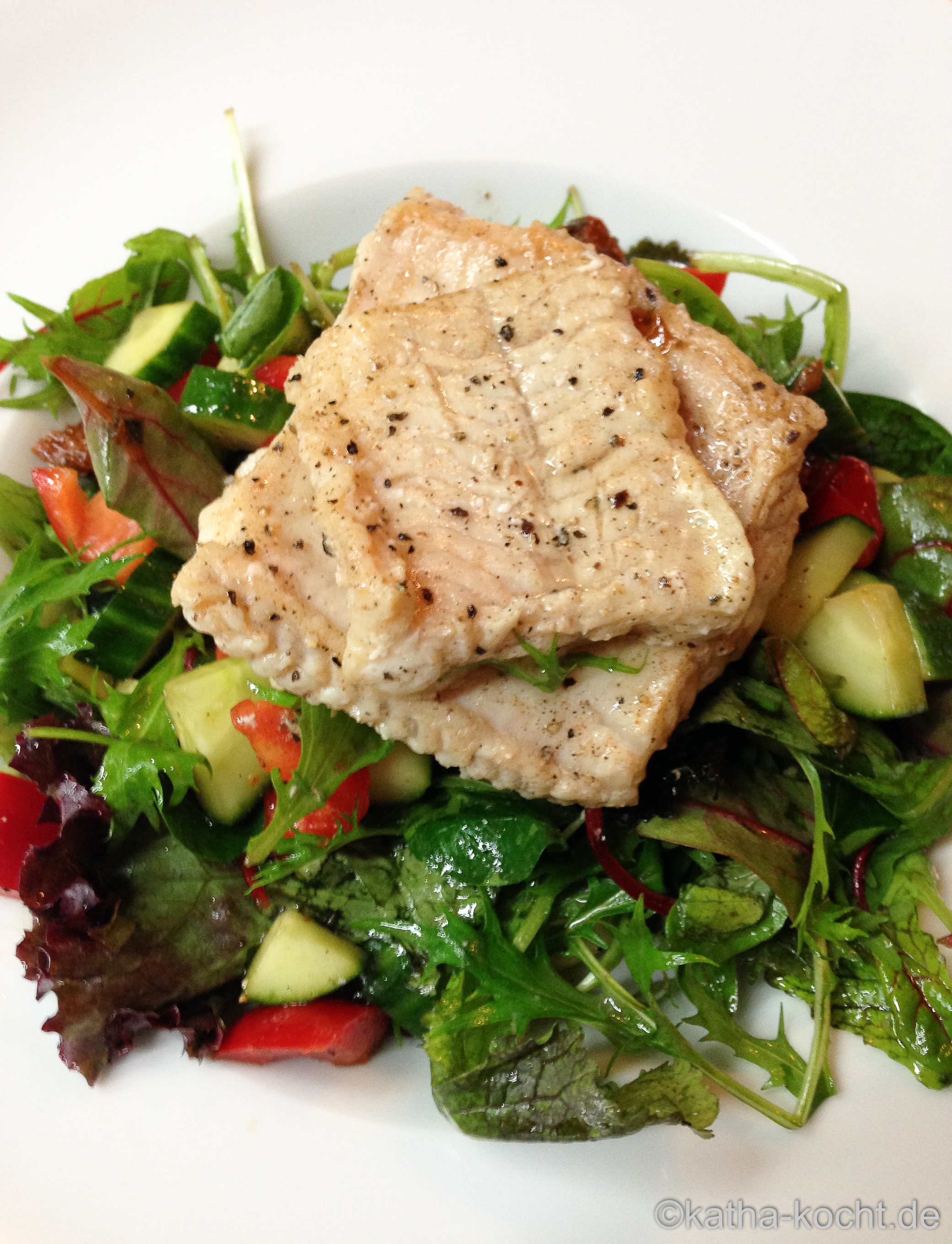 Fisch auf Salat ist nicht nur ein schnelles und einfaches Abendessen, es ist auch frisch und leicht. Perfekt für die guten Vorsätze, die man sich natürlich überhaupt nicht erst gesetzt hat, die aber trotzdem irgendwo im Hinterkopf lauern und darauf warten sich im passenden Moment vorwurfsvoll neben der Wage zu platzieren. Die guten Vorsätze dürfen mich mal ganz doll lieb haben, aber auf den Steinbeißer auf buntem Salat freue ich mich trotzdem – der ist nämlich ziemlich lecker! Und weil der Salat so schön grün ist wird er nach dem Smoothie mit Avocado, dem Duo vom Tartar und der Wirsing-Käse Suppe mein viertes Rezept für meine persönliche Grüne Woche 2016.