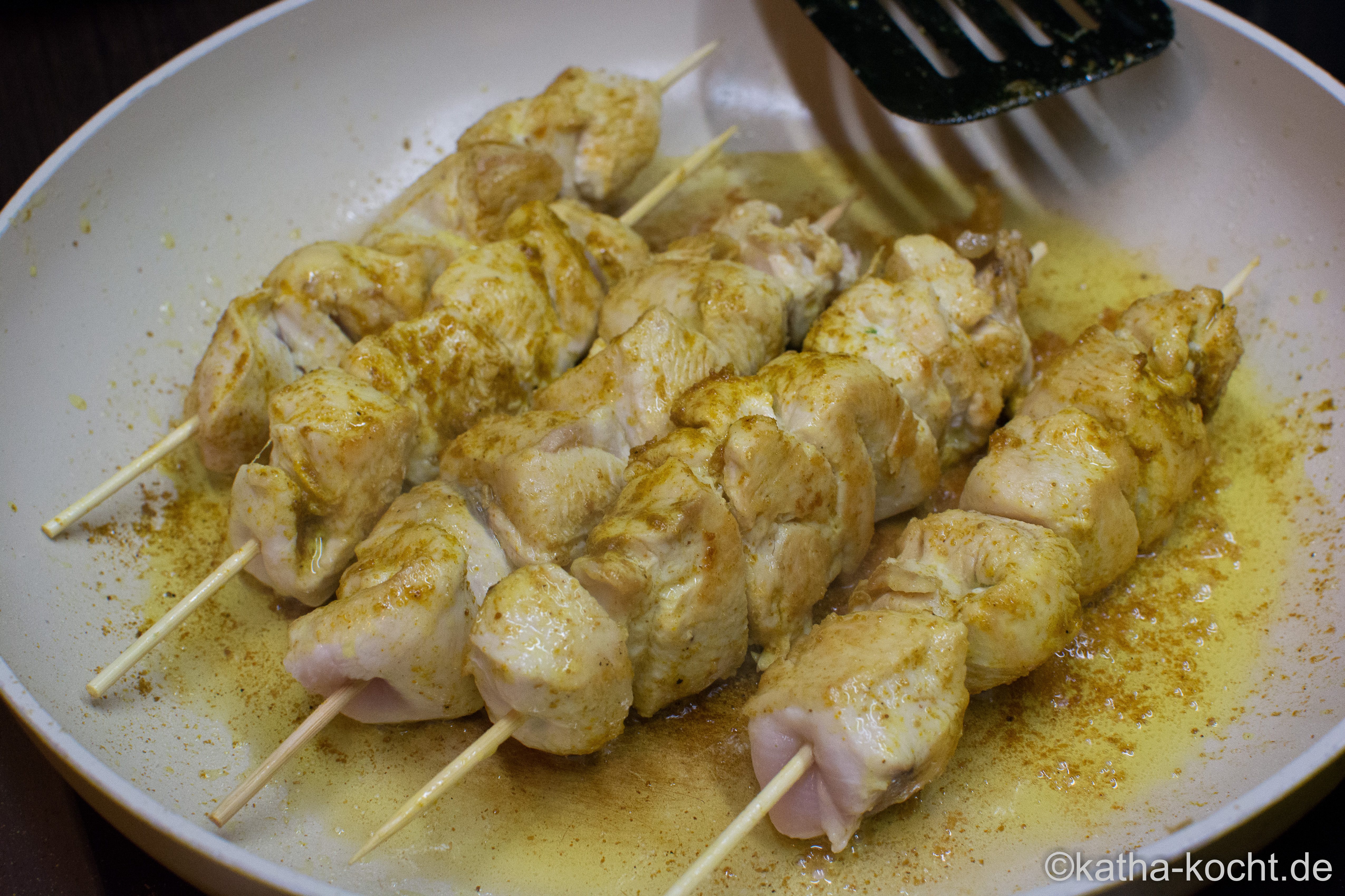 Die Hähnchenbrustfilets in Würfel schneiden und auf lange Holzspieße stecken. Das Öl mit dem marokkanischen Hähnchengewürz und Salz verrühren und die Spieße damit einpinseln. Eine große Pfanne erhitzen und die Spieße hinein legen. Rundum braten bis sie gar sind. Bei mir dauert das so in etwa 8-10 Minuten.