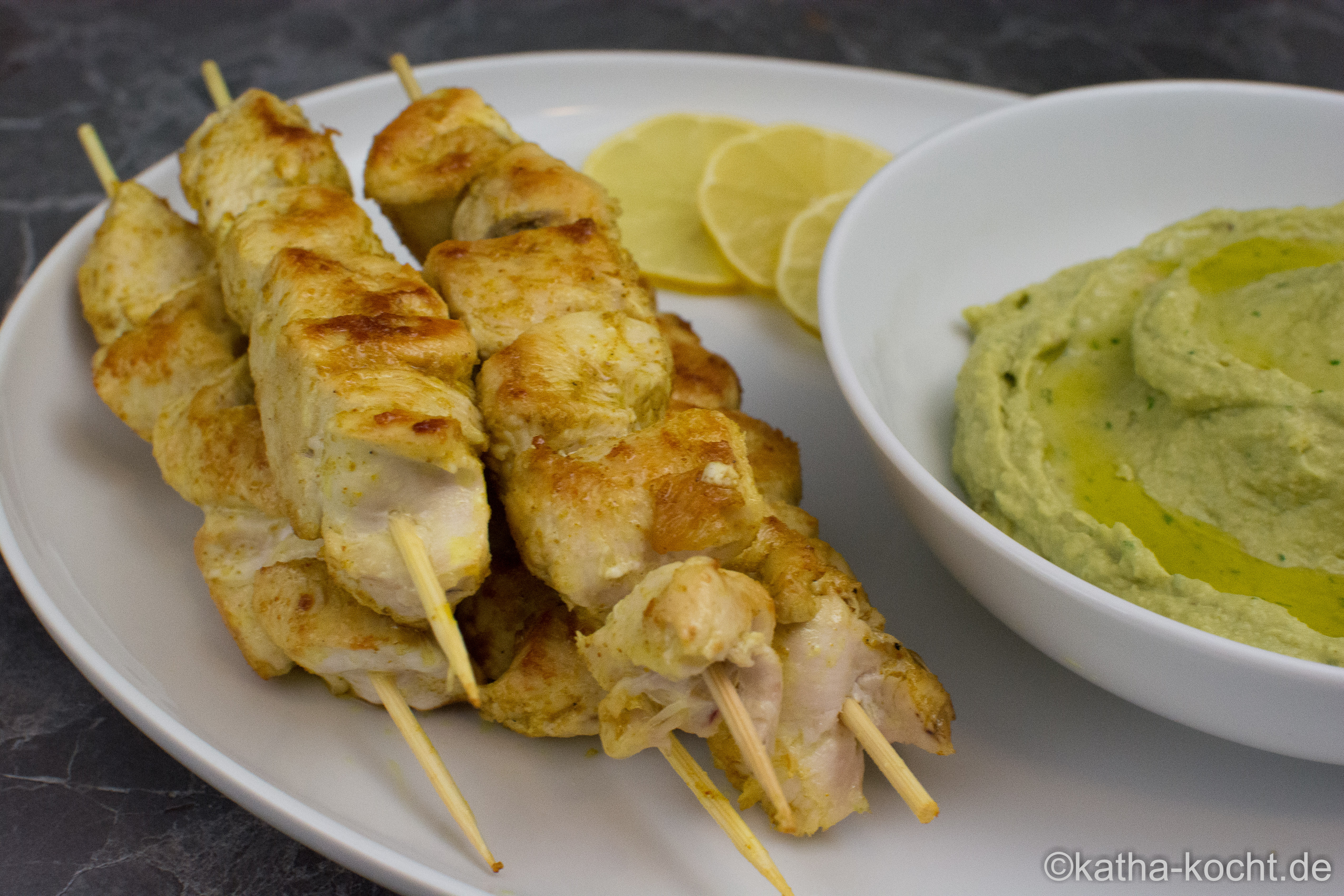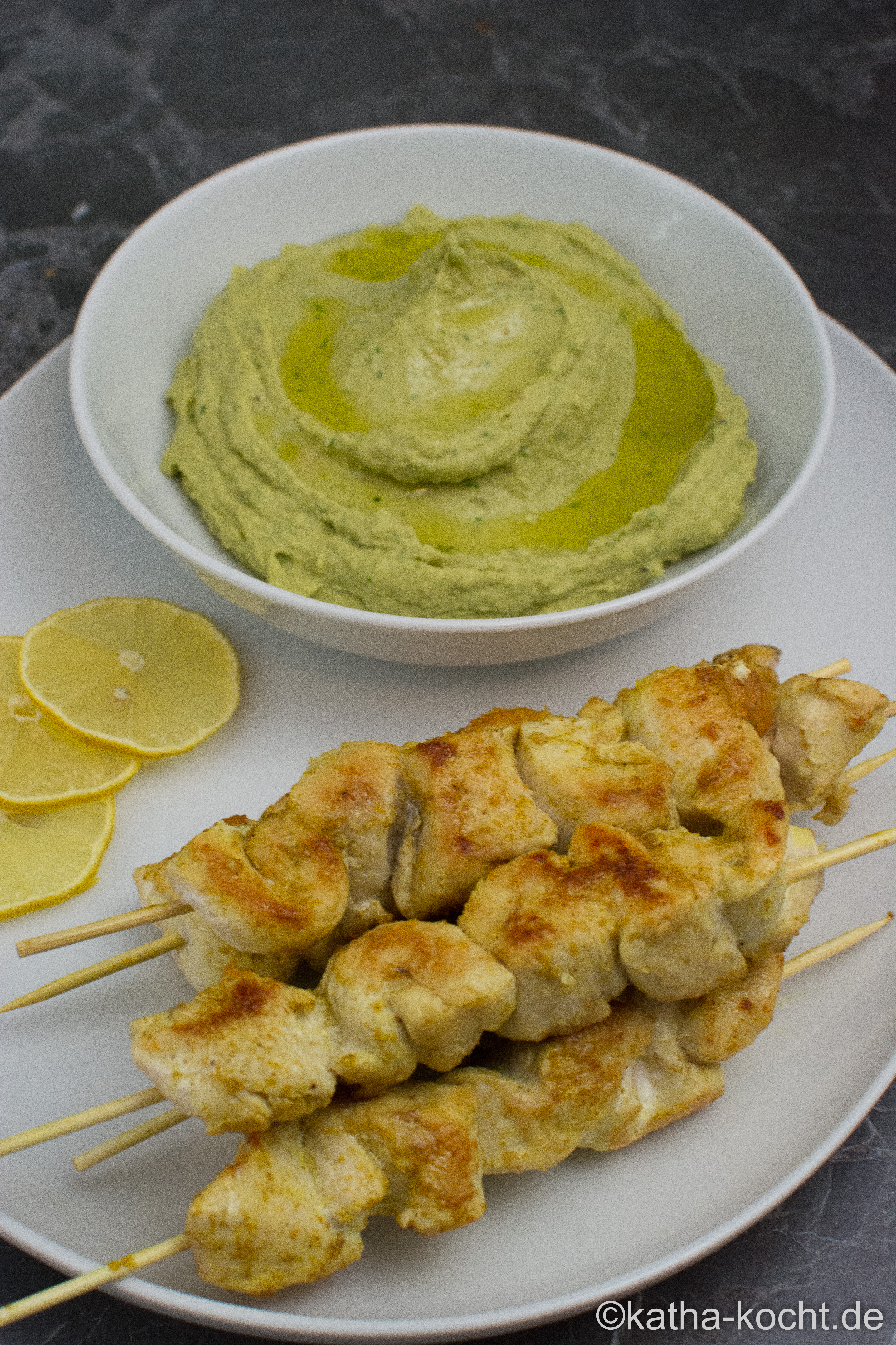 Aber zurück zum Rezept – egal ob ihr die Kichererbsen kocht oder welche aus der Dose nehmt, dieser Hummus wird einfach super lecker. Eigentlich ist es ja kein richtiger Hummus – stellt euch vor, ihr hättet Hummus und Guacamole gemischt! Klingt lecker? Ist es auch, versprochen! Dazu passen wunderbar ein paar Hähnchenspieße und schon haben wir ein Abendessen in das ich mich reinlegen könnte… und das nebenbei auch ganz wunderbar zu meiner grünen Woche hier auf dem Blog passt.