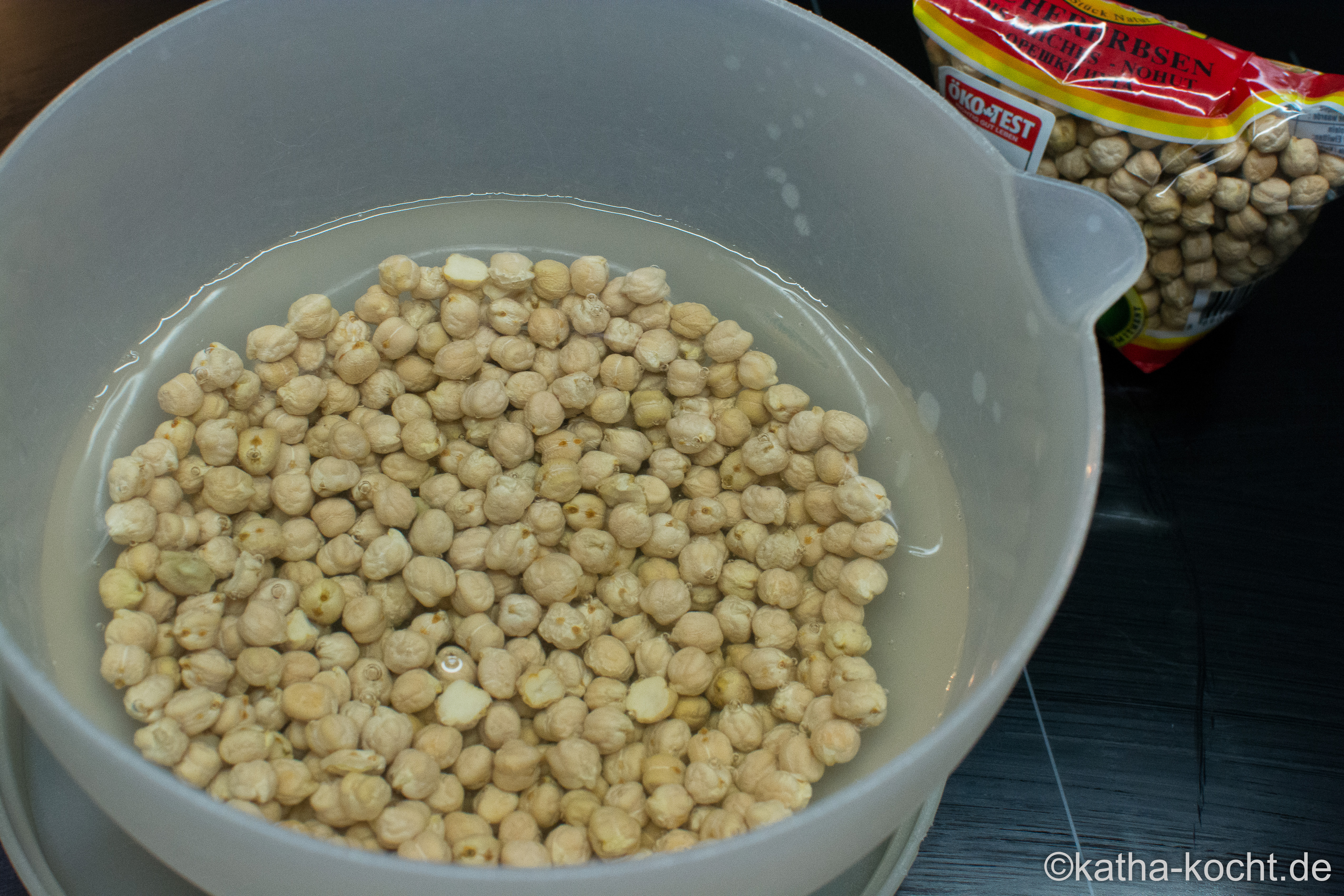 Die Kichererbsen 24 Stunden in ausreichend Wasser einweichen und quellen lassen. Gut ausspülen und in einen Topf mit kaltem Wasser geben. Aufkochen und 2-2,5 Stunden köcheln lassen. Dabei ab und an umrühren. Wenn die Kichererbsen sehr weich sind abgießen und nochmal gründlich abspülen.